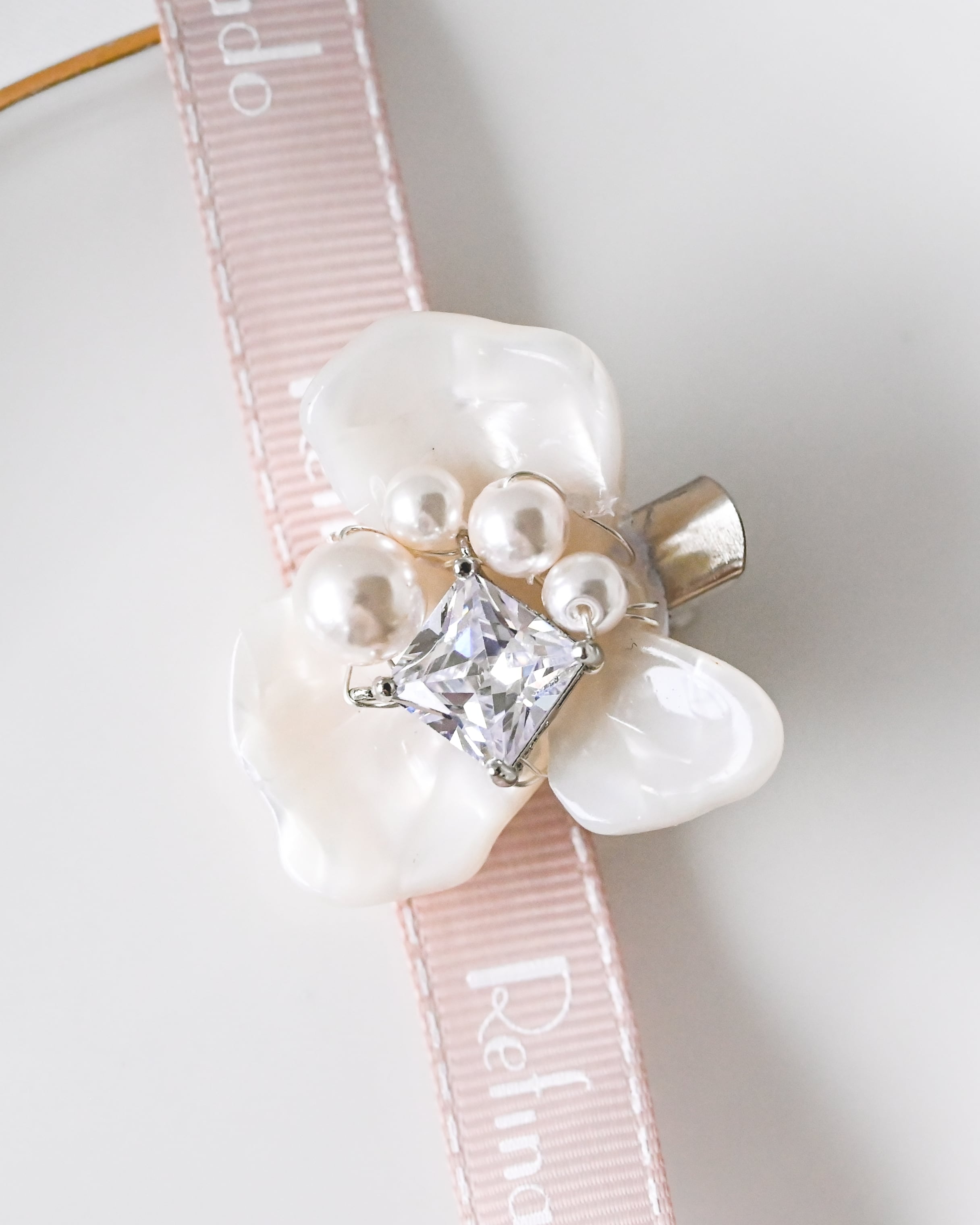 上品な艶めきを放つシェル風フラワーモチーフに、透明感のあるスクエアカットストーンと大小のパールをあしらったヘアクリップ3点セット。