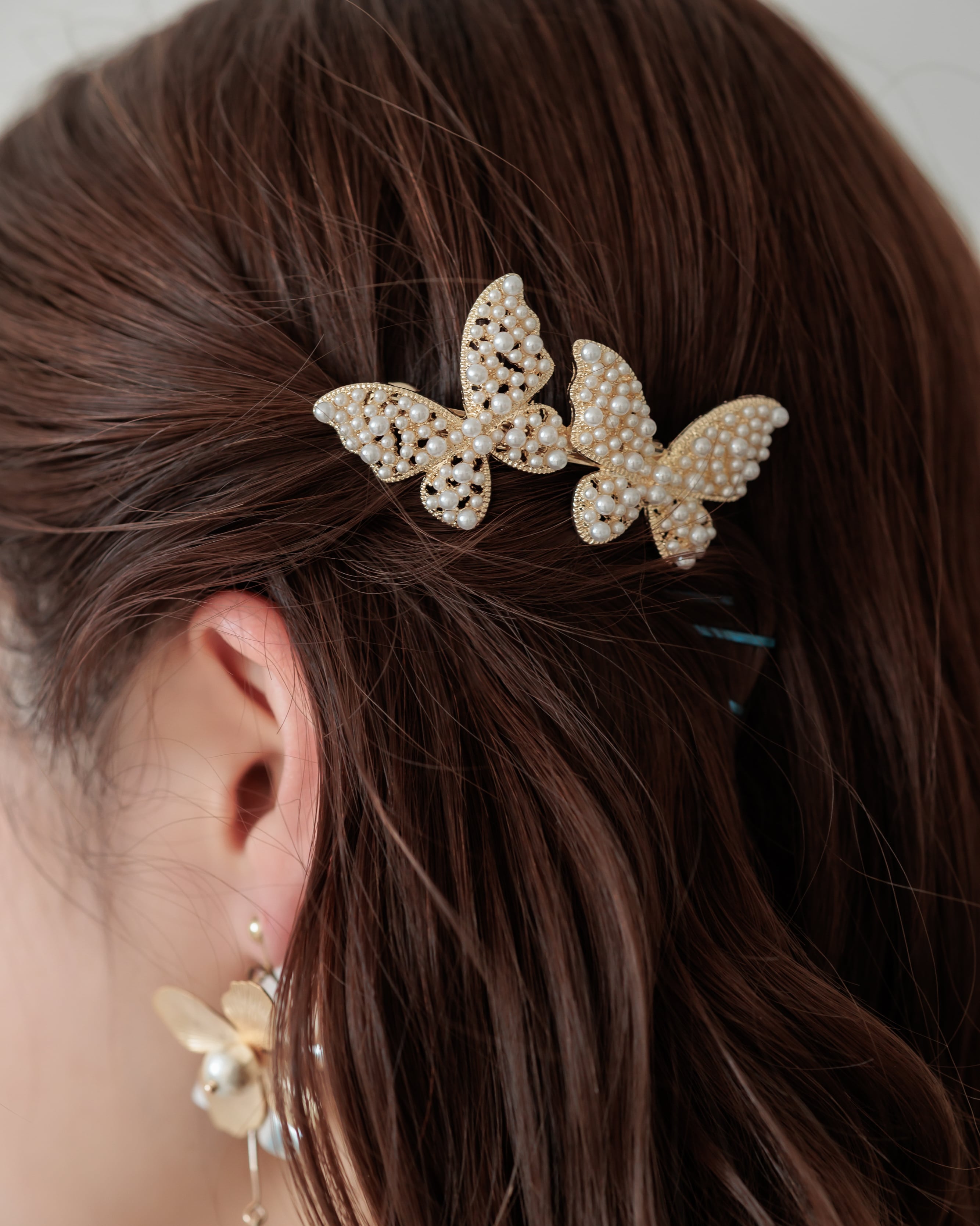 立体的なバタフライモチーフにパールを贅沢にあしらった華やかなバレッタ。