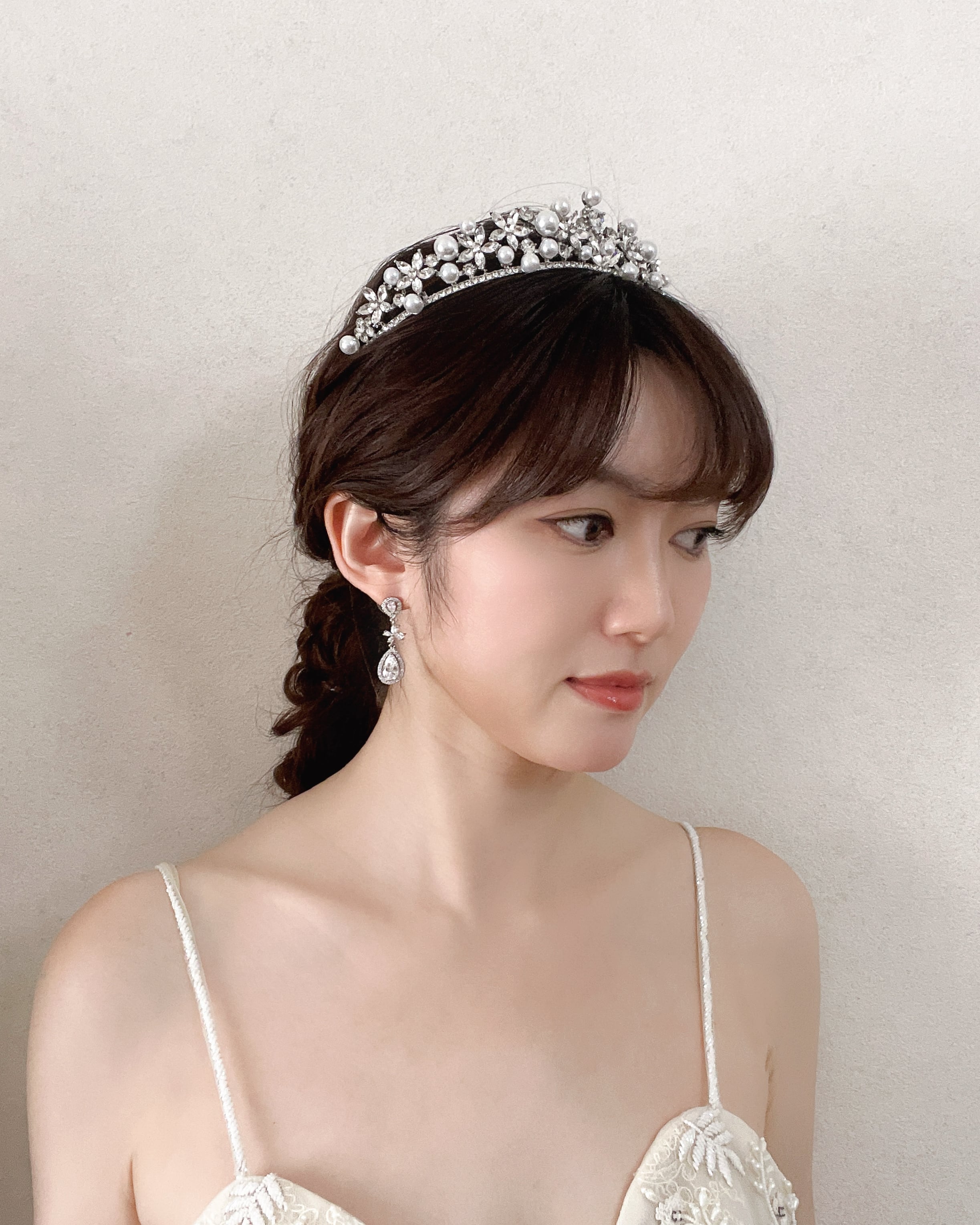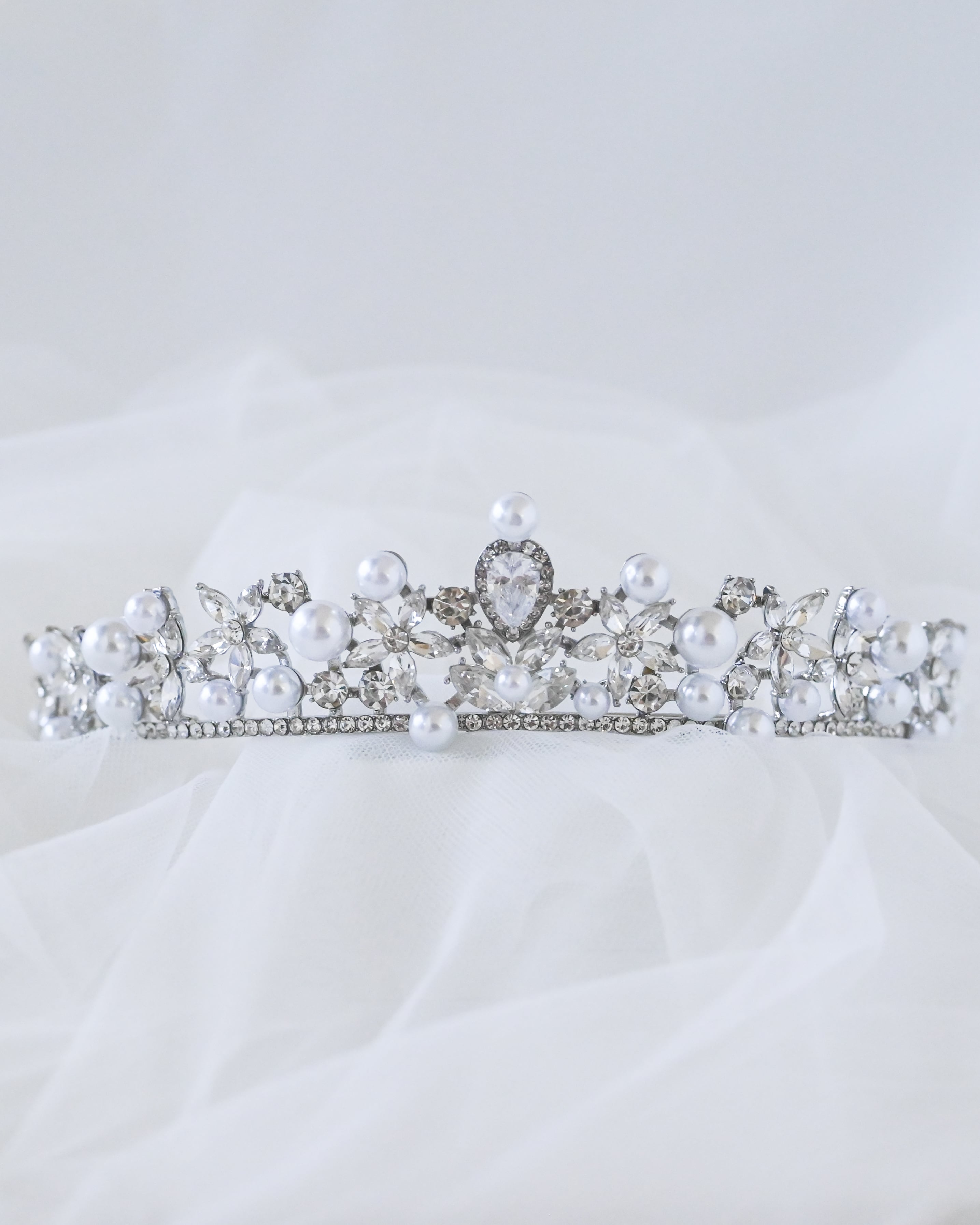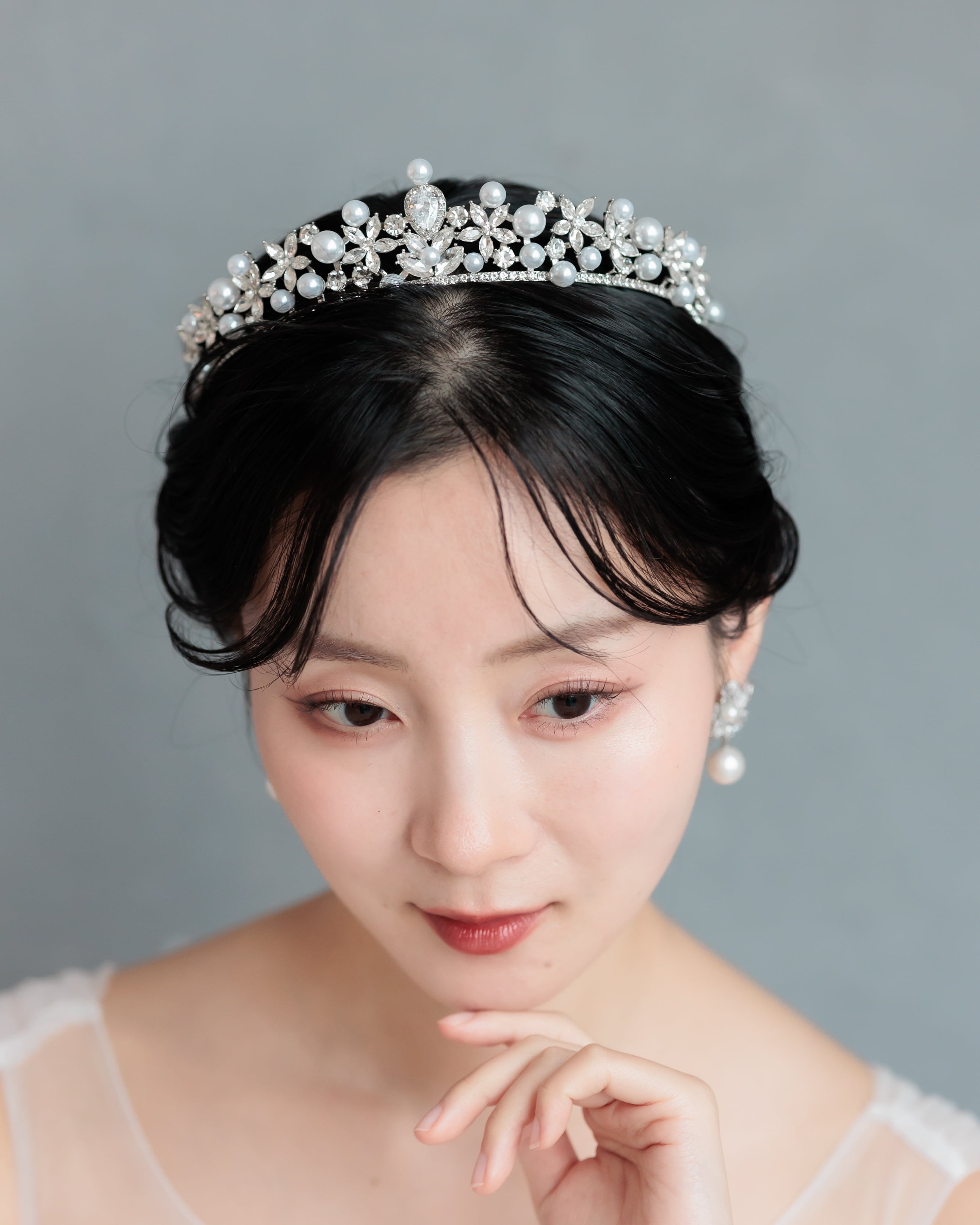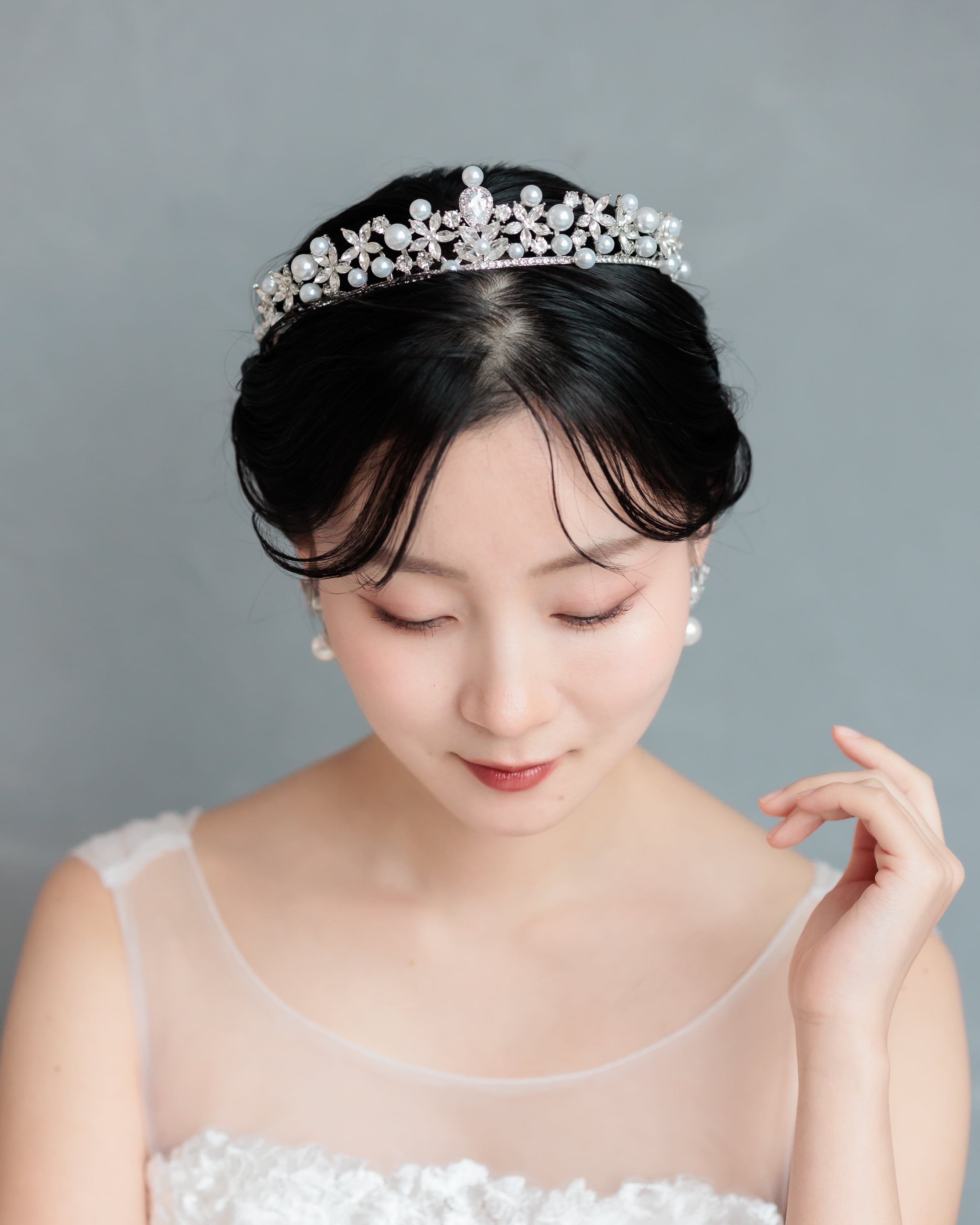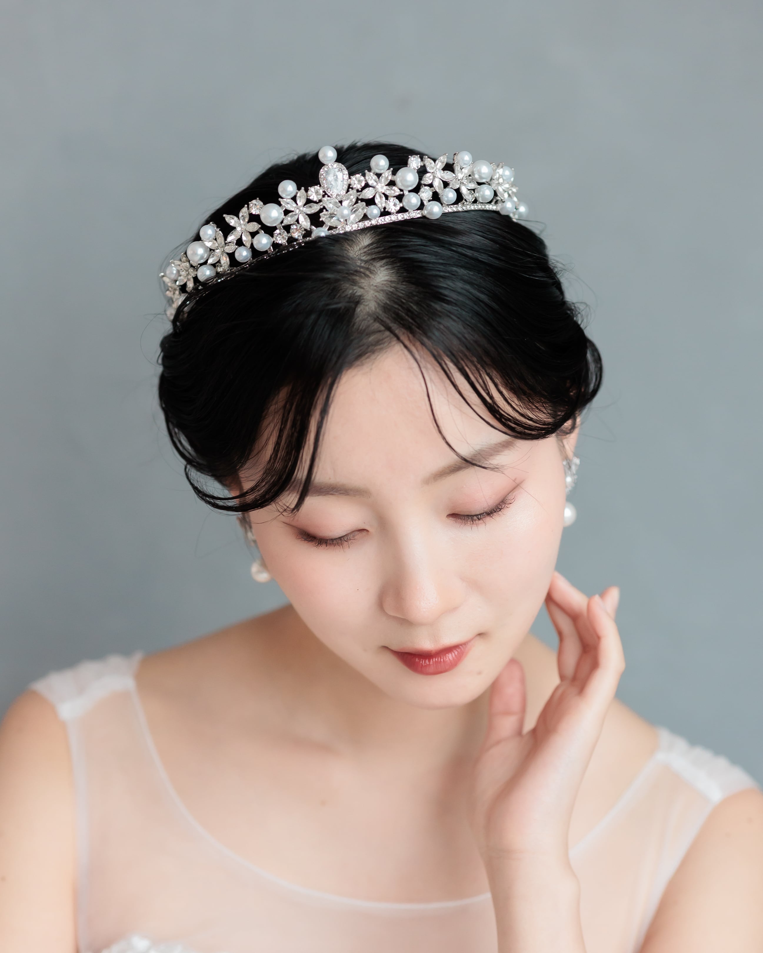 華やかなラインストーンと上品なパールを贅沢にあしらったブライダルティアラ。