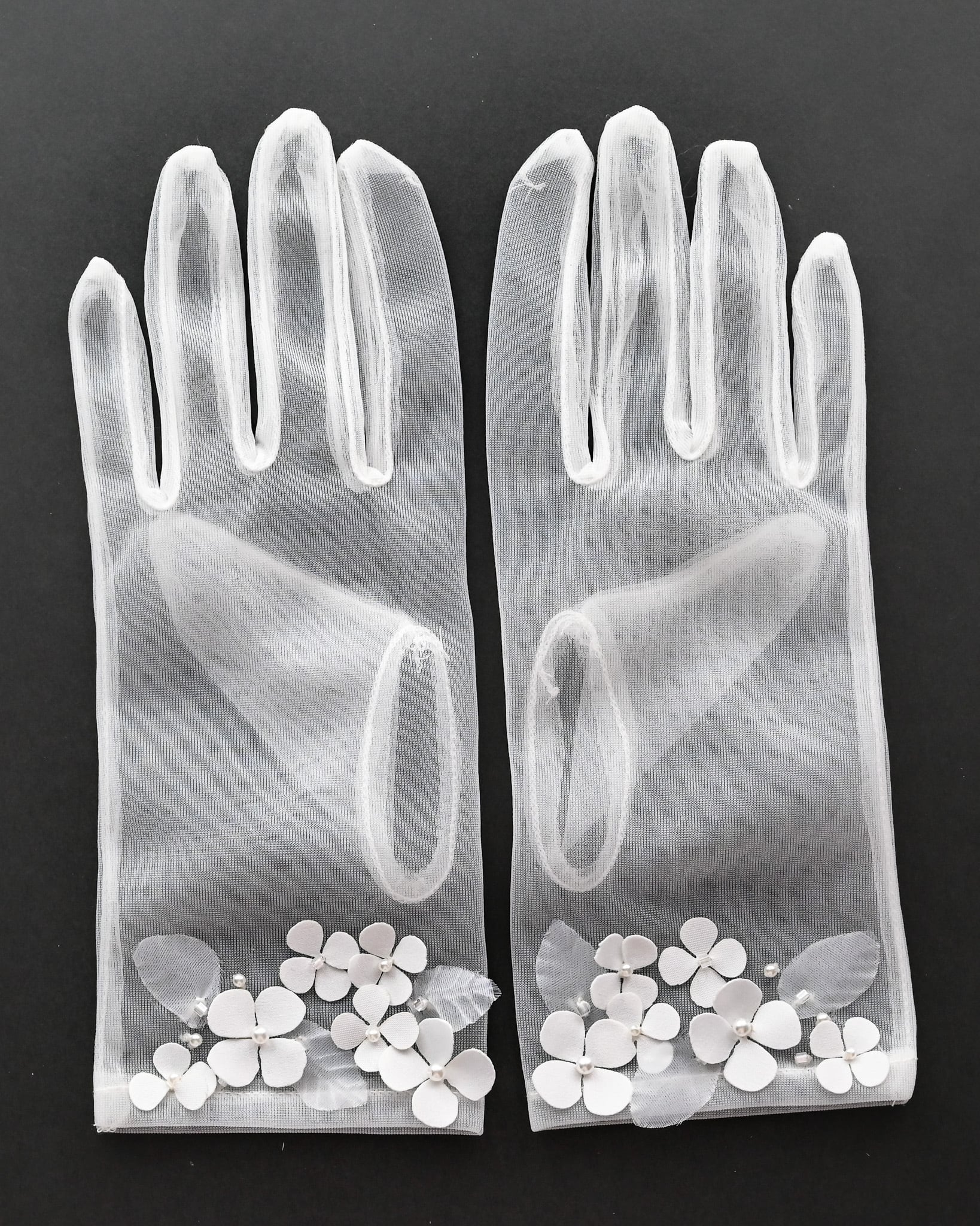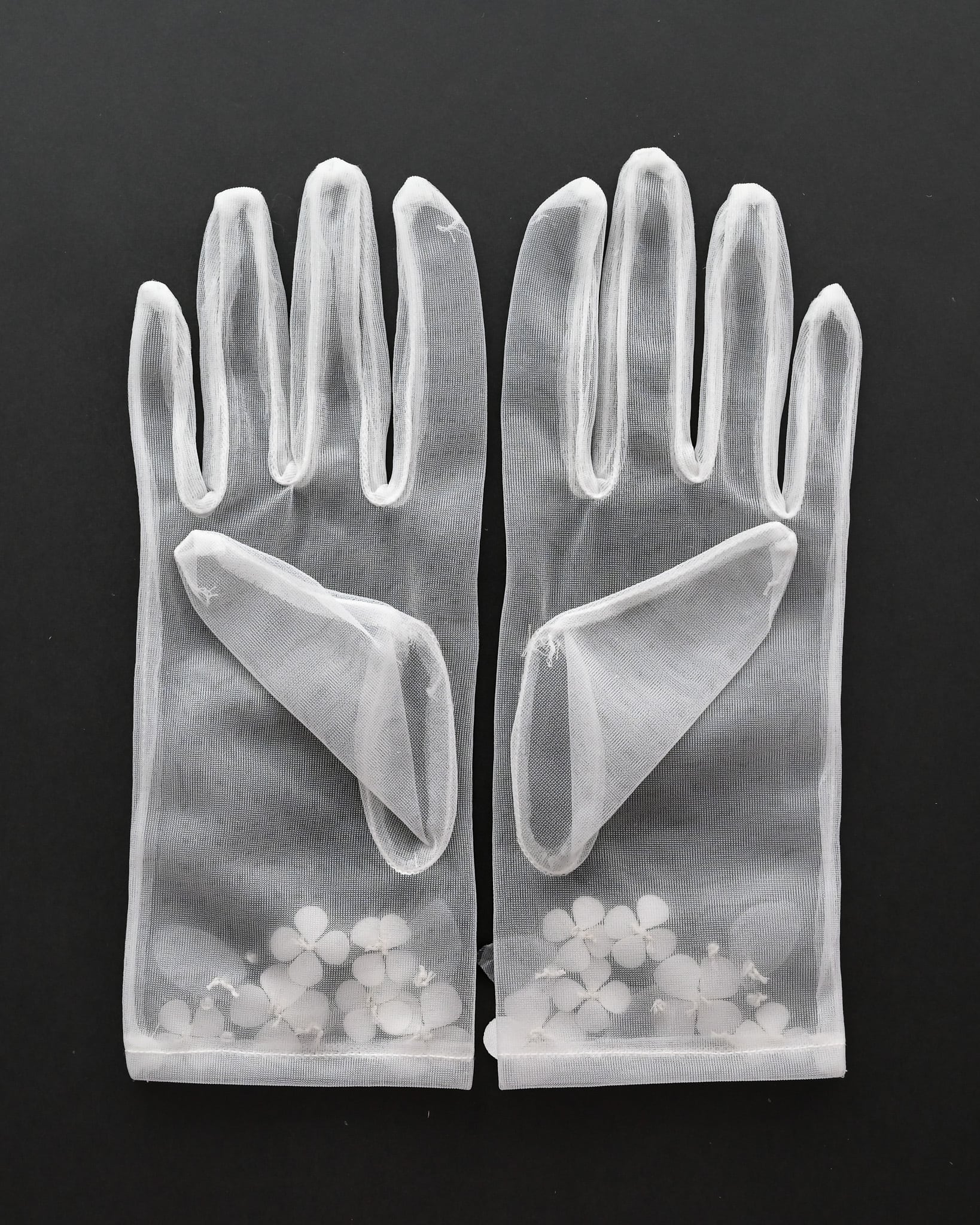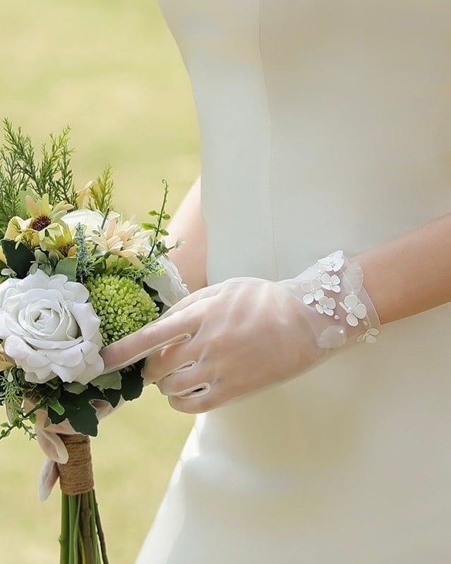 繊細なチュール素材に、小花モチーフをあしらったショート丈のブライダルグローブ。