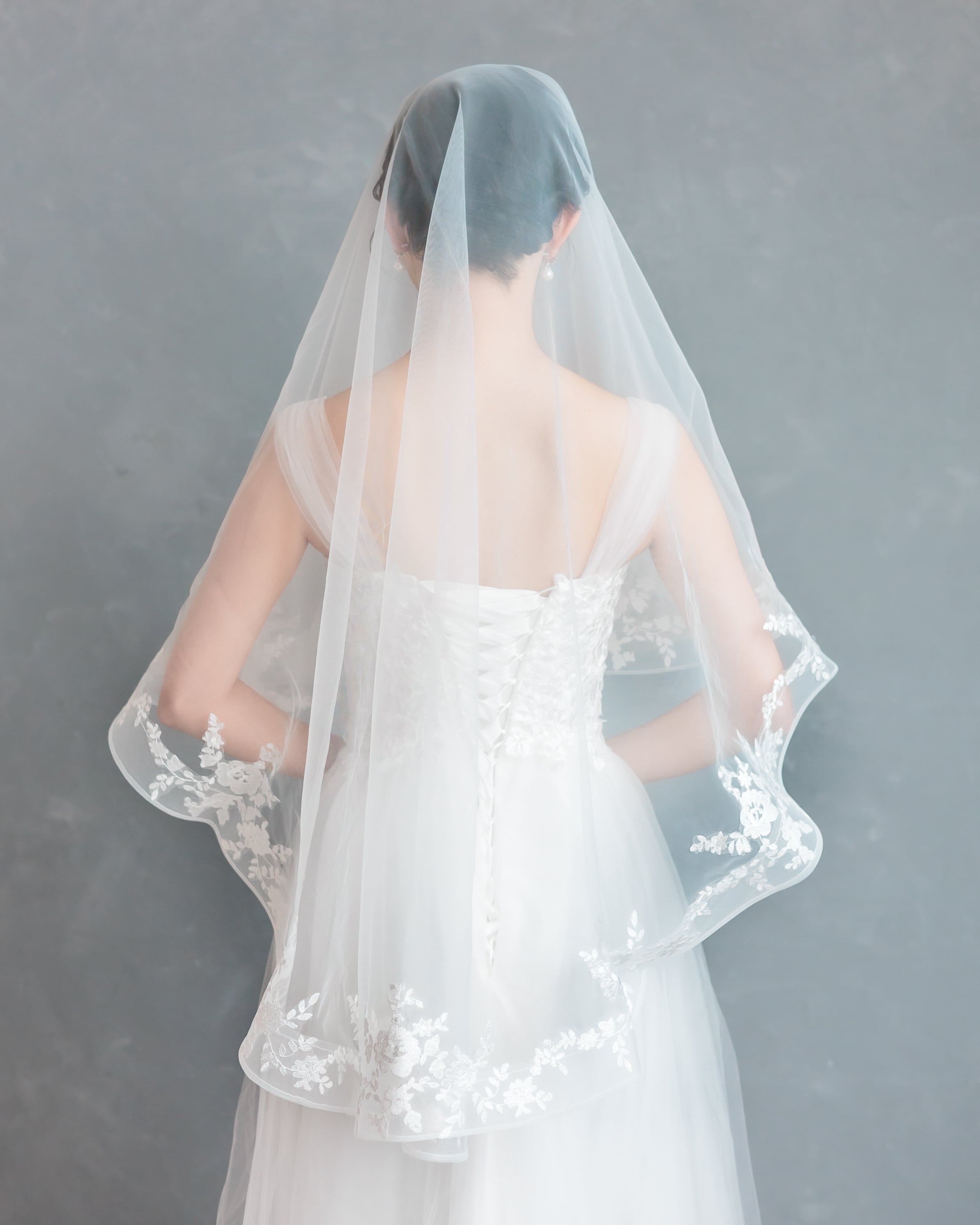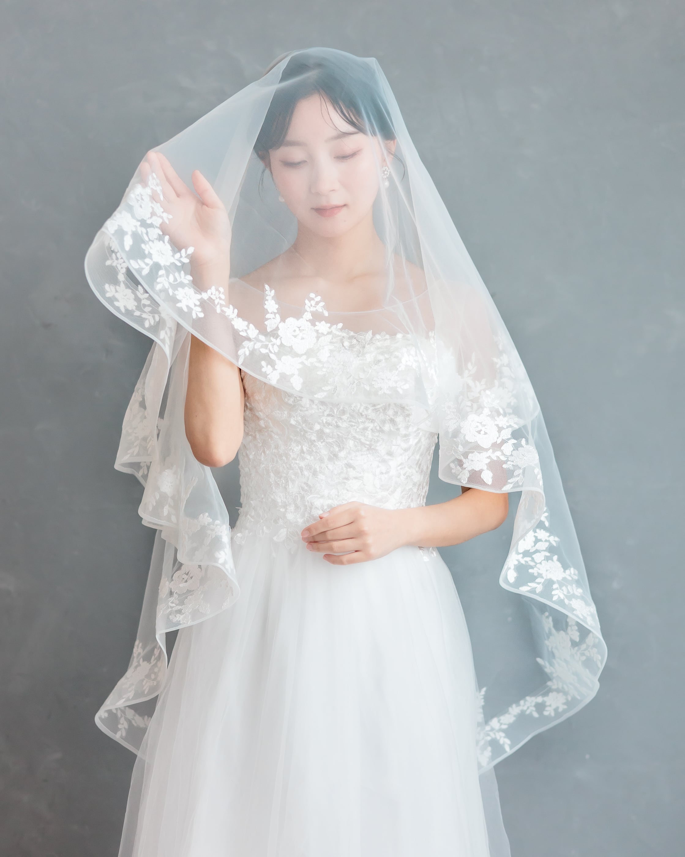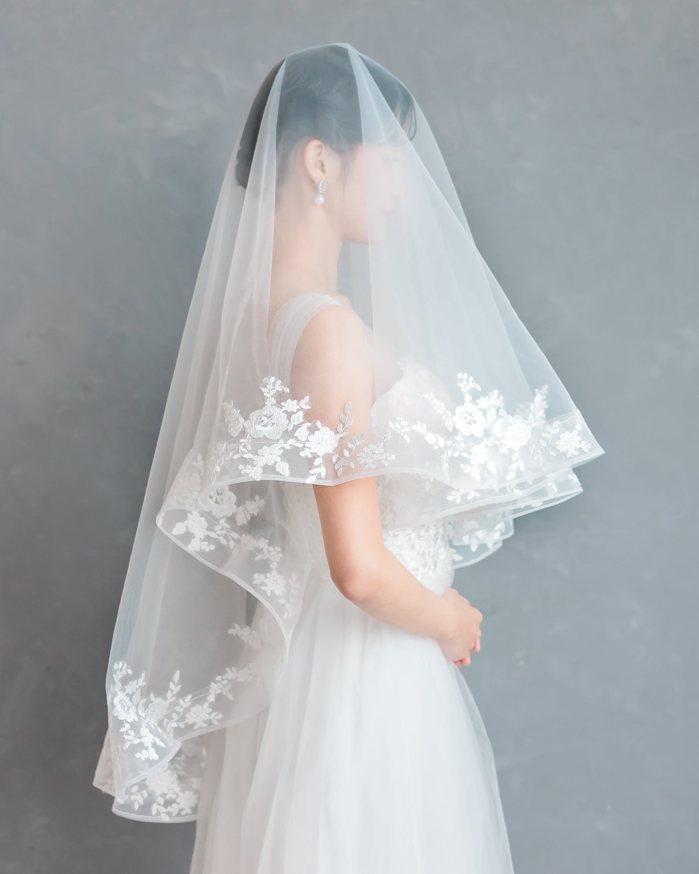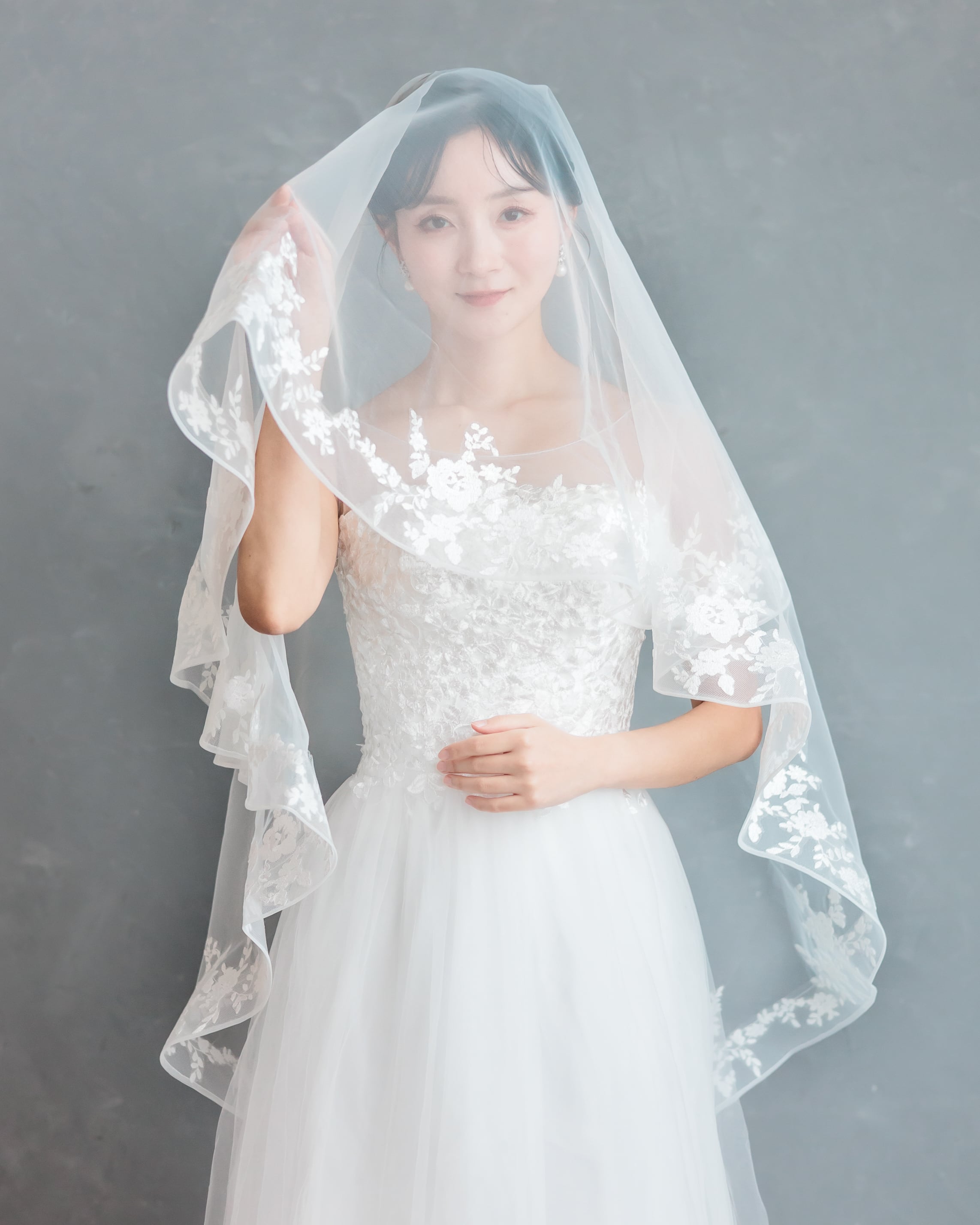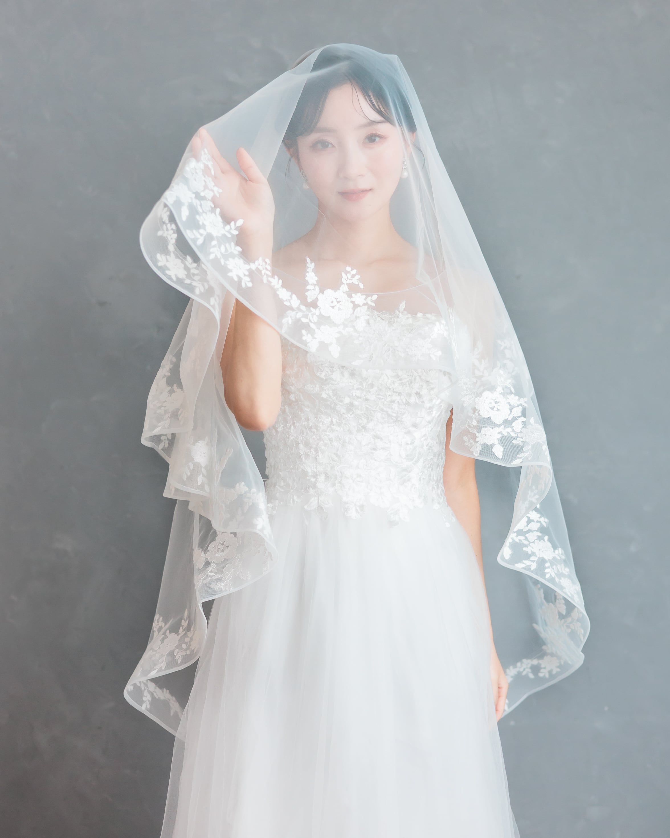 透明感のあるソフトチュールに、繊細な花柄レースを贅沢にあしらったショートベール。