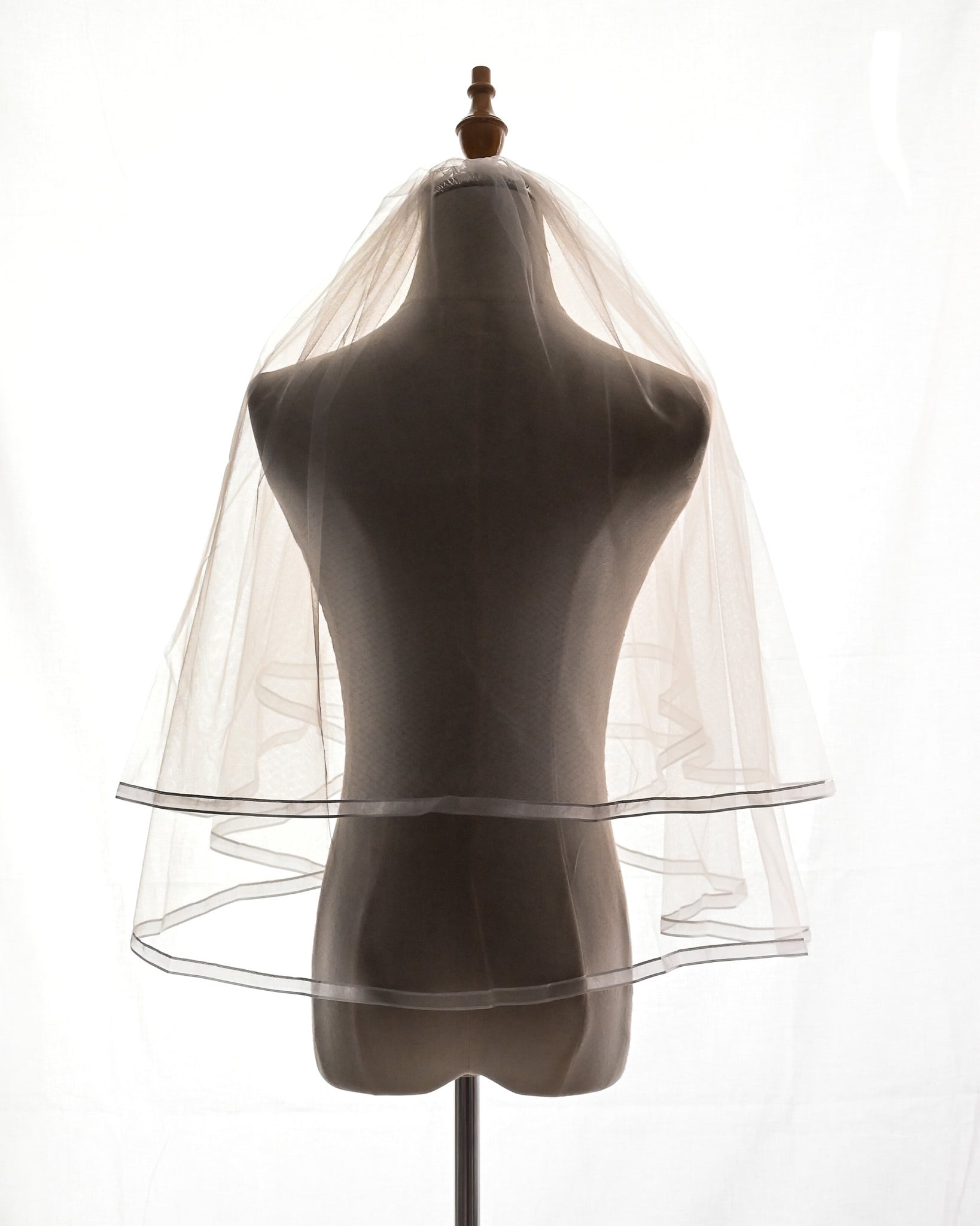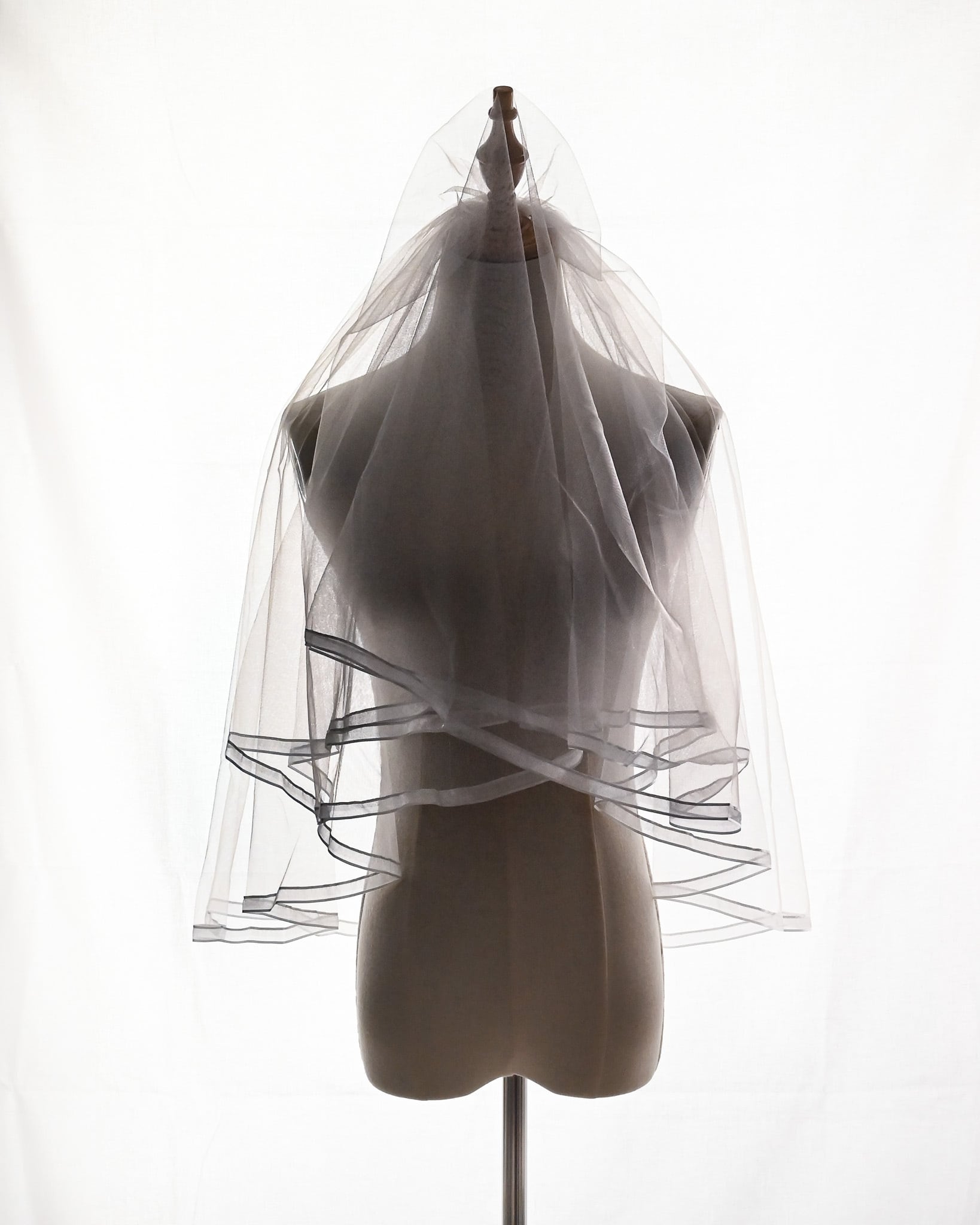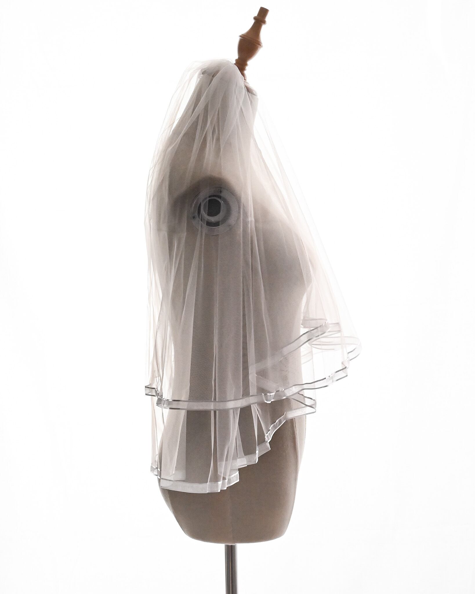 やわらかく透けるチュールの縁に、光沢のあるサテンパイピングをあしらったショートベール。