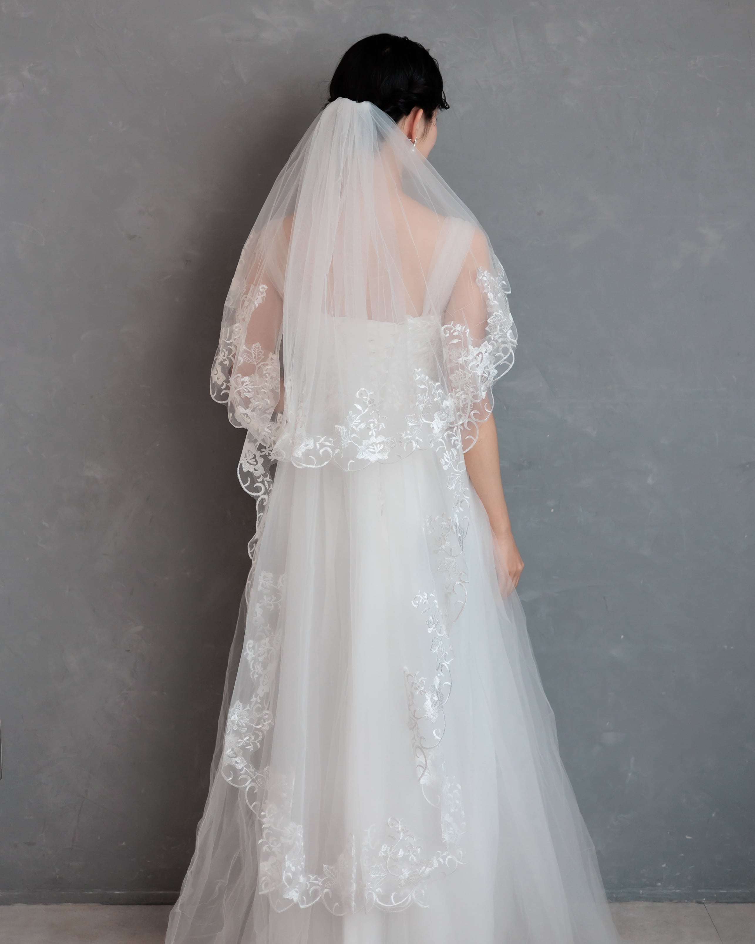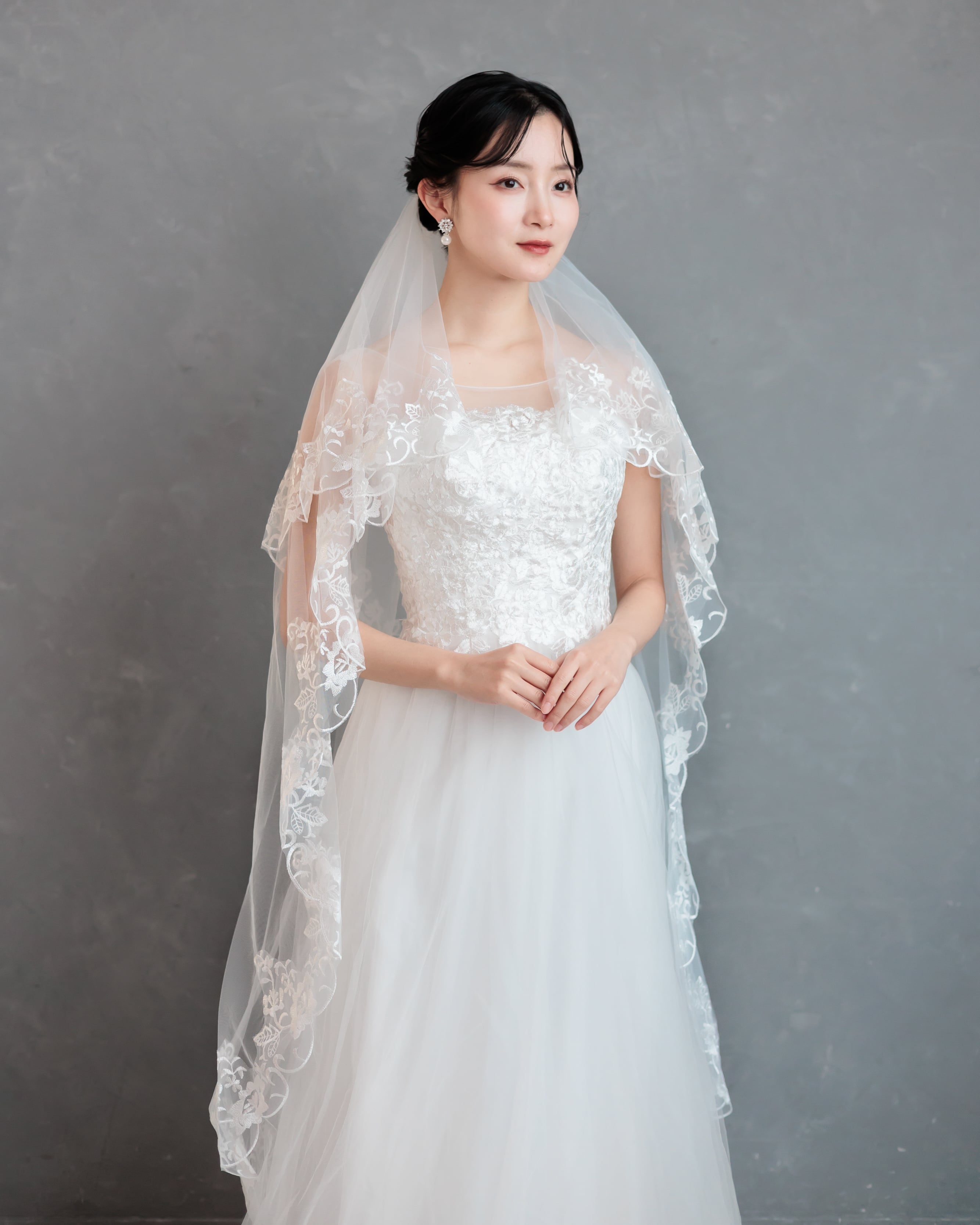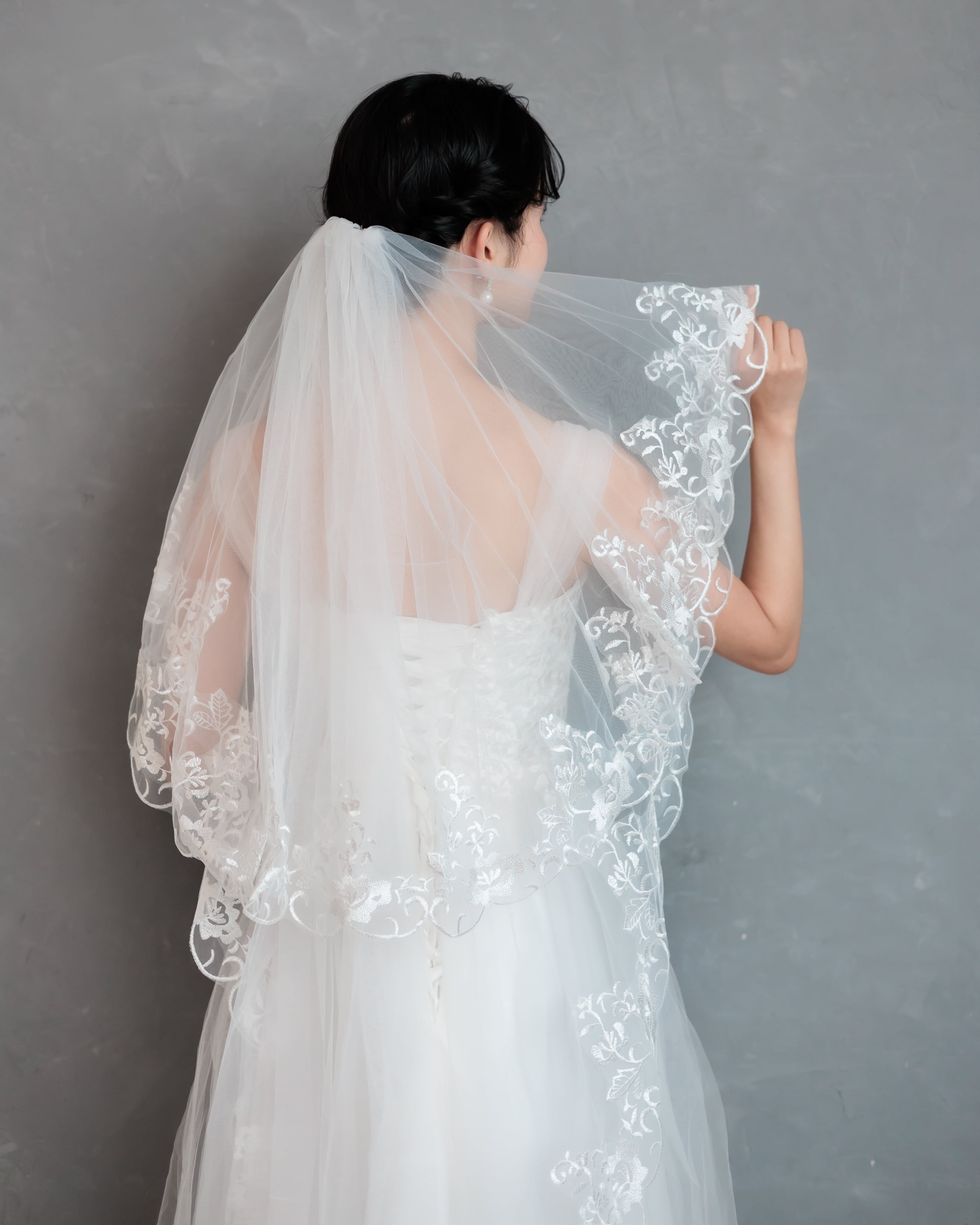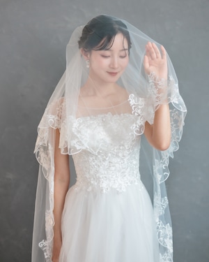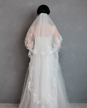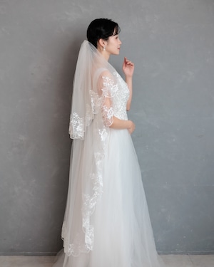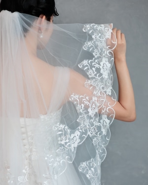 繊細なチュールの縁に、美しいフローラルレースをたっぷりとあしらったミディアム丈のベール。