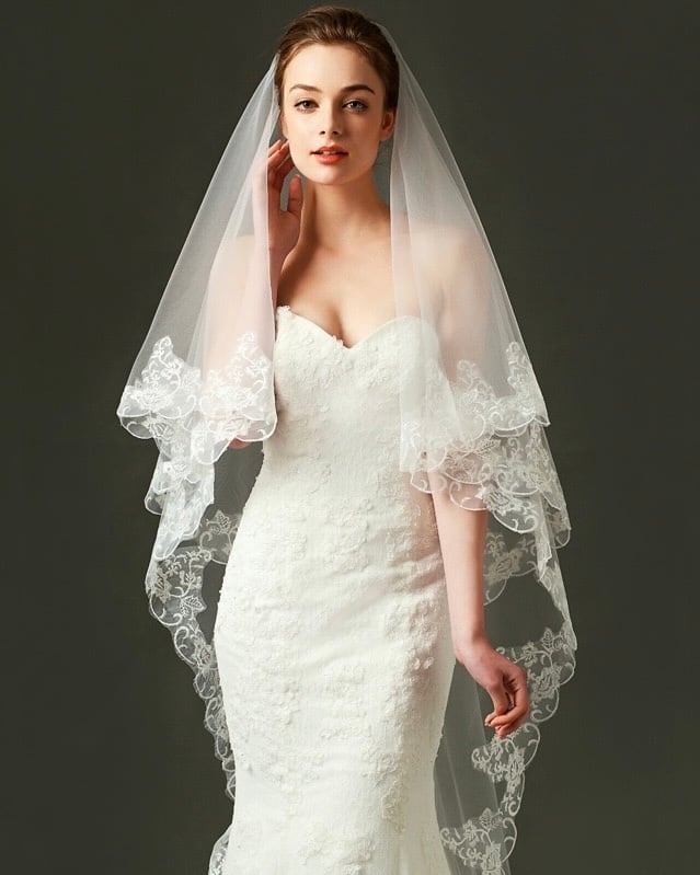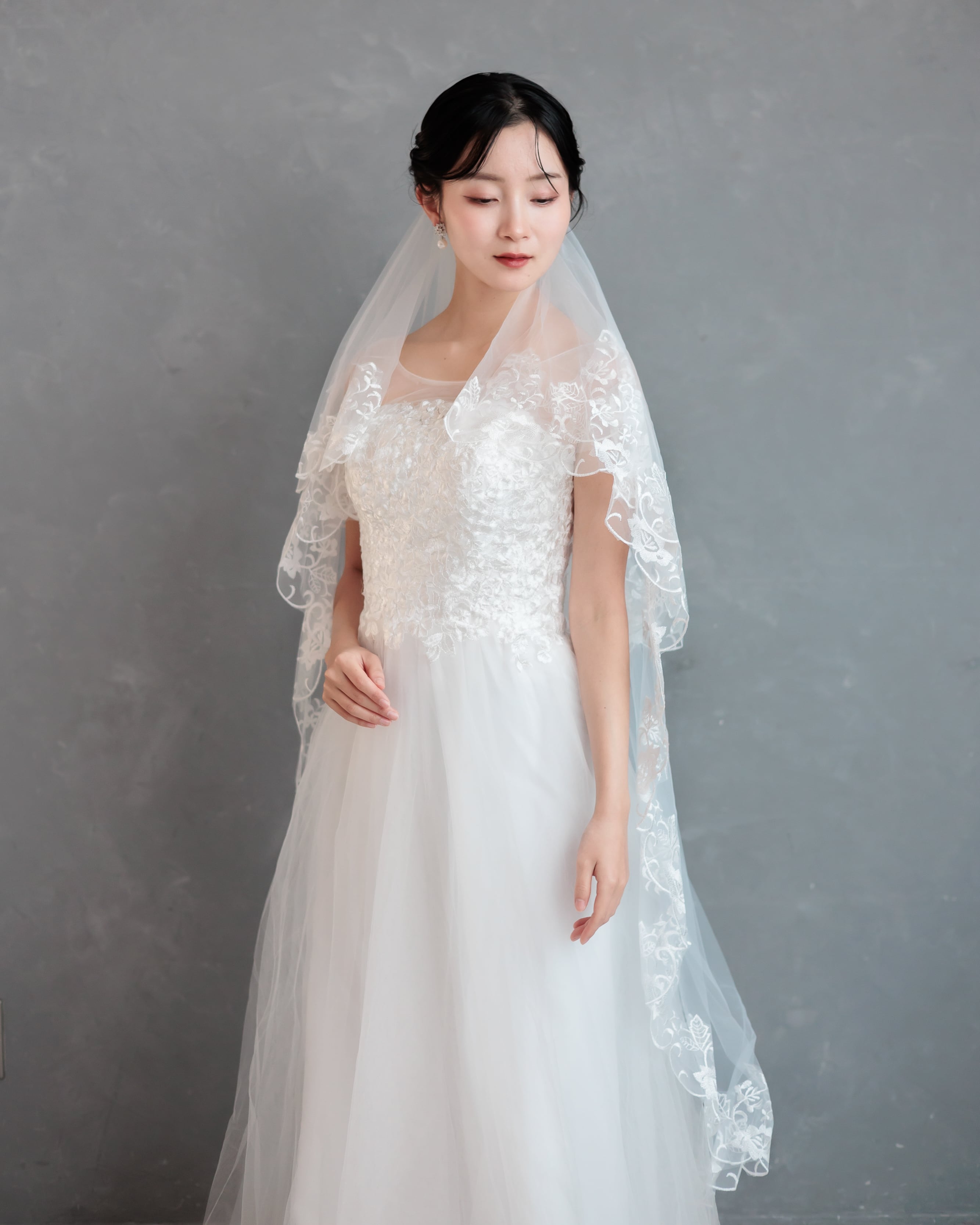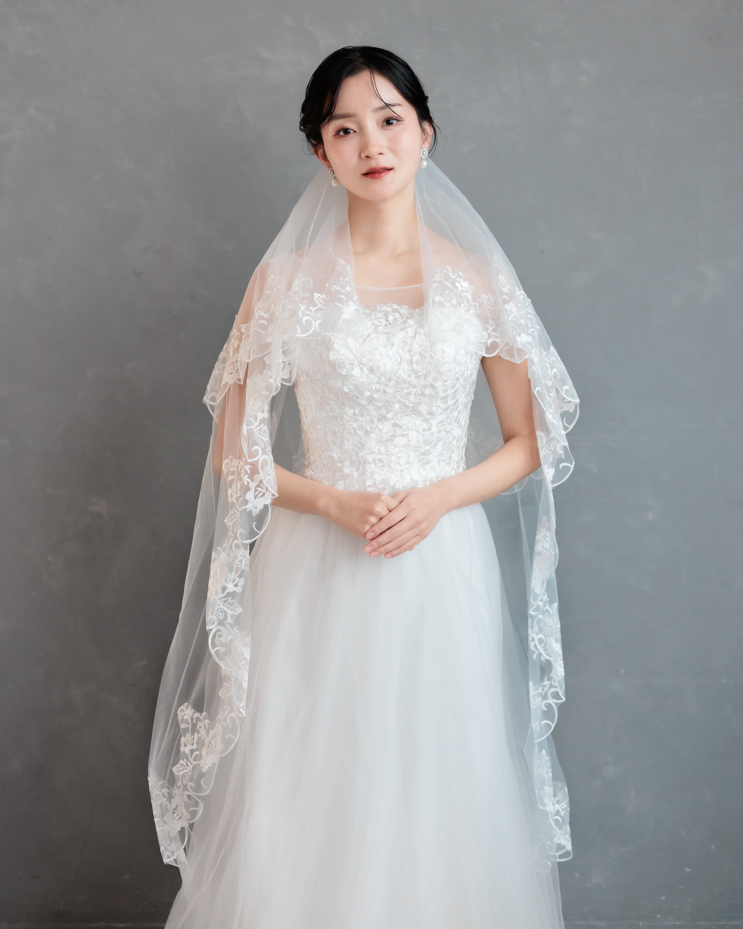 繊細なチュールの縁に、美しいフローラルレースをたっぷりとあしらったミディアム丈のベール。