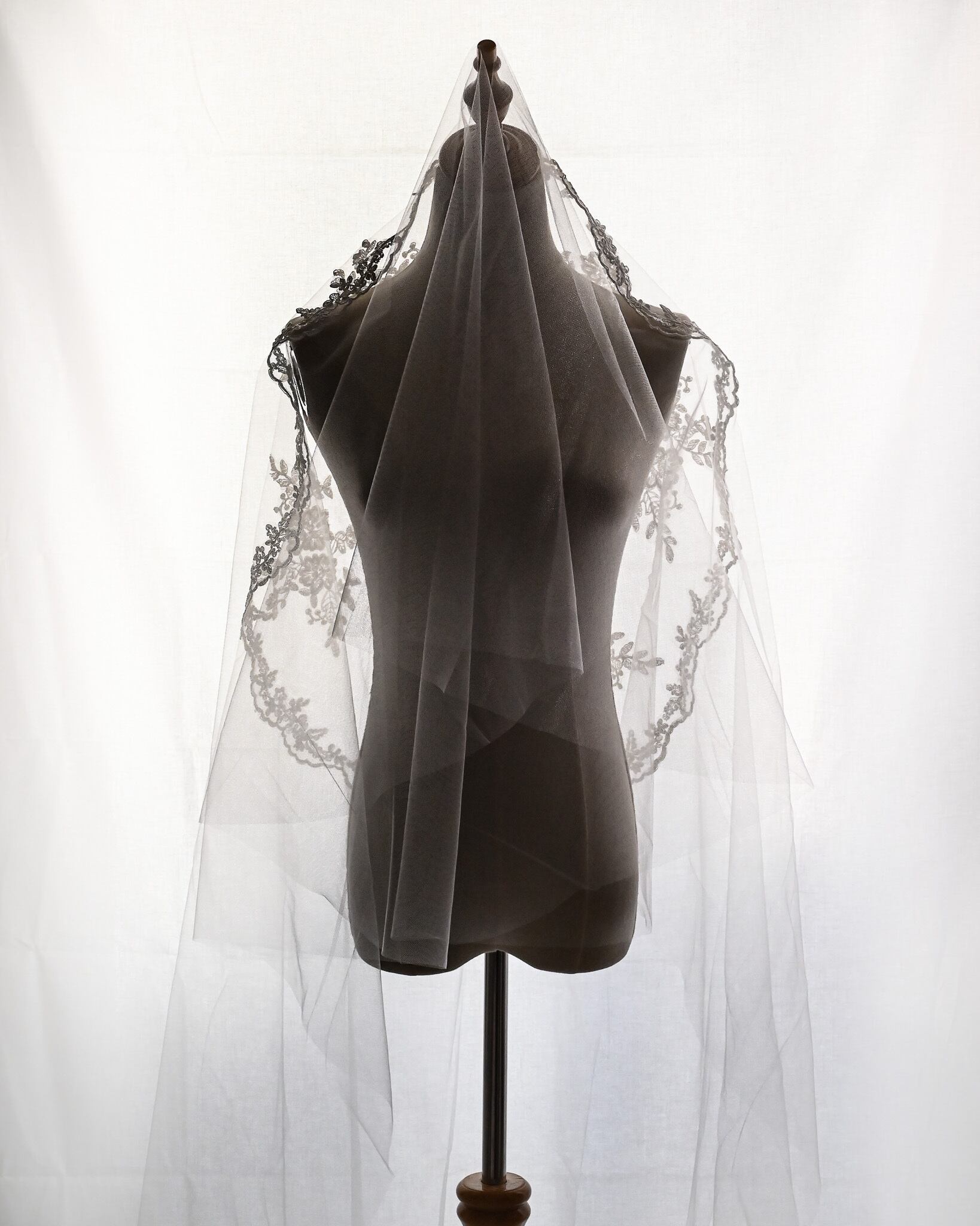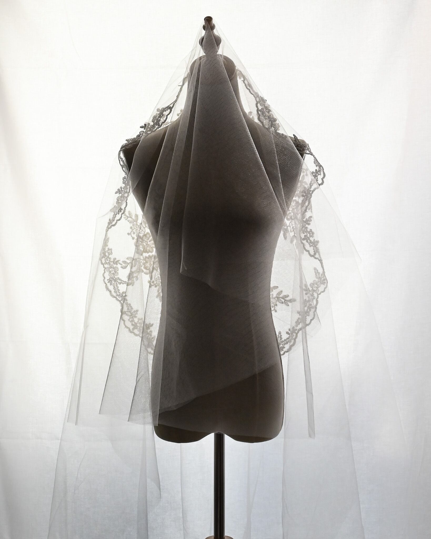繊細な刺繍レースがぐるりと縁取られた、クラシカルで上品なショートベール。