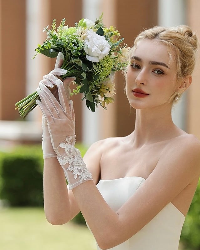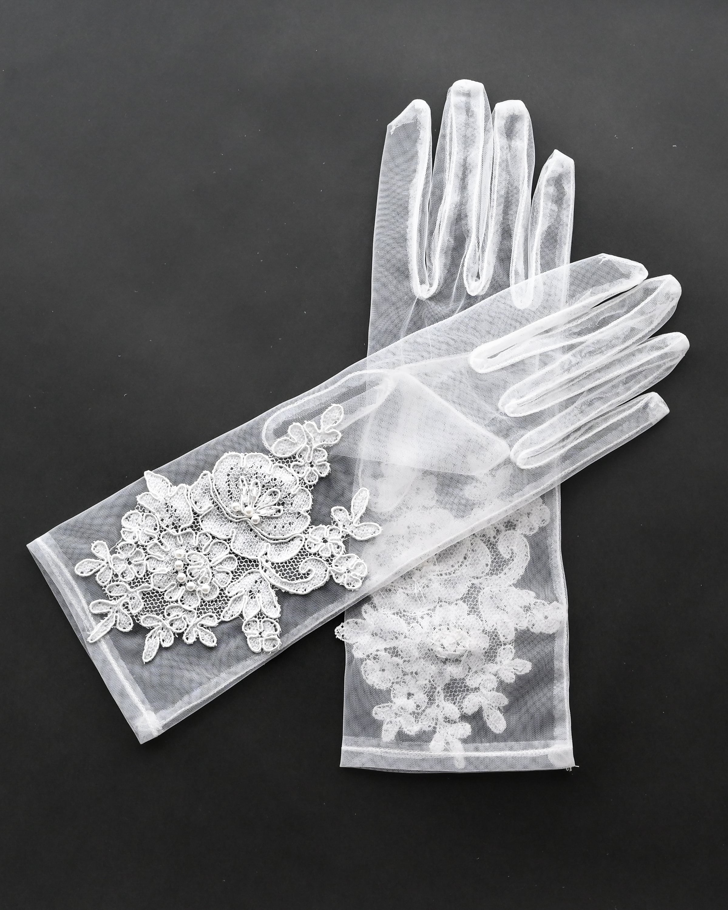 繊細なチュールに立体的なフラワーレースを贅沢にあしらった、クラシカルなロンググローブ。