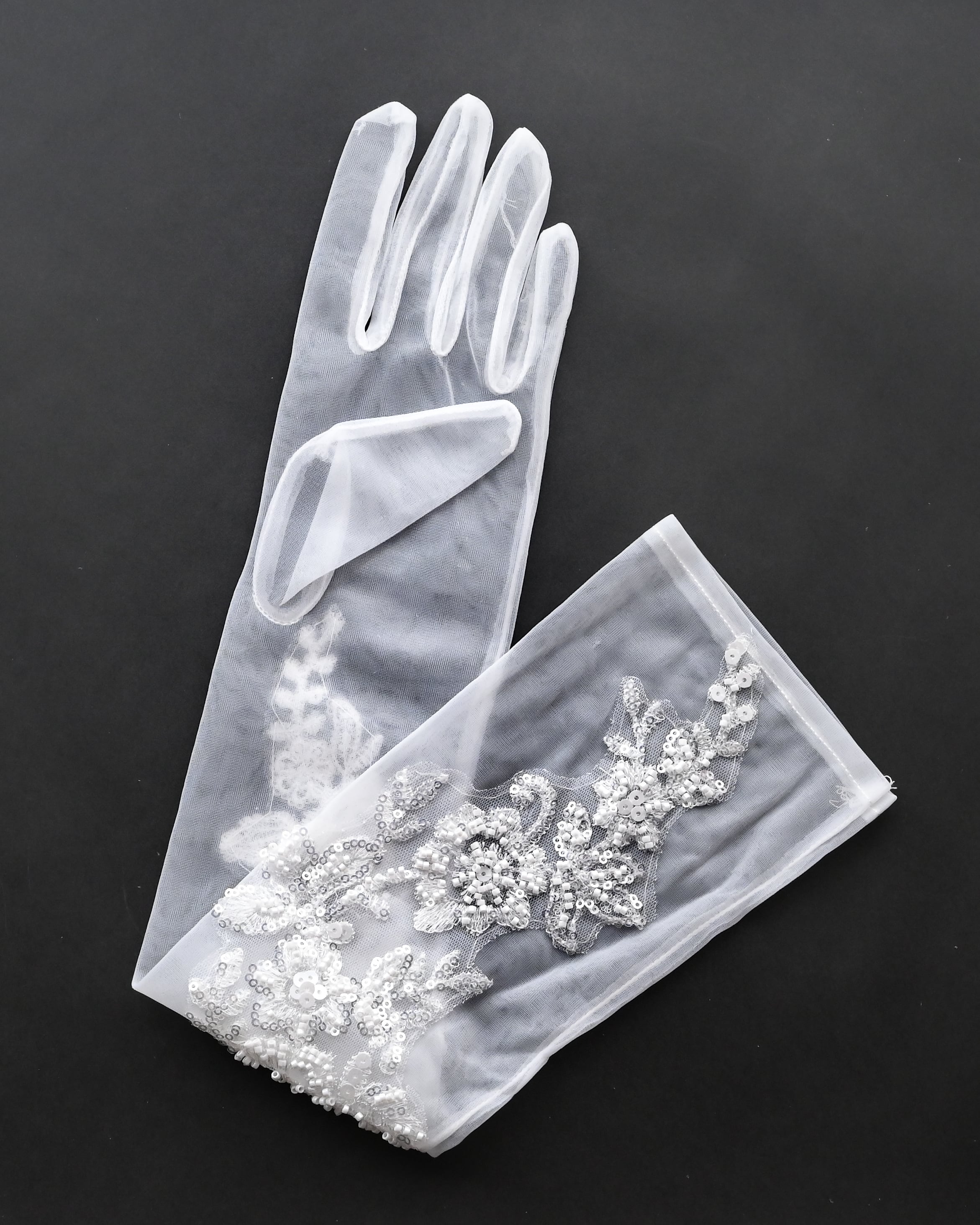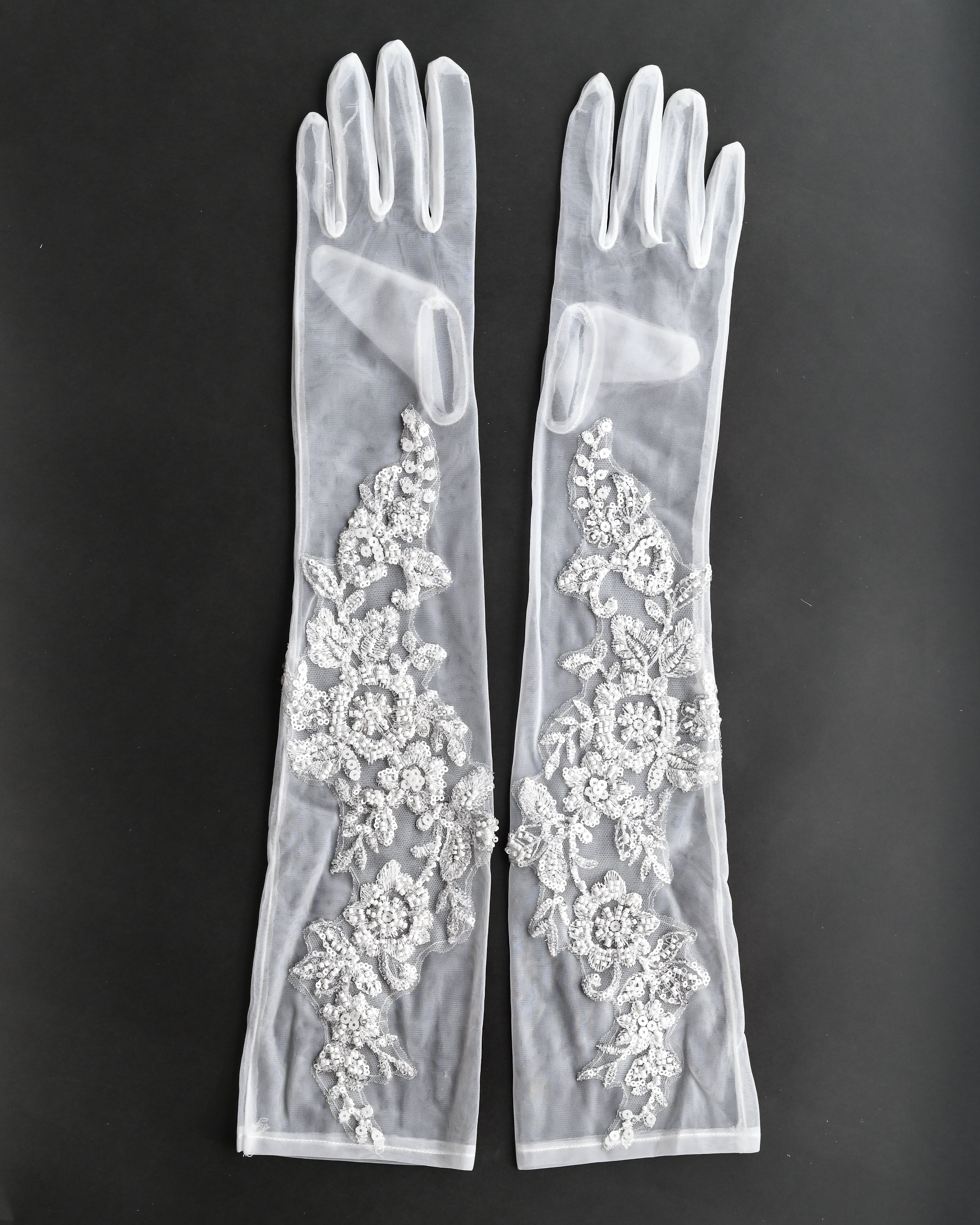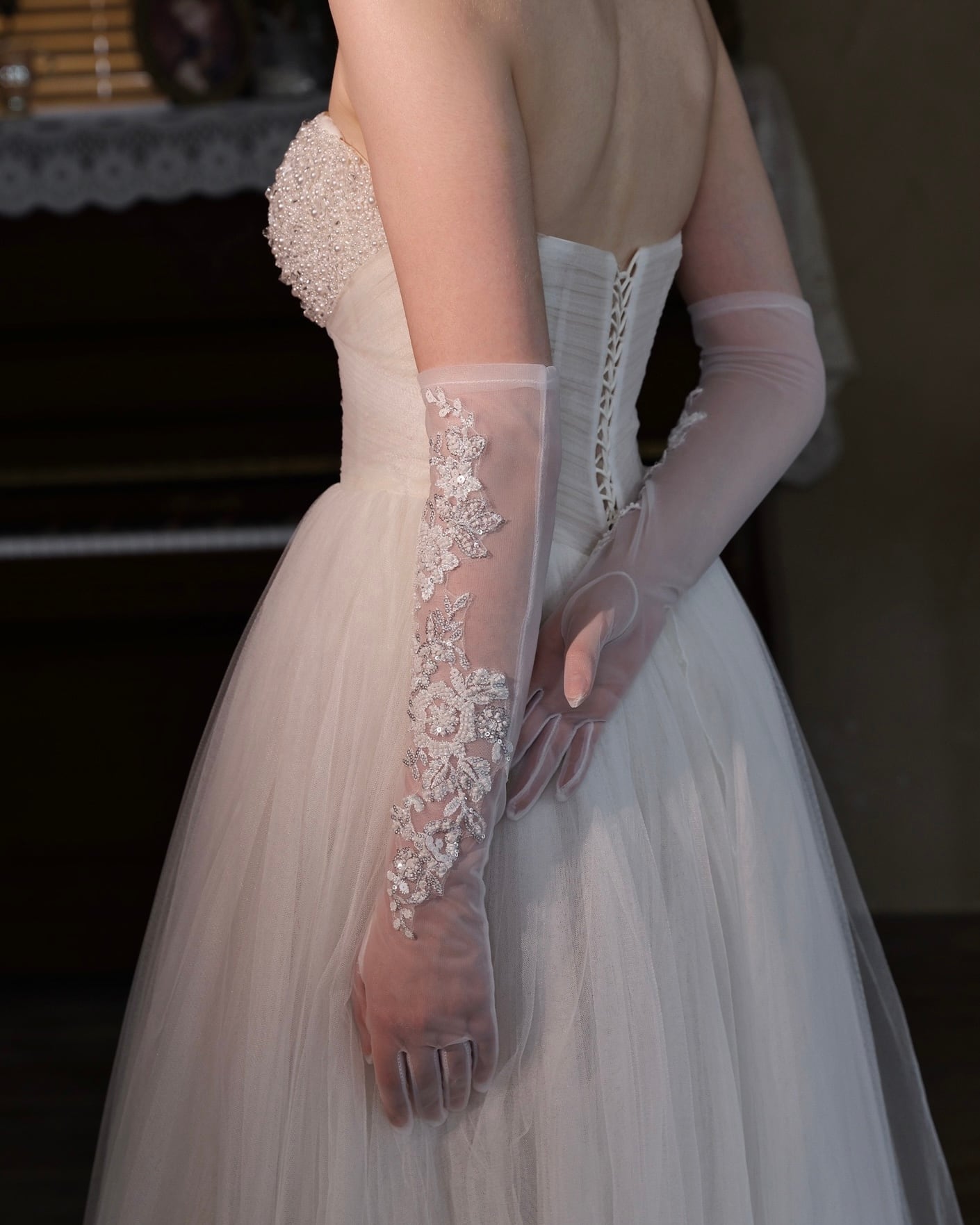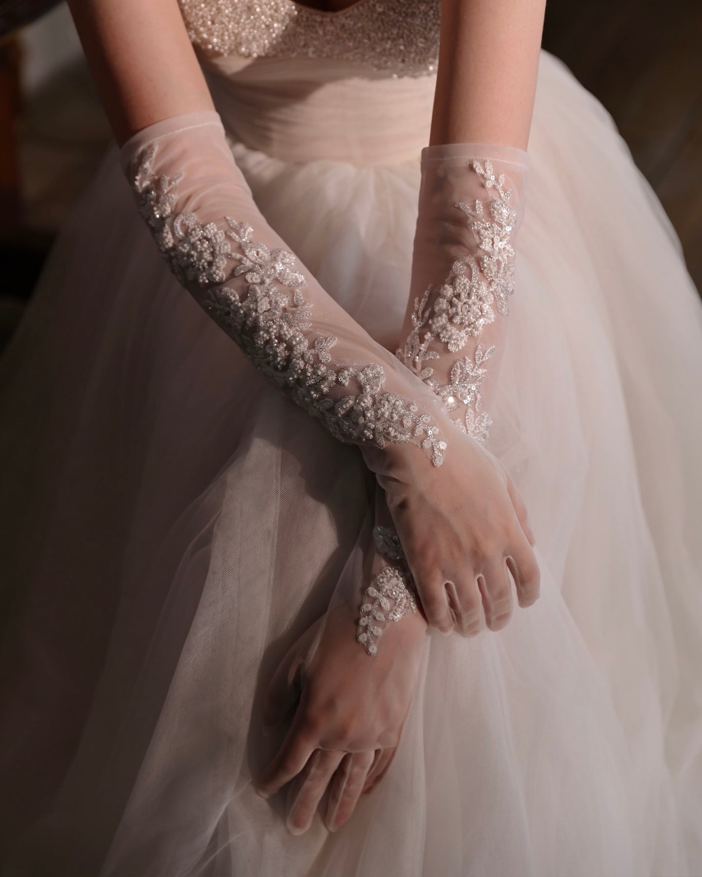 繊細なチュールに、光を受けてきらめくスパンコールとビーズを贅沢にあしらったロンググローブ。