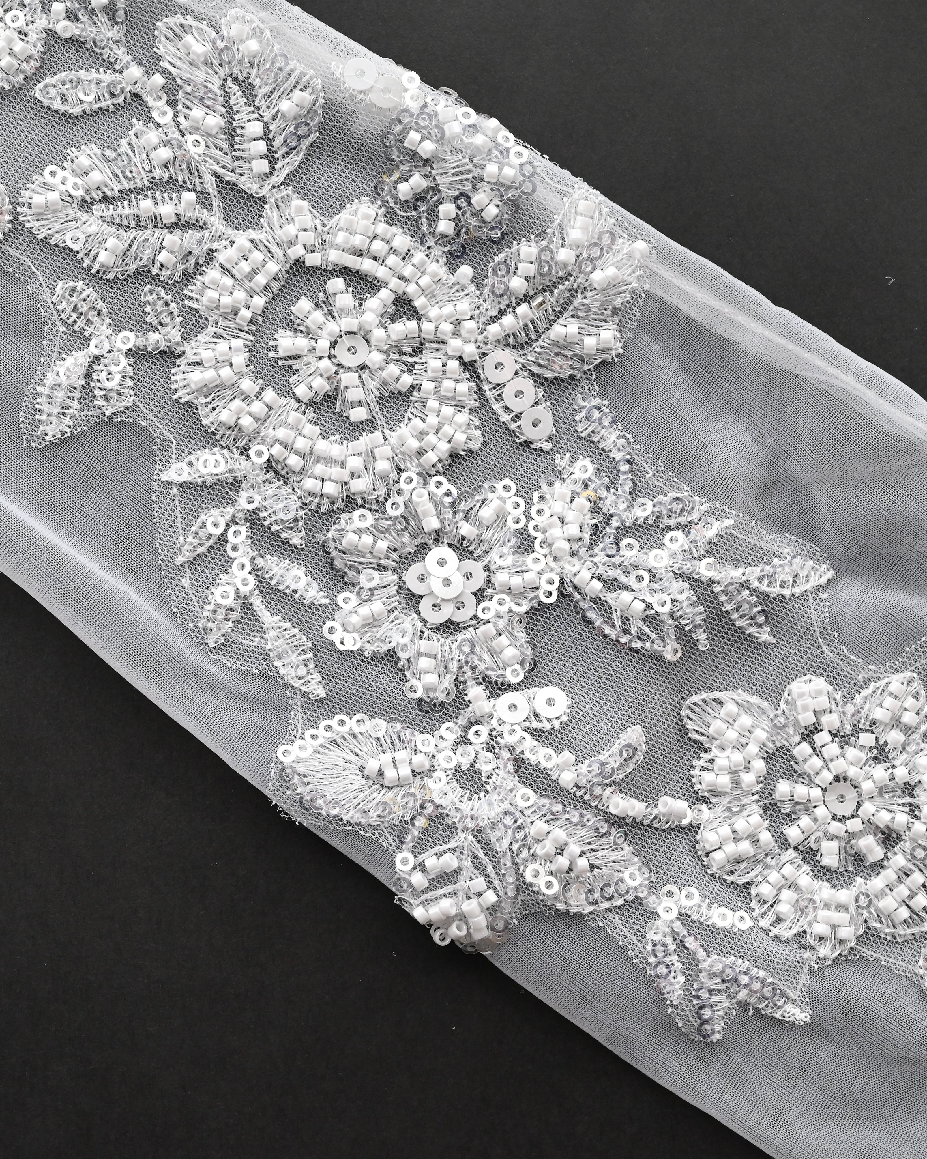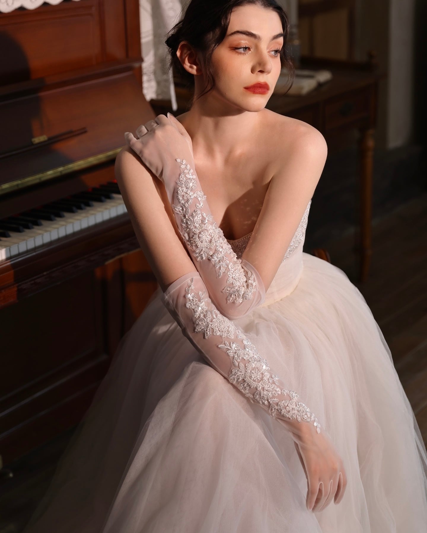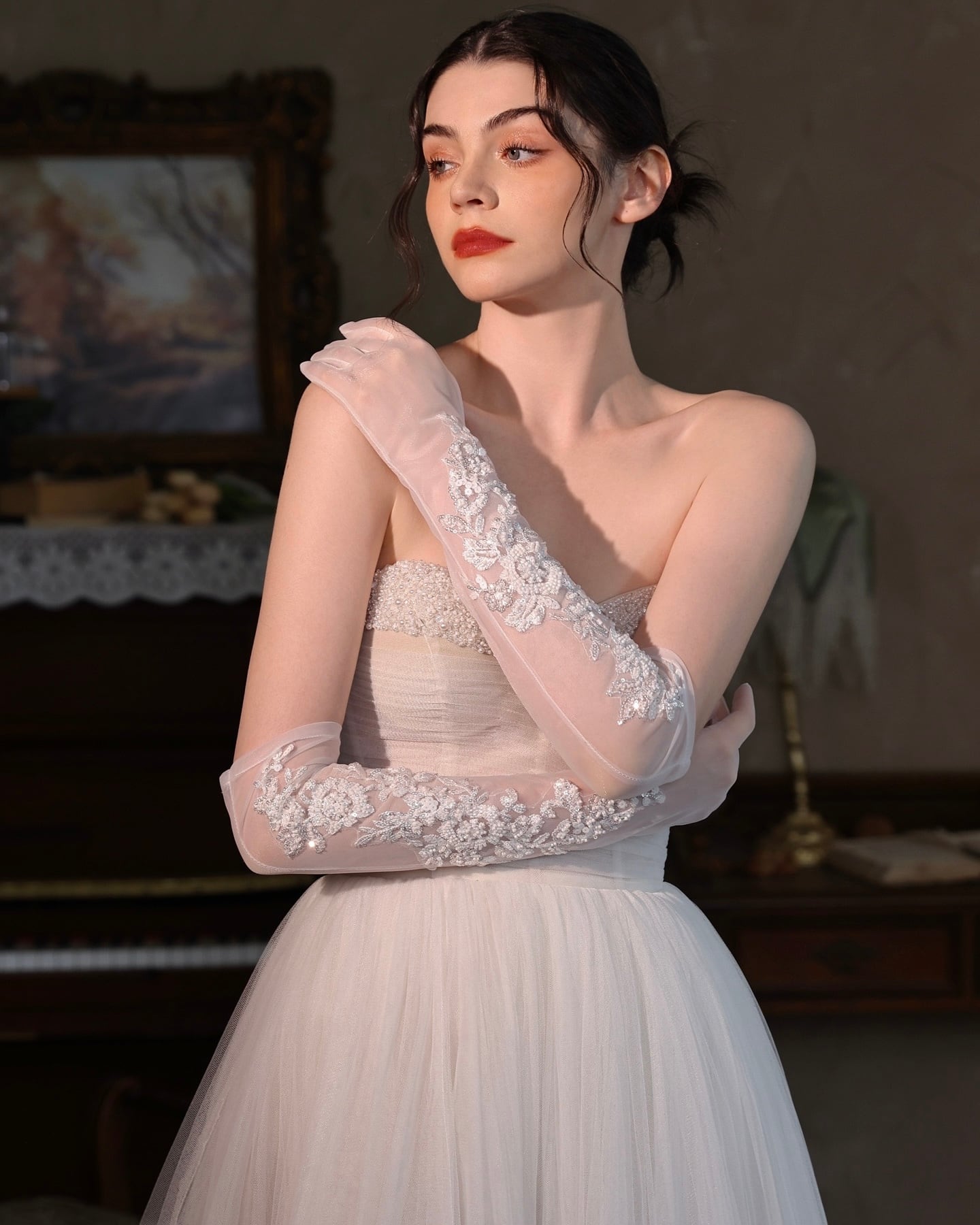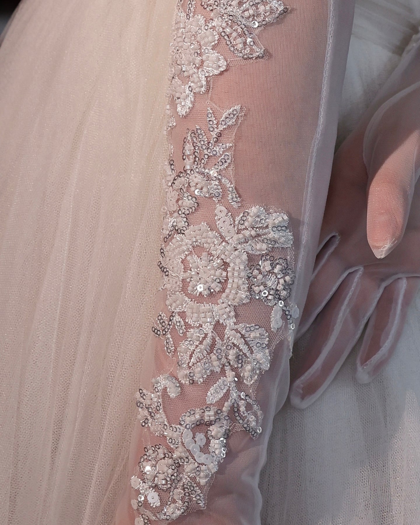 繊細なチュールに、光を受けてきらめくスパンコールとビーズを贅沢にあしらったロンググローブ。