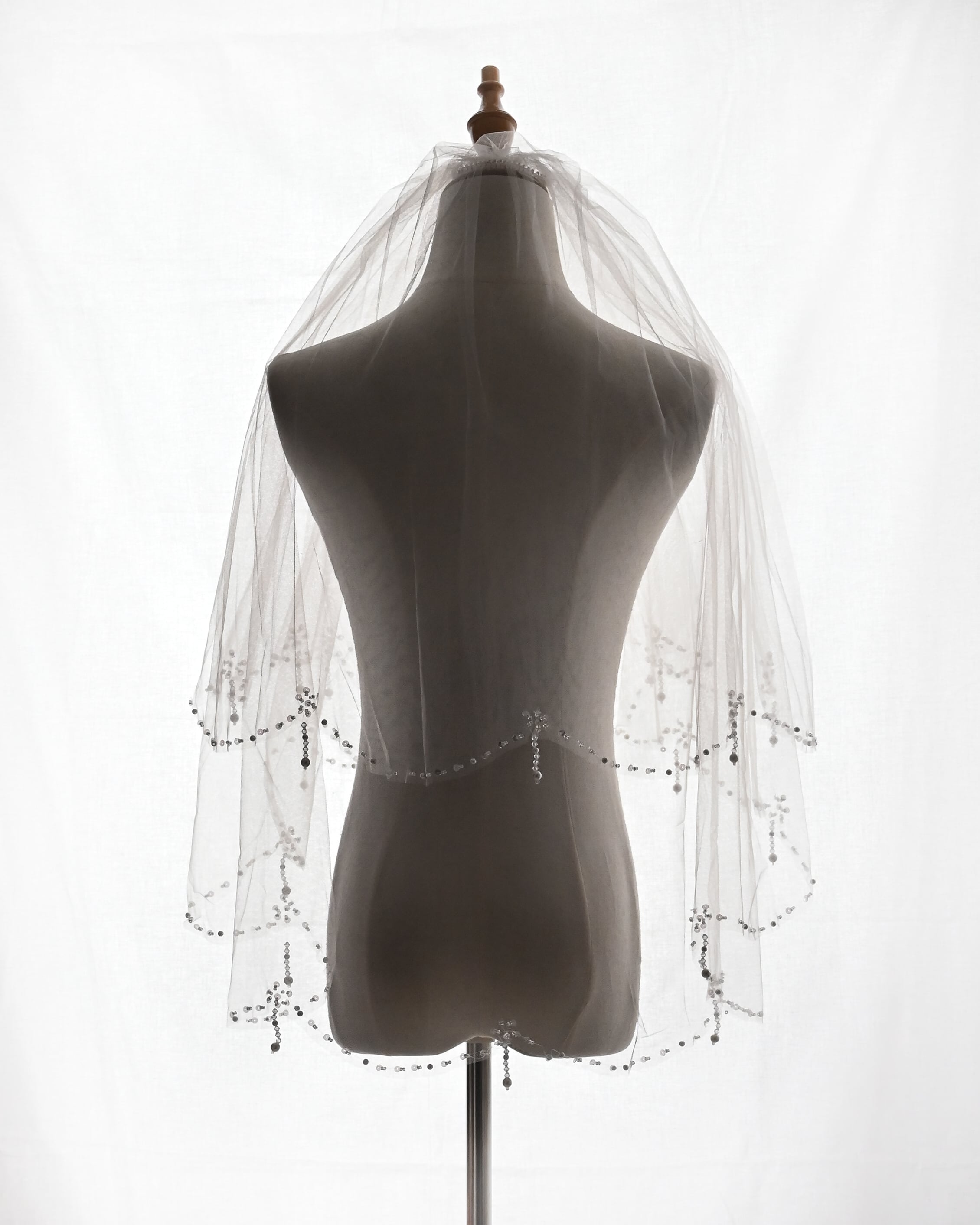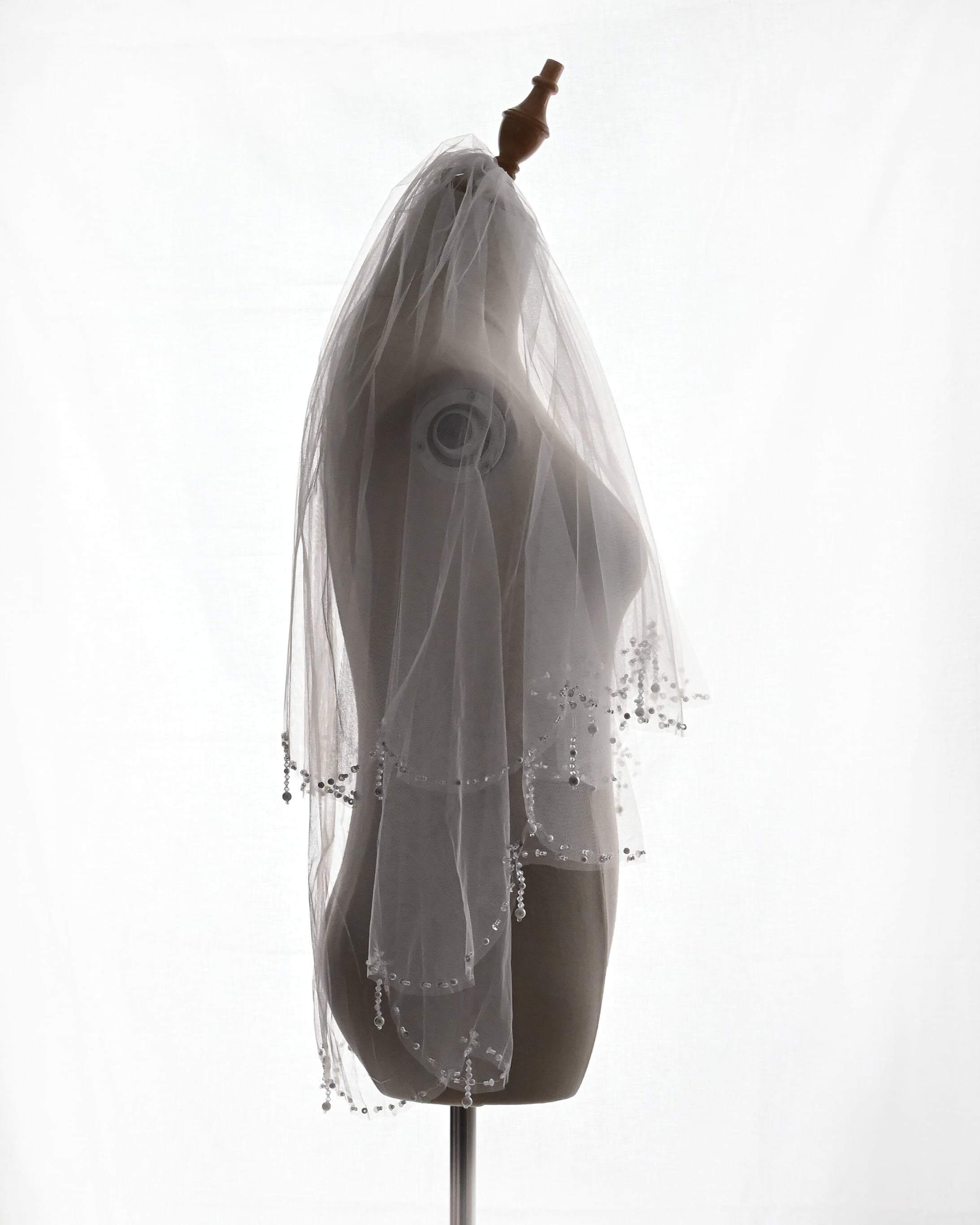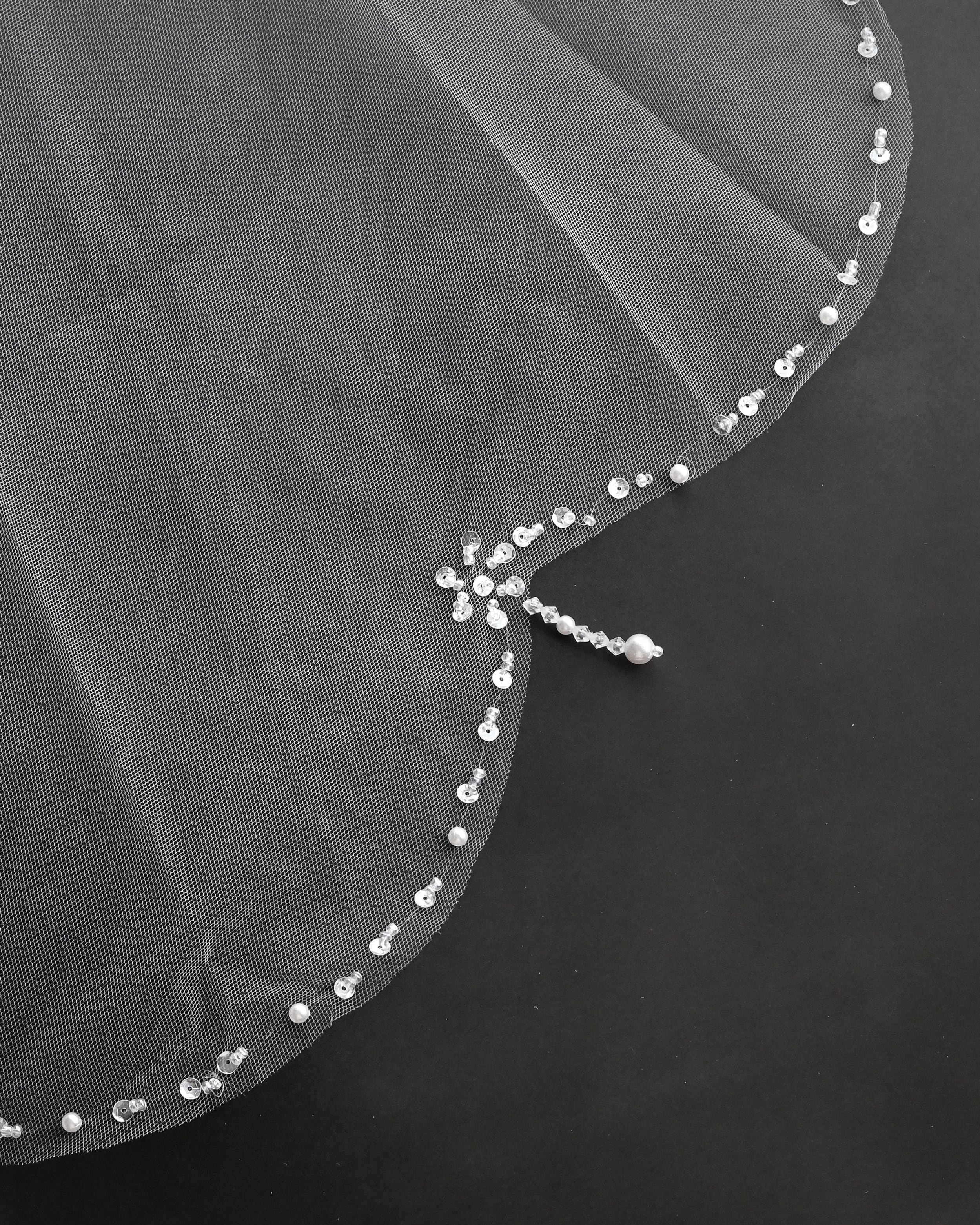 繊細なチュールの縁を、パールとスパンコールで一粒ずつ丁寧に縁取ったショートベール。