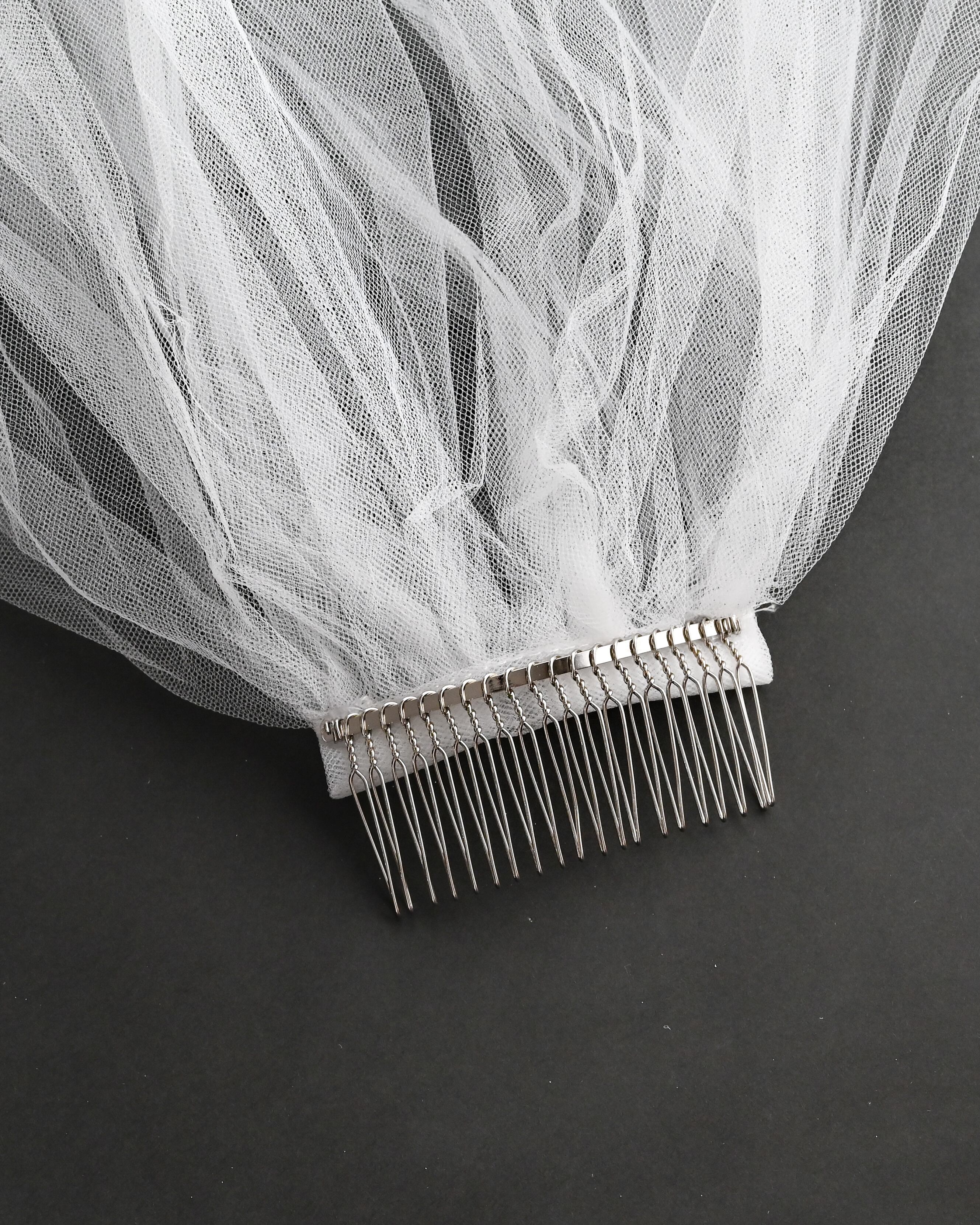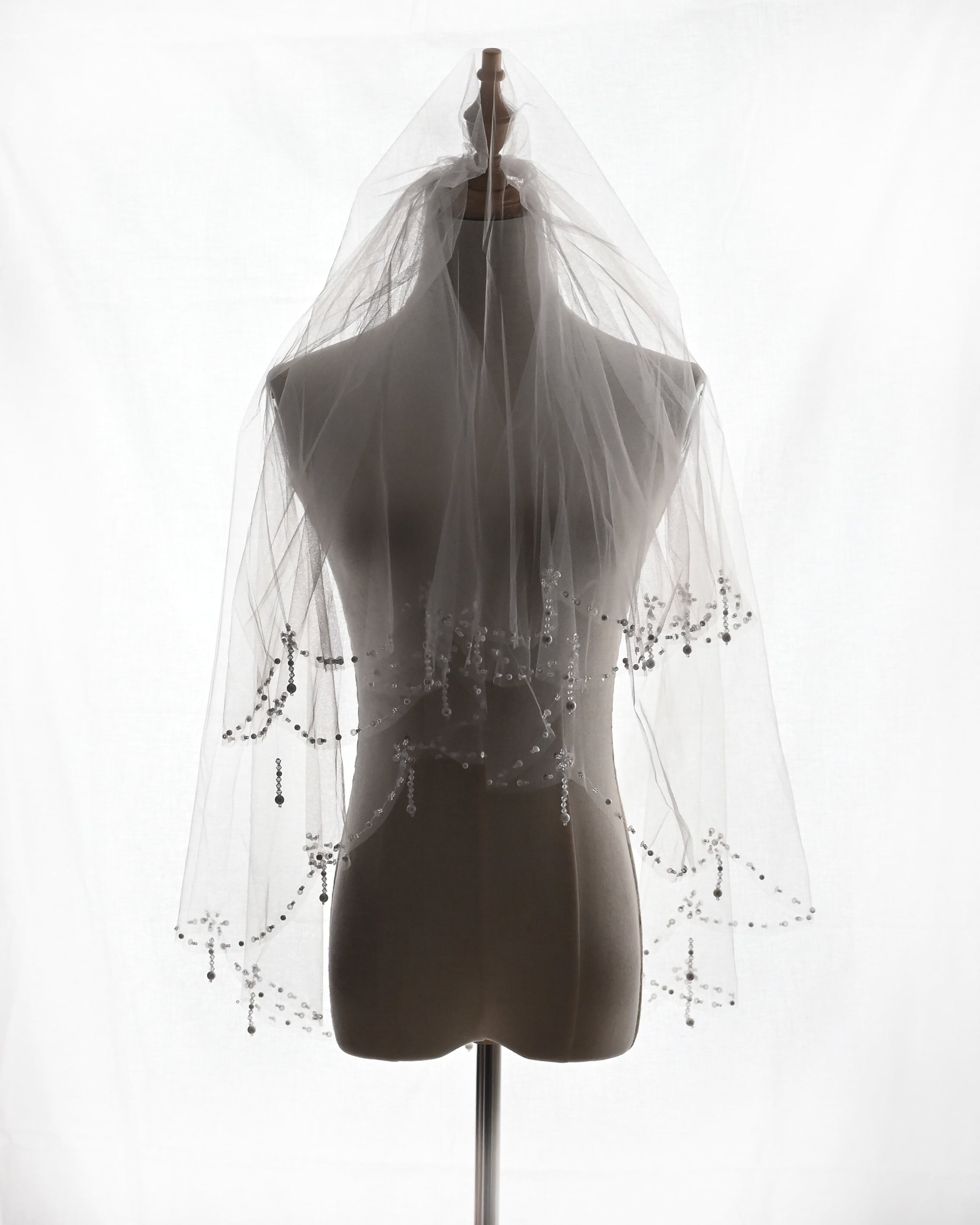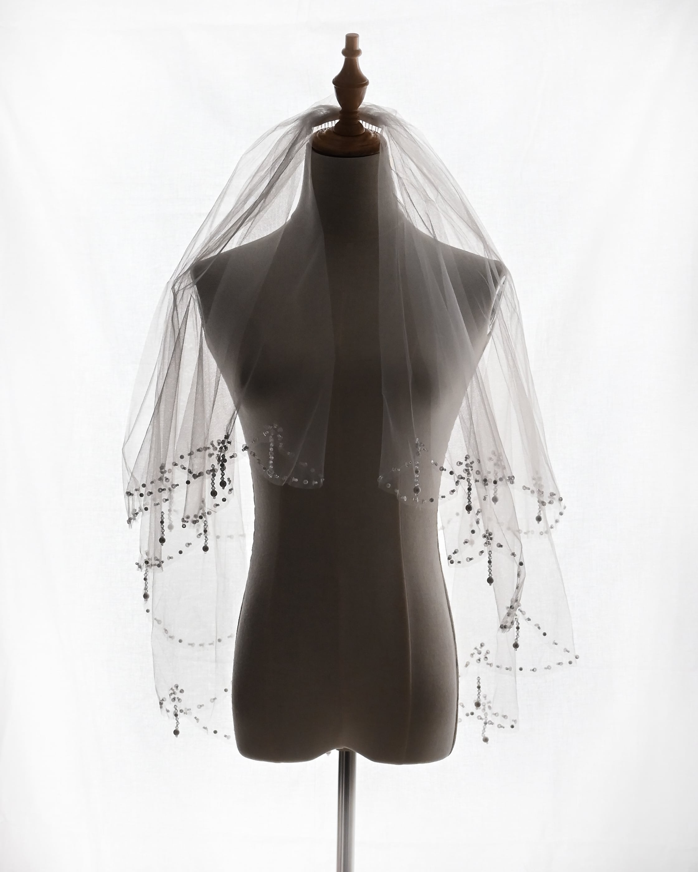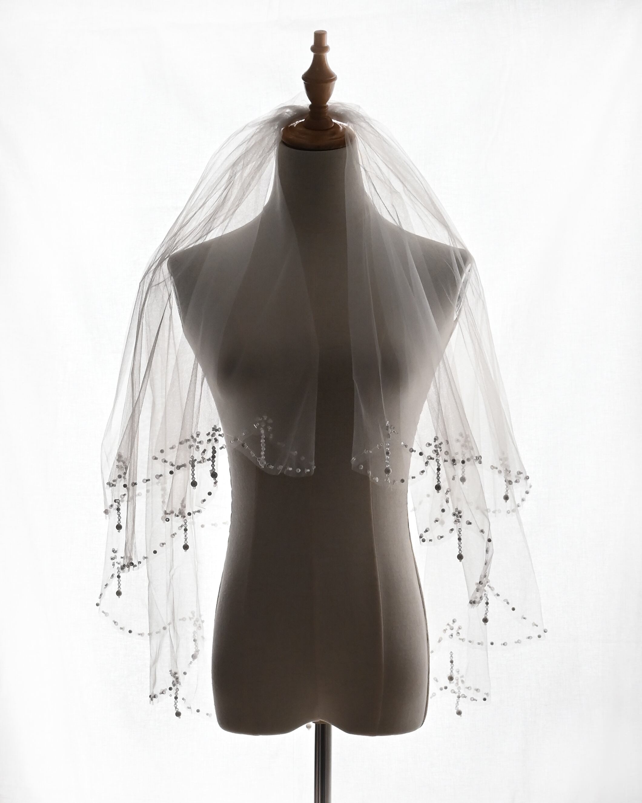 繊細なチュールの縁を、パールとスパンコールで一粒ずつ丁寧に縁取ったショートベール。