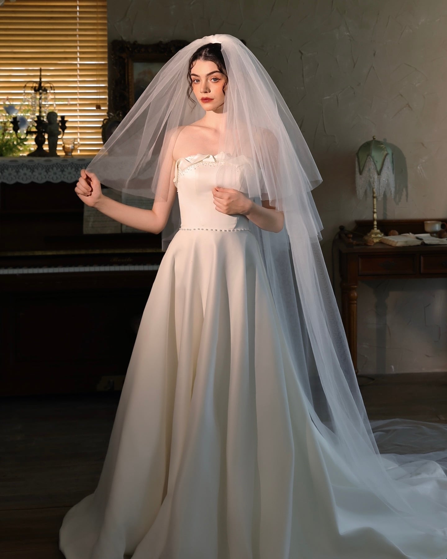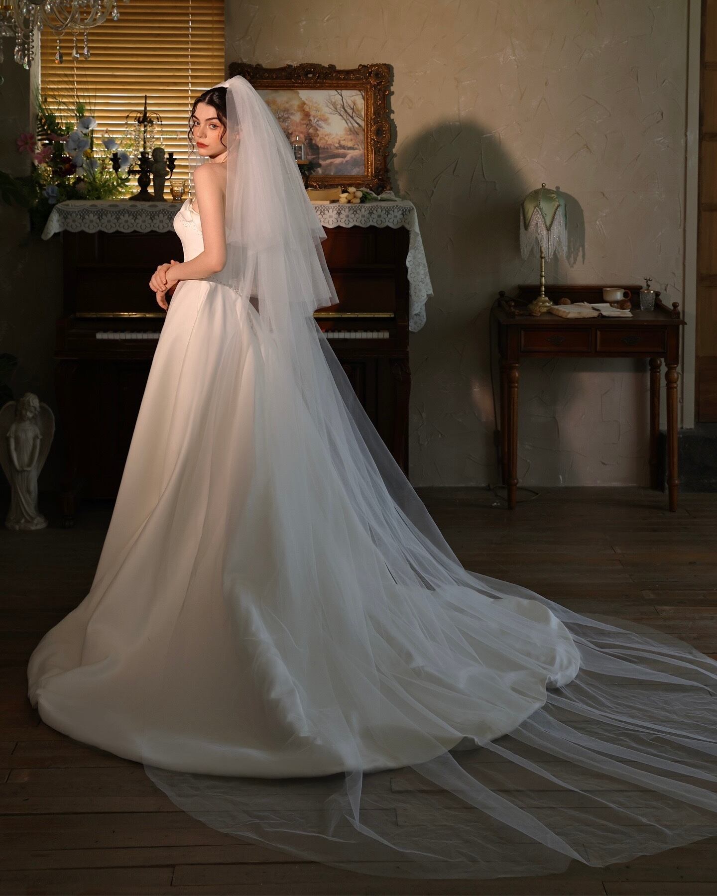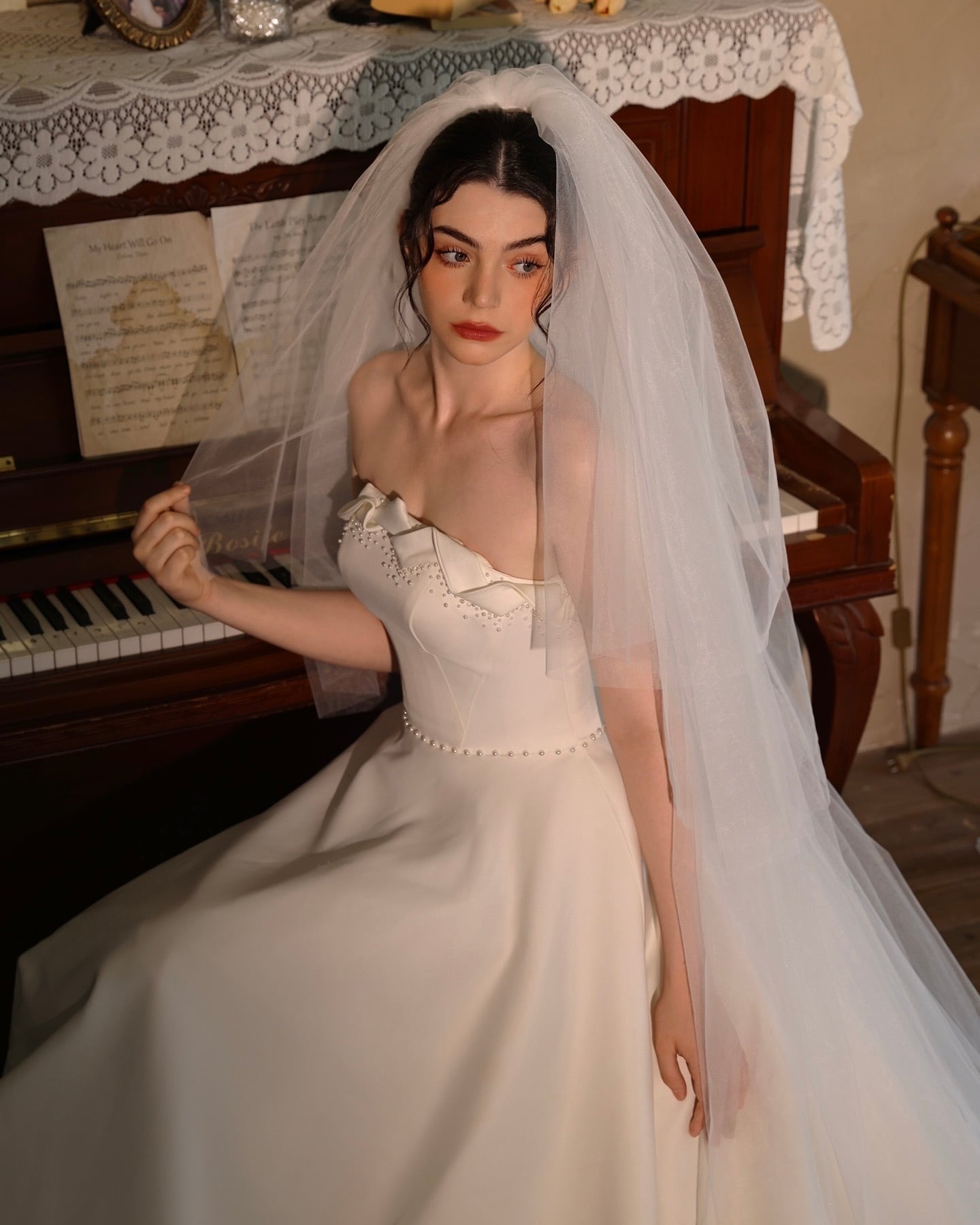透明感のあるチュールが光を柔らかく受け止め、花嫁のシルエットをより上品に引き立てます。