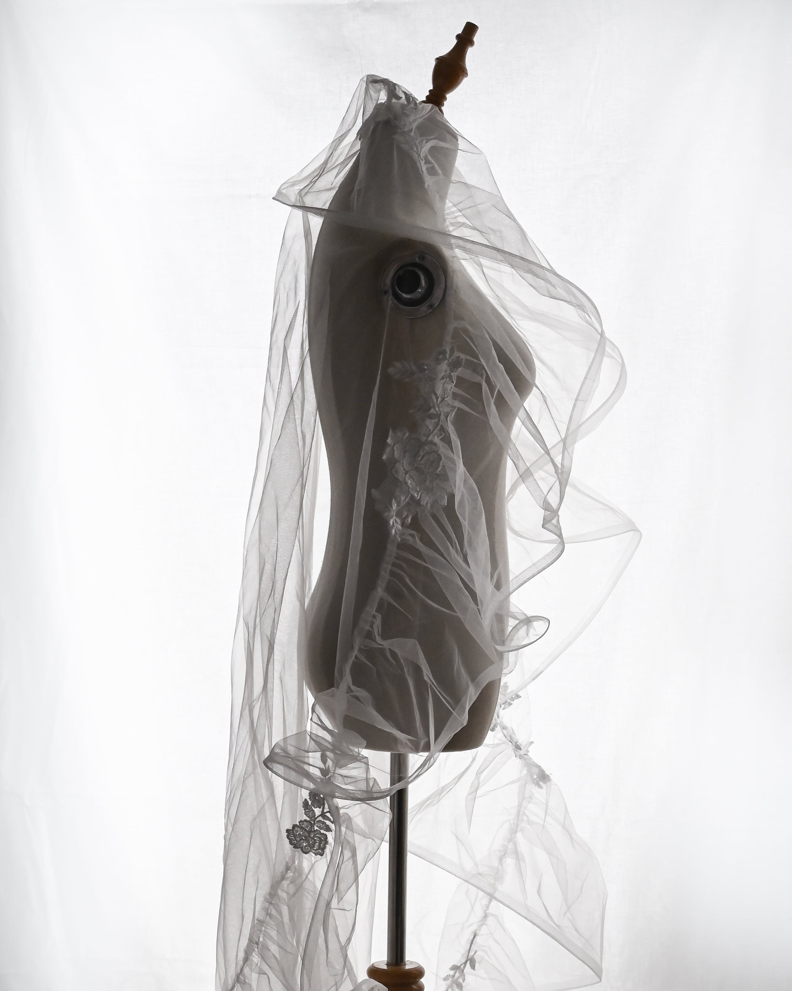やわらかなハリ感のあるチュールに、縁全体ハードチュールを重ねて仕立てたロングベール。