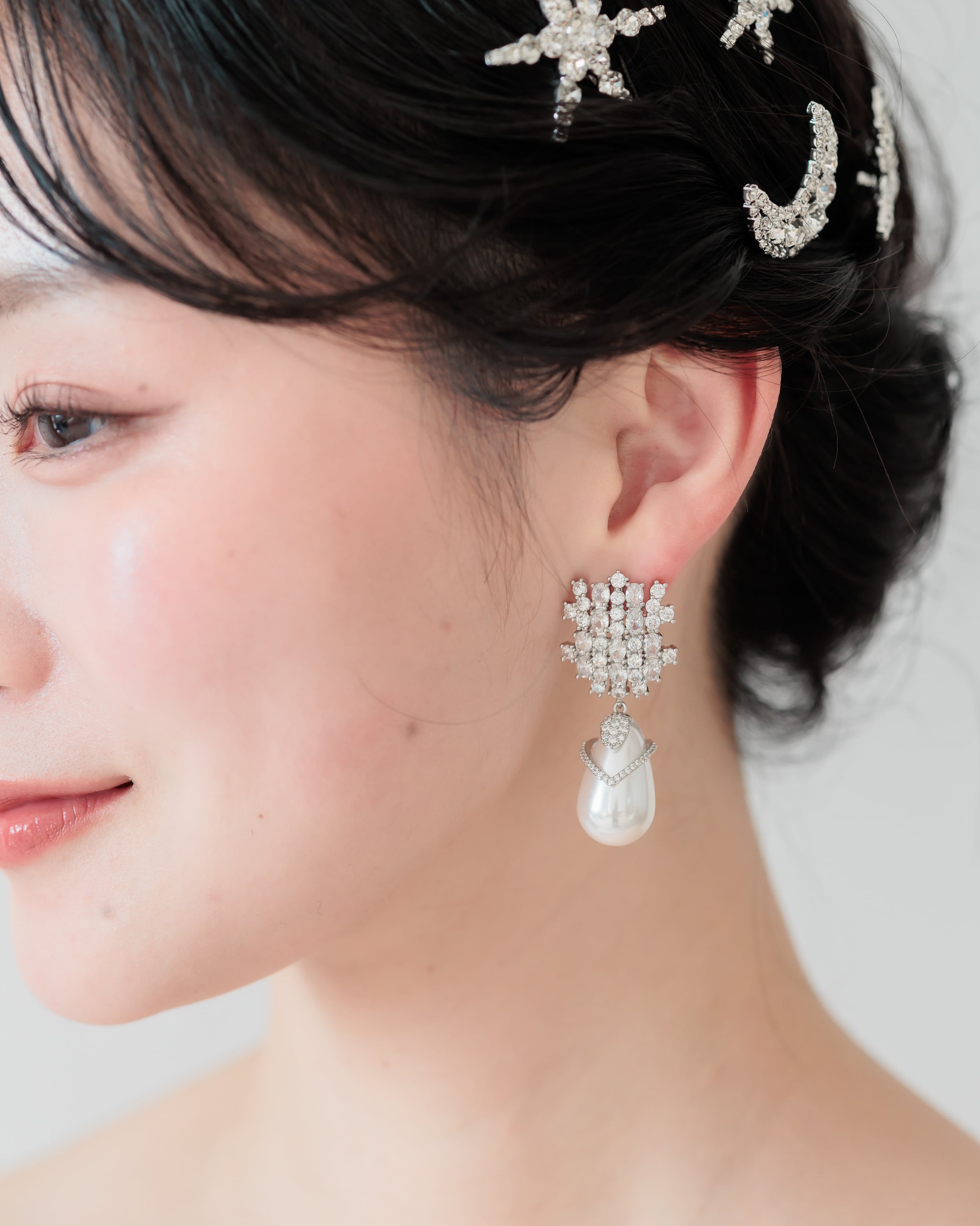 しずく型のバロックパールにはVラインのストーンがあしらわれ、角度によって異なる表情を楽しめます。