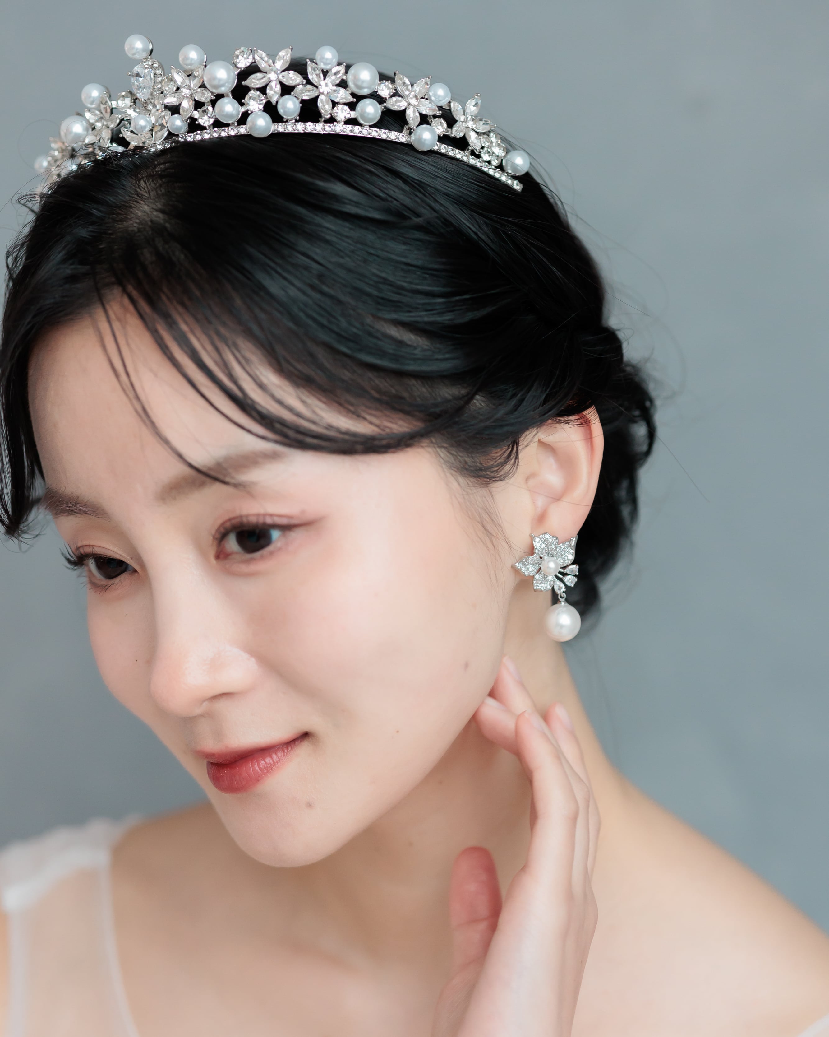 その下に揺れる大粒のパールが、光を受けるたびに優しく輝き、顔まわりに気品を添えます。