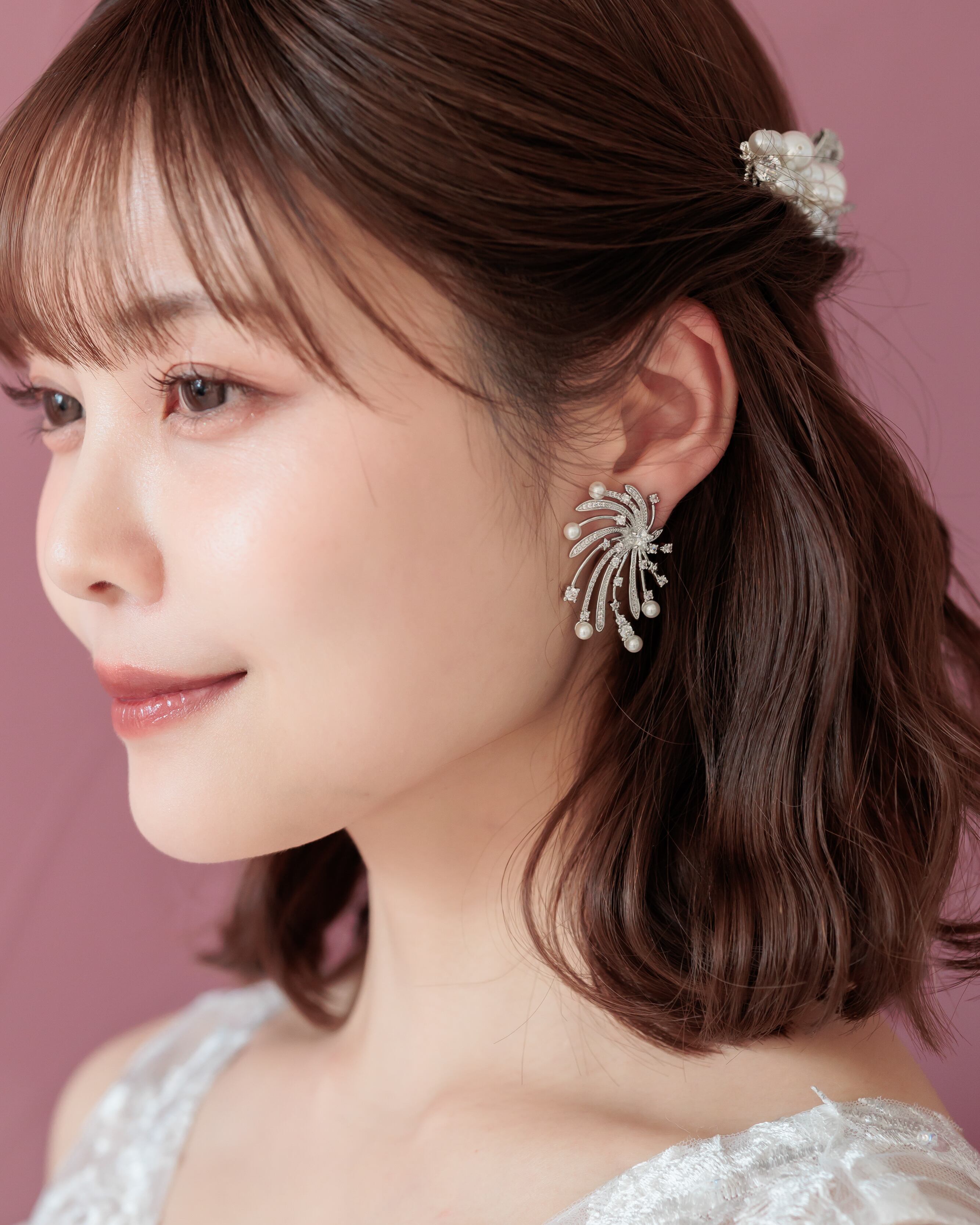 放射状に広がるジルコニアストーンが星の軌跡のように輝き、先端に配したパールが柔らかな上品さを添えます。
