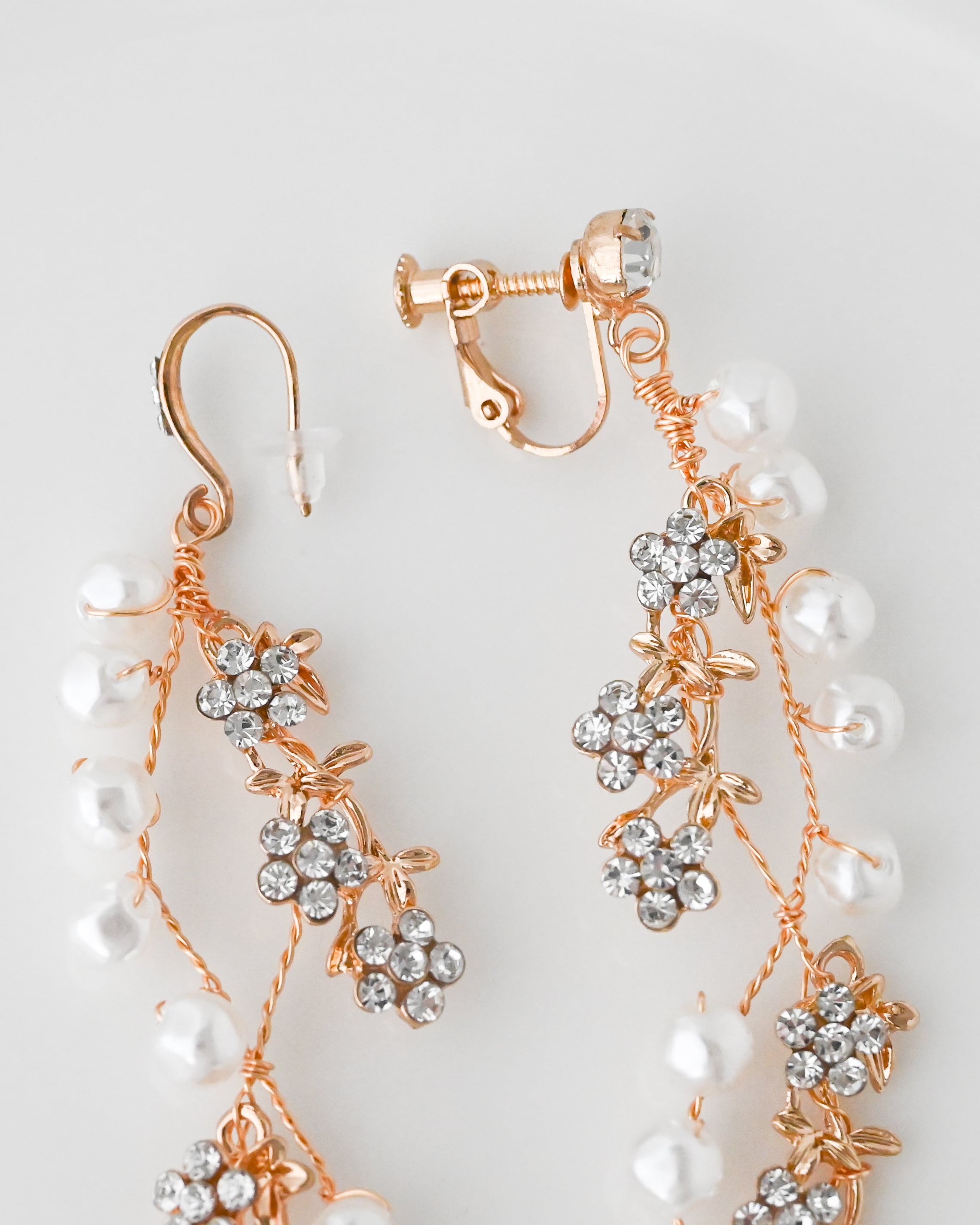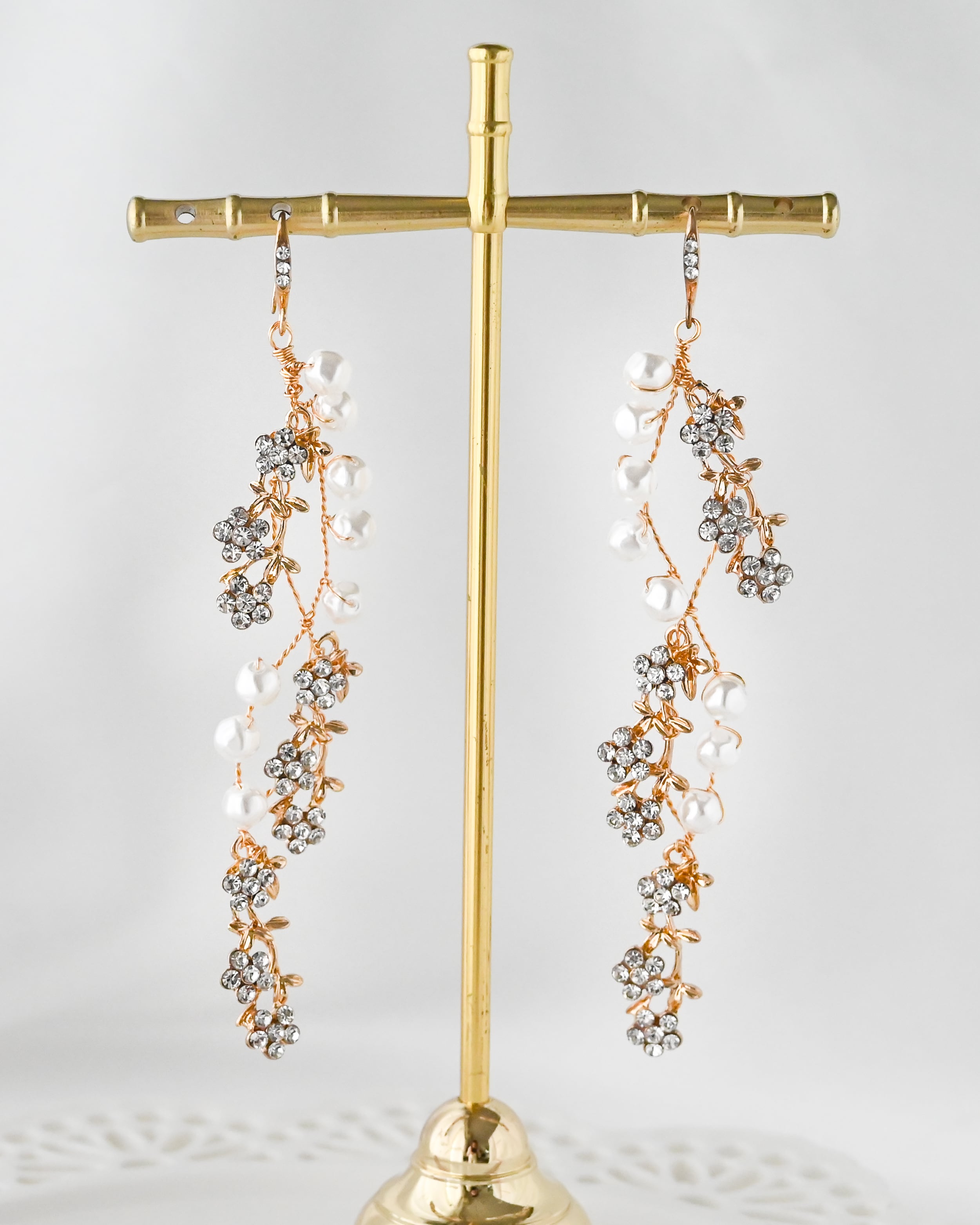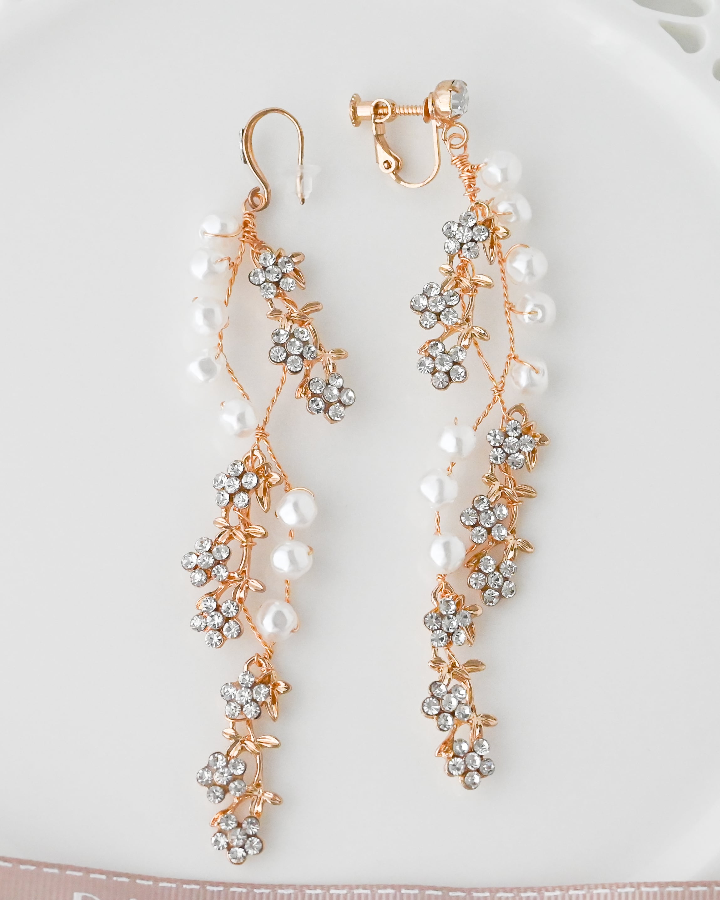 ラインストーンの小花が光を受けてきらめき、連なるパールが柔らかな上品さを添えます。