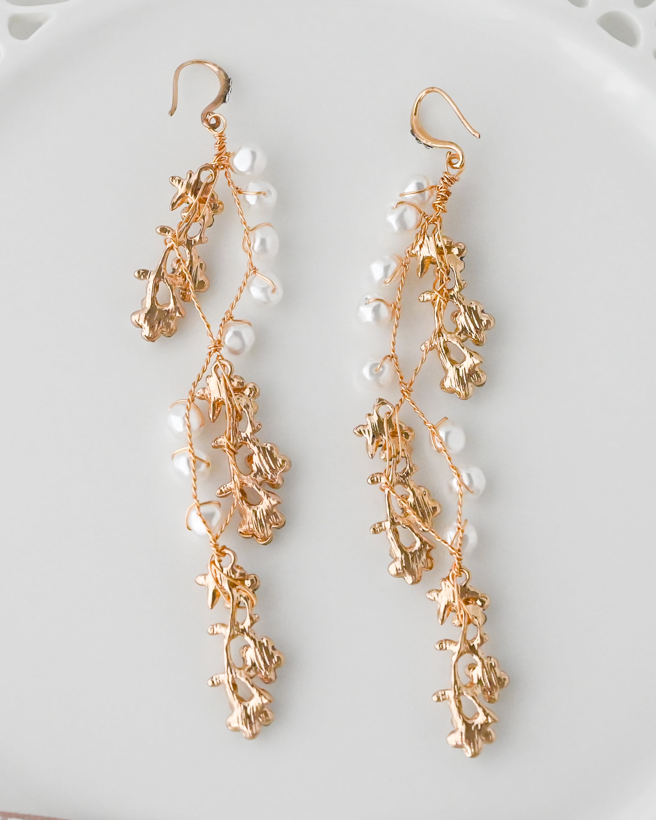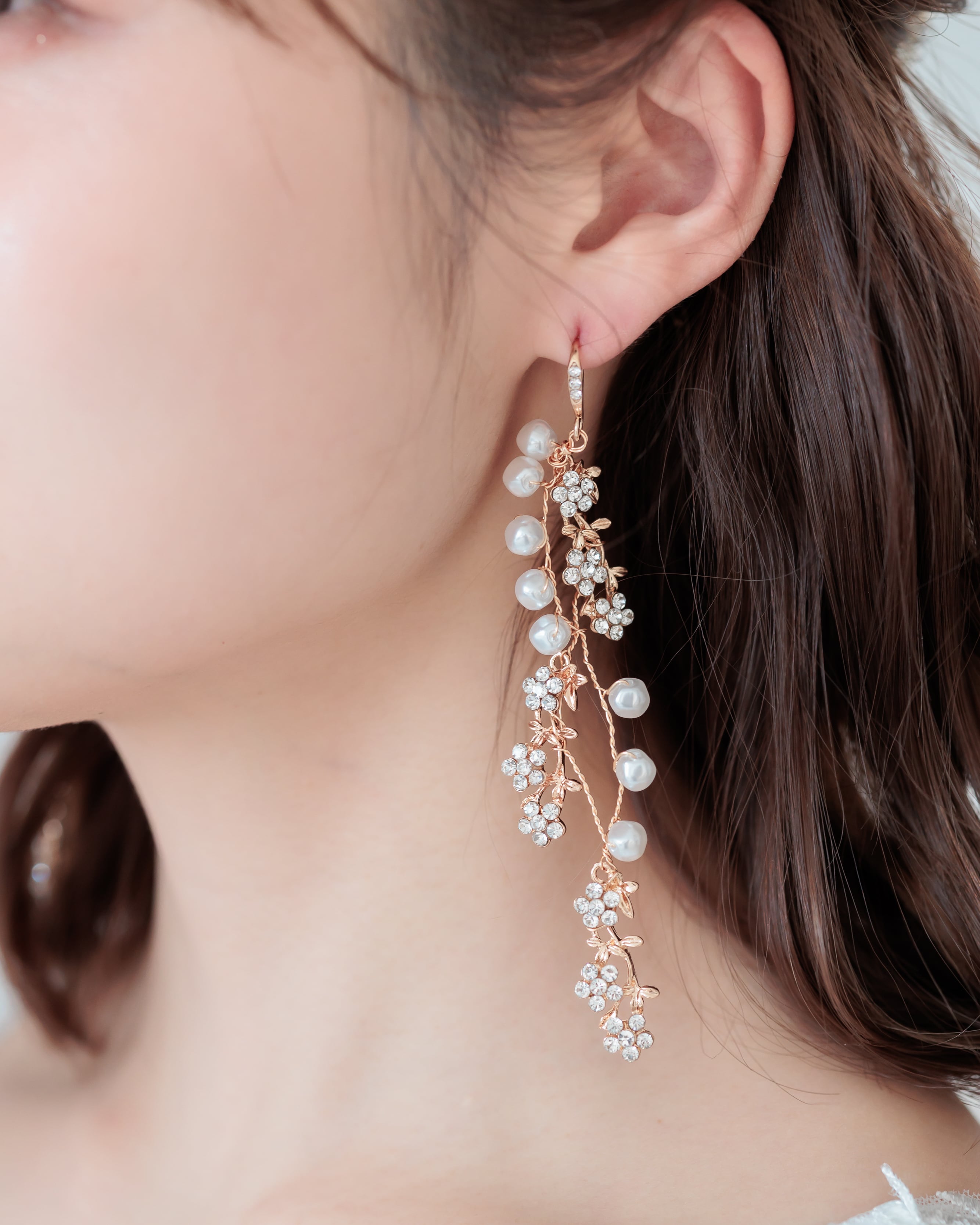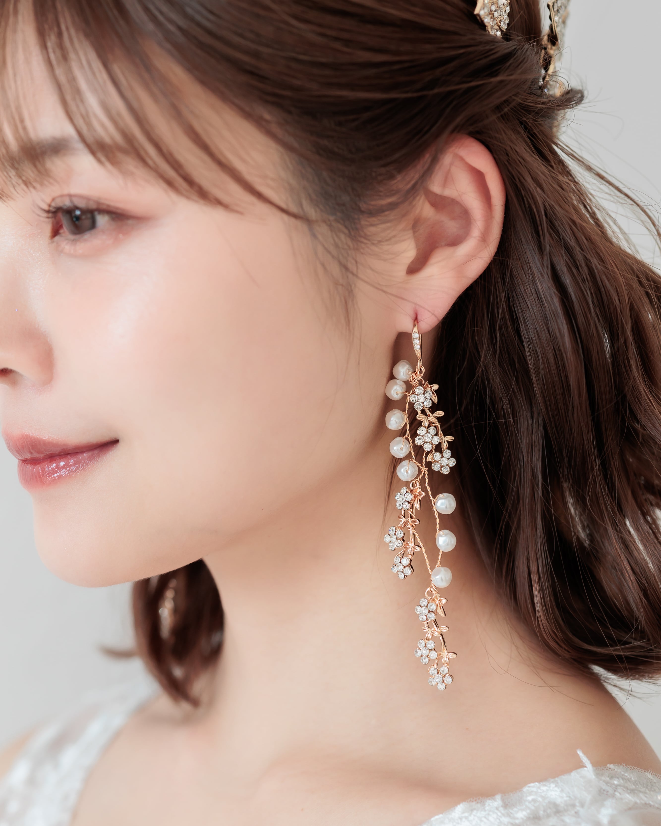 繊細なワイヤーワークで編み上げられたフラワーモチーフが連なり、軽やかに揺れるロングデザインのピアス/イヤリング。