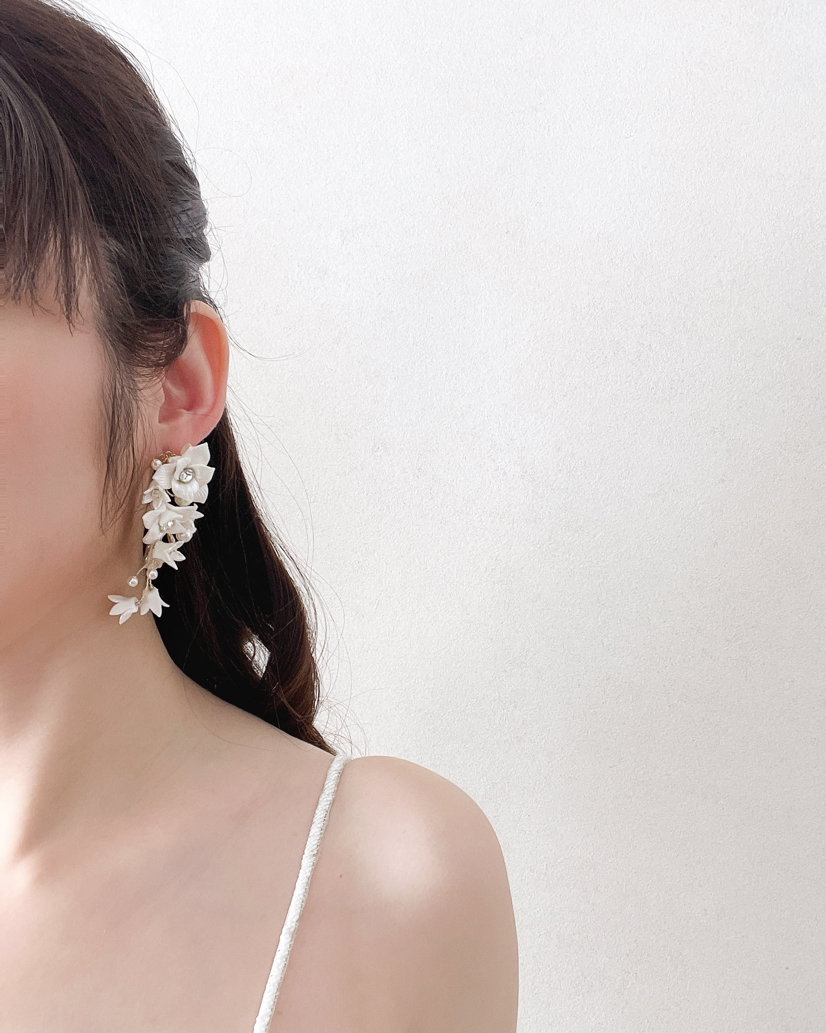 立体的に咲くホワイトフラワーが印象的な、フェミニンで華やかなデザインのビジュピアス。