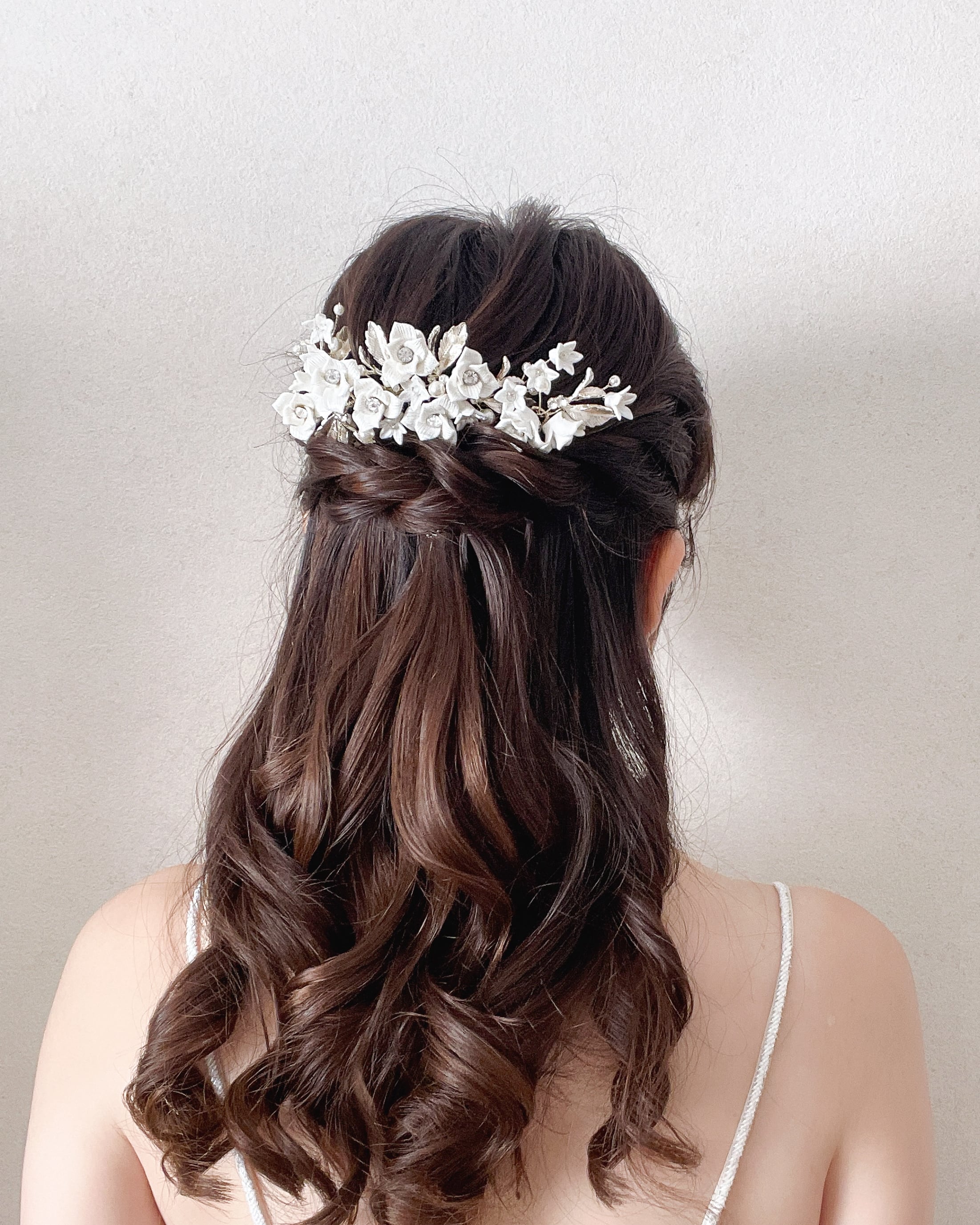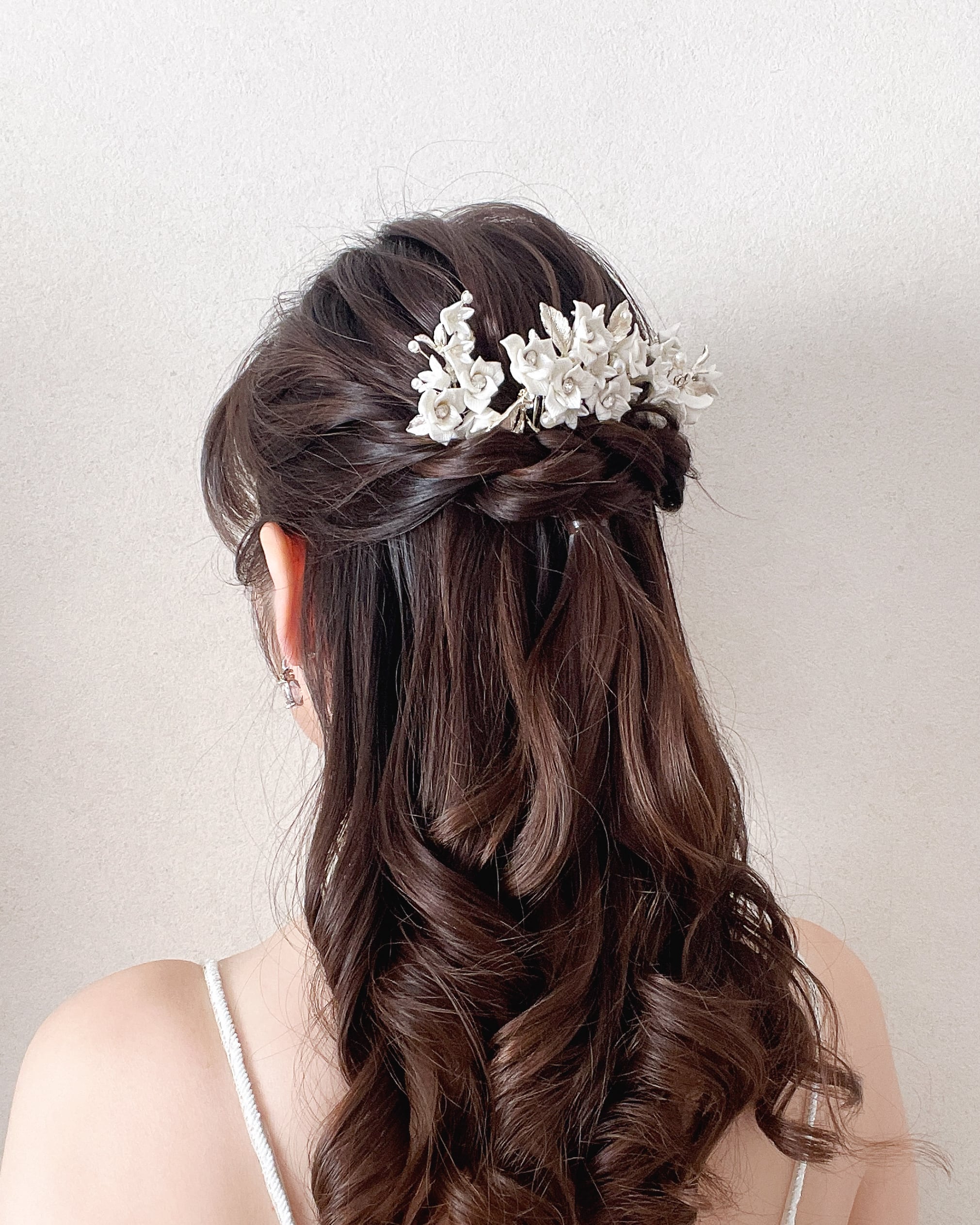立体的なホワイトフラワーにパールとリーフモチーフをあしらい、花嫁様を華やかに彩ります。