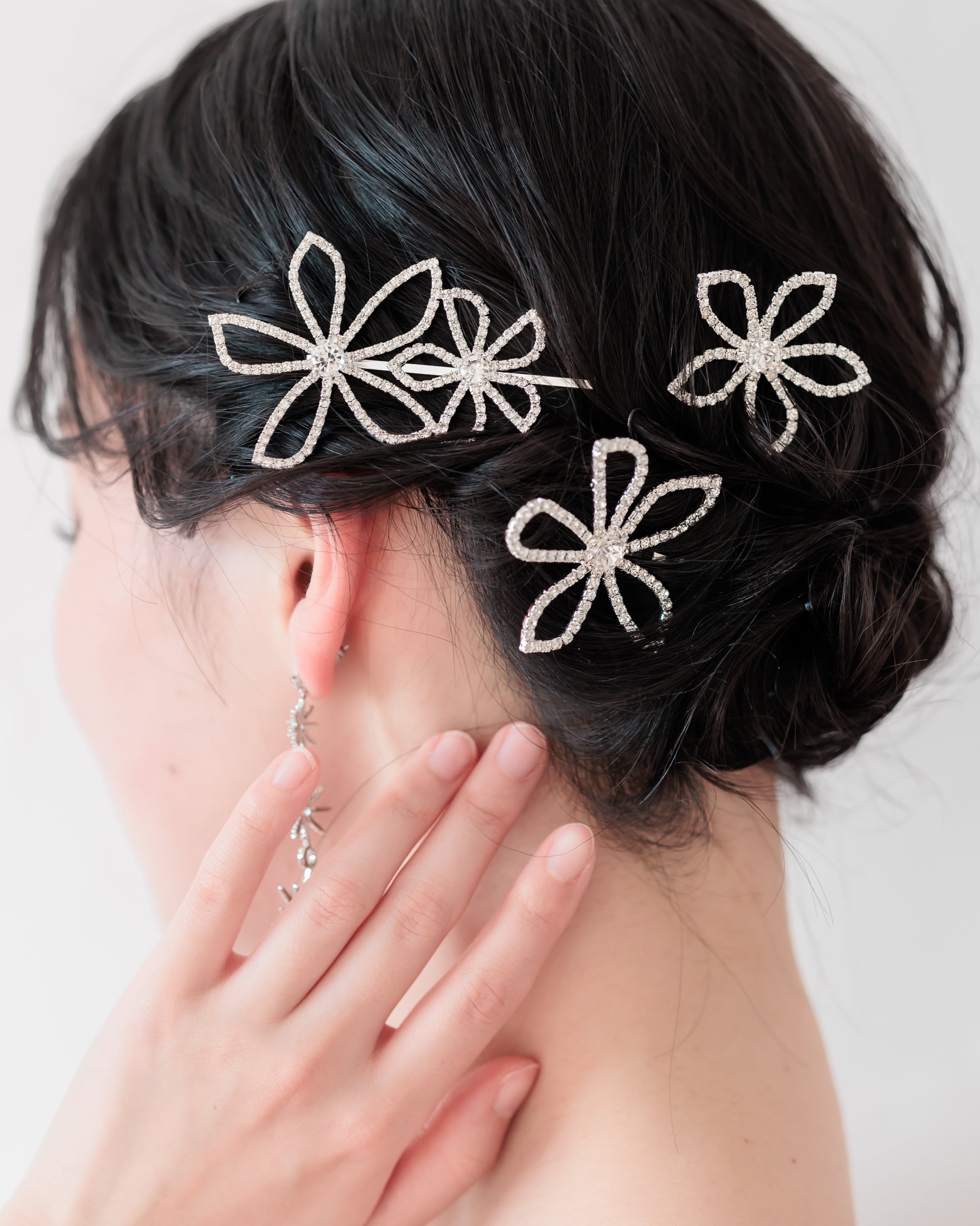 きらめくフラワーモチーフが華やかな印象を添えるヘアピン3本セット。