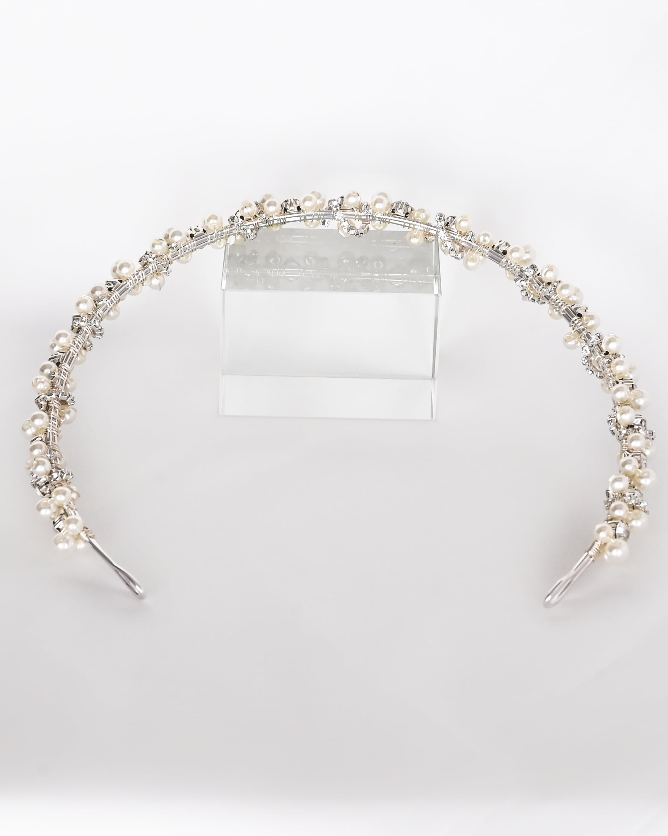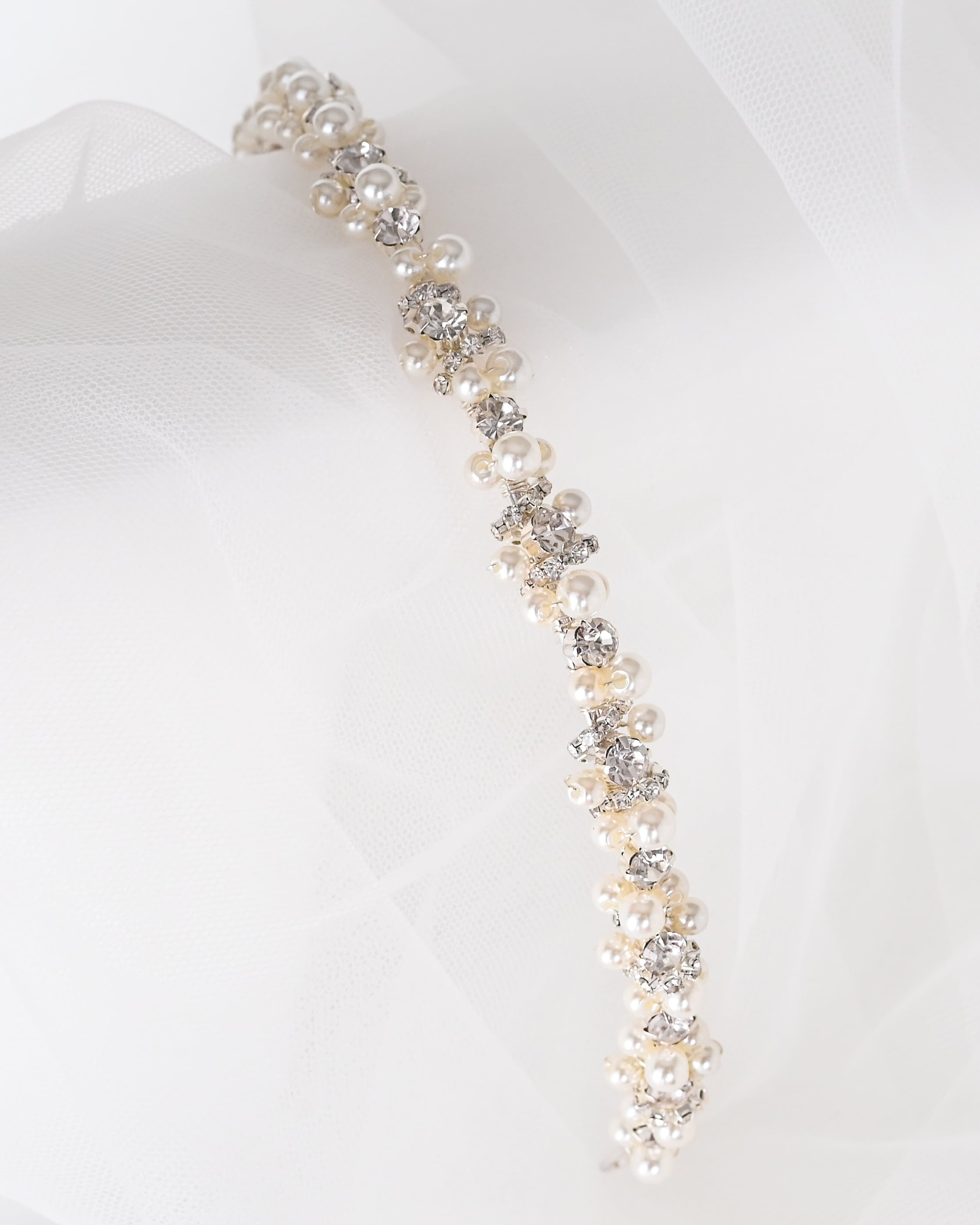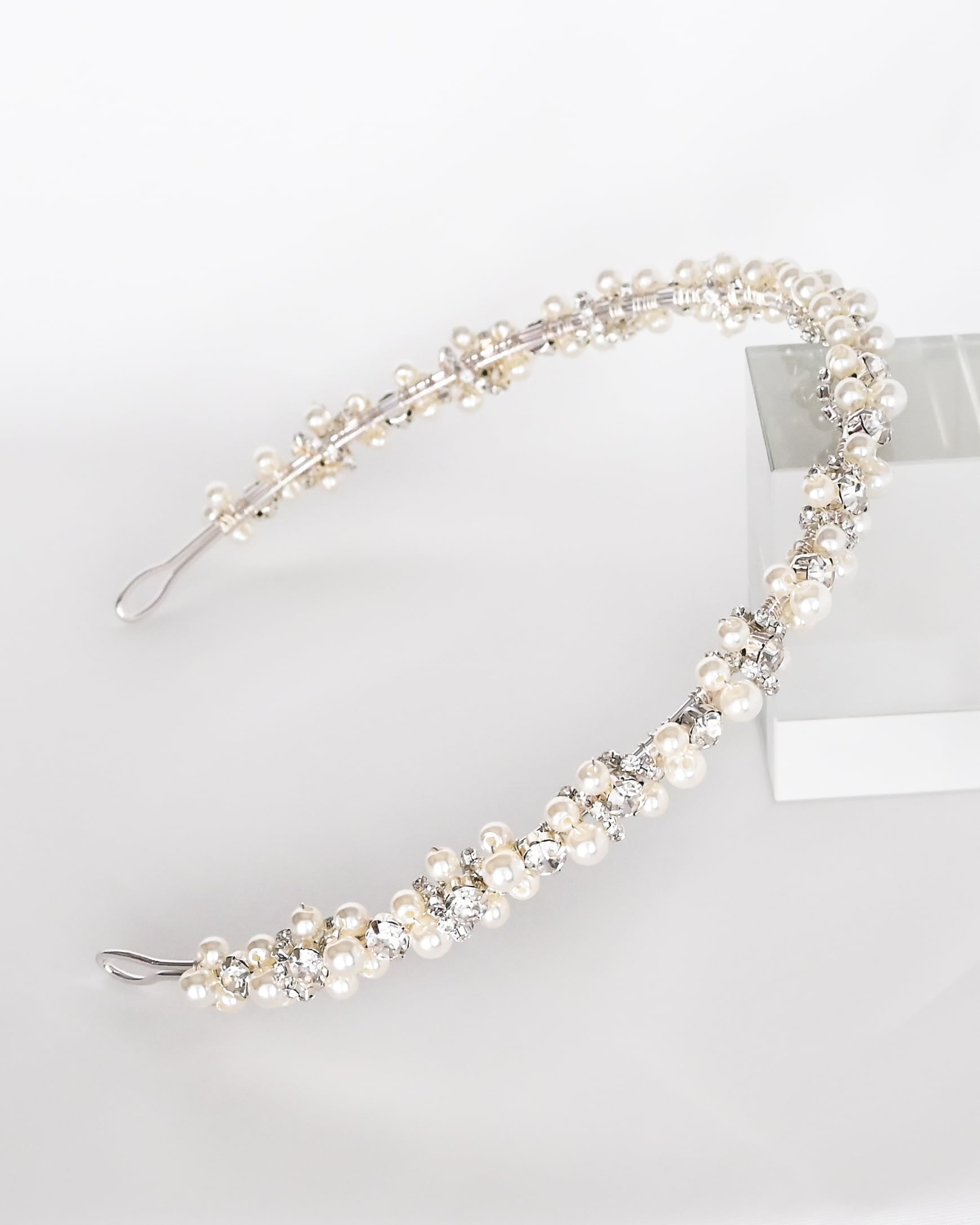繊細な輝きと上品な存在感を併せ持つ、パール×ラインストーンのブライダルカチューシャ。