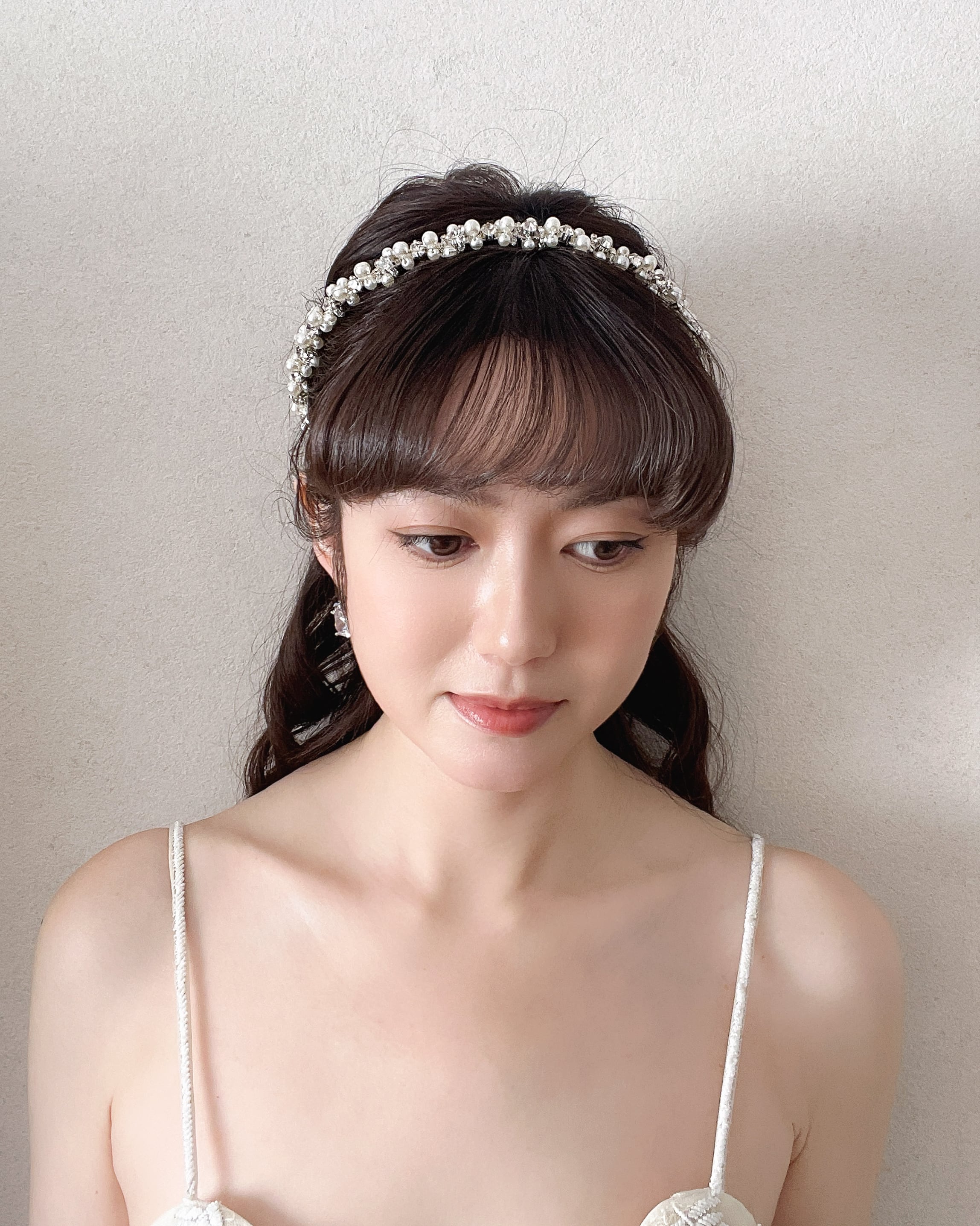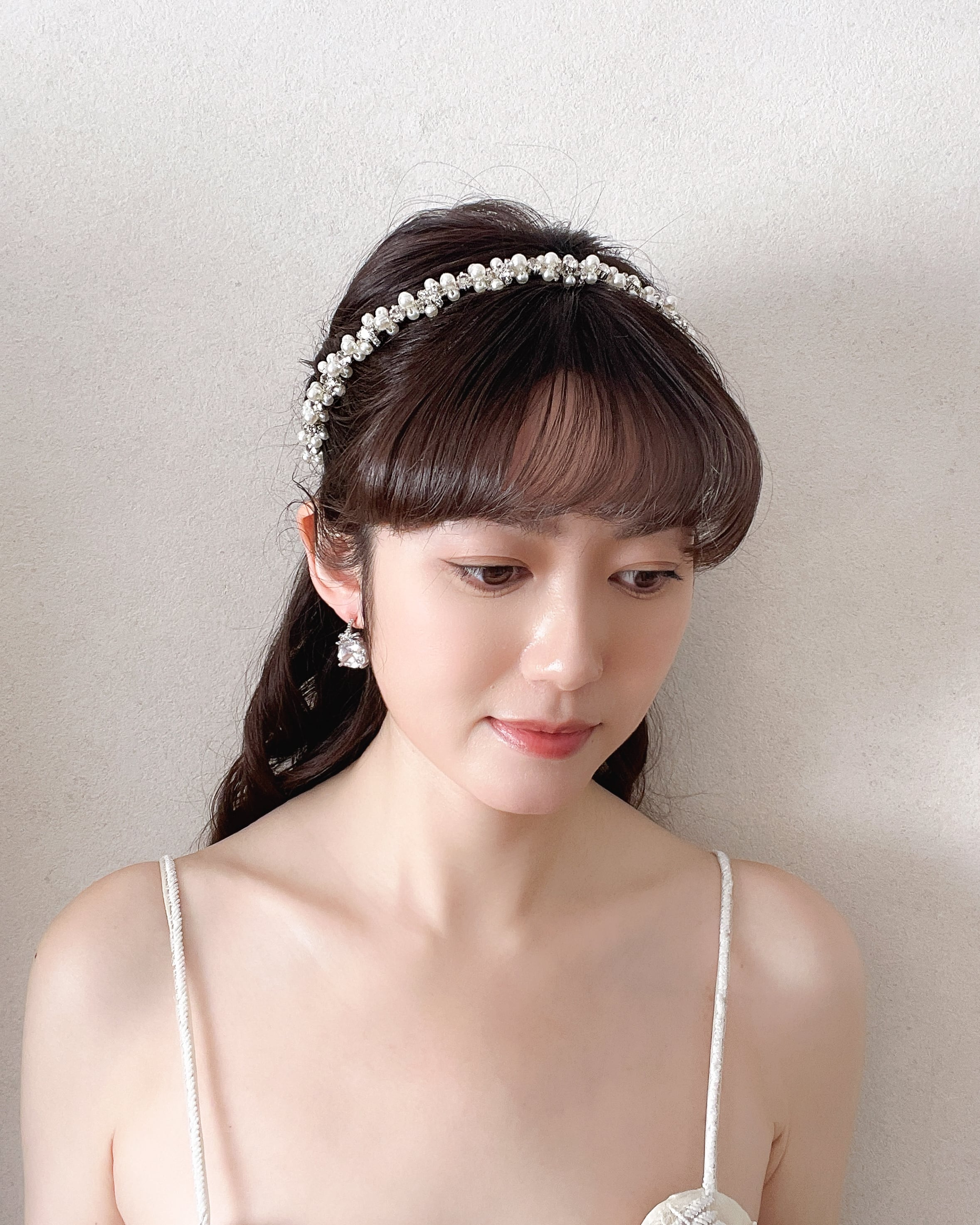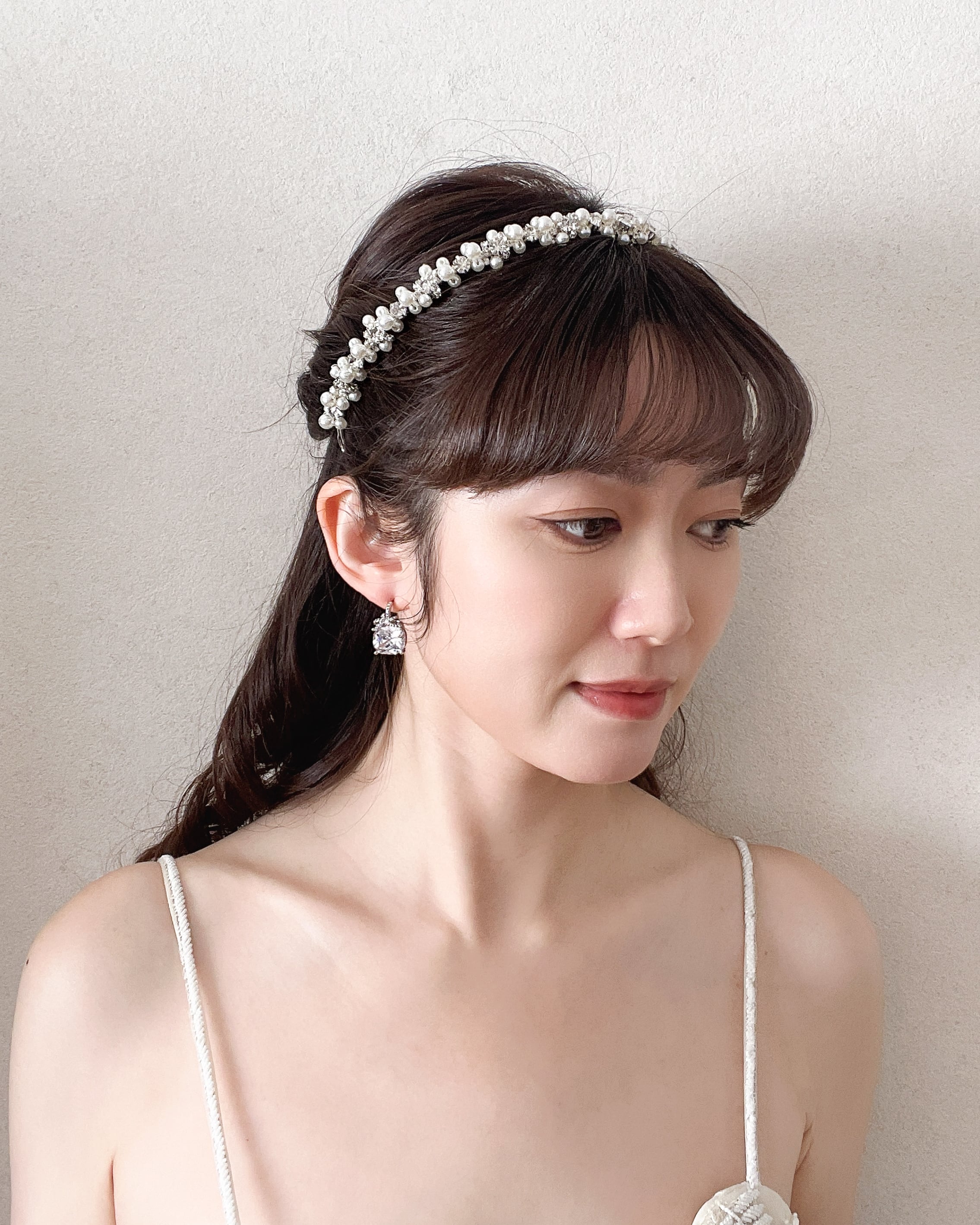 大小のパールとラインストーンビジューをリズミカルに組み合わせたデザインは、光を受けるたびに柔らかく艶めき、花嫁の表情をより美しく引き立てます。