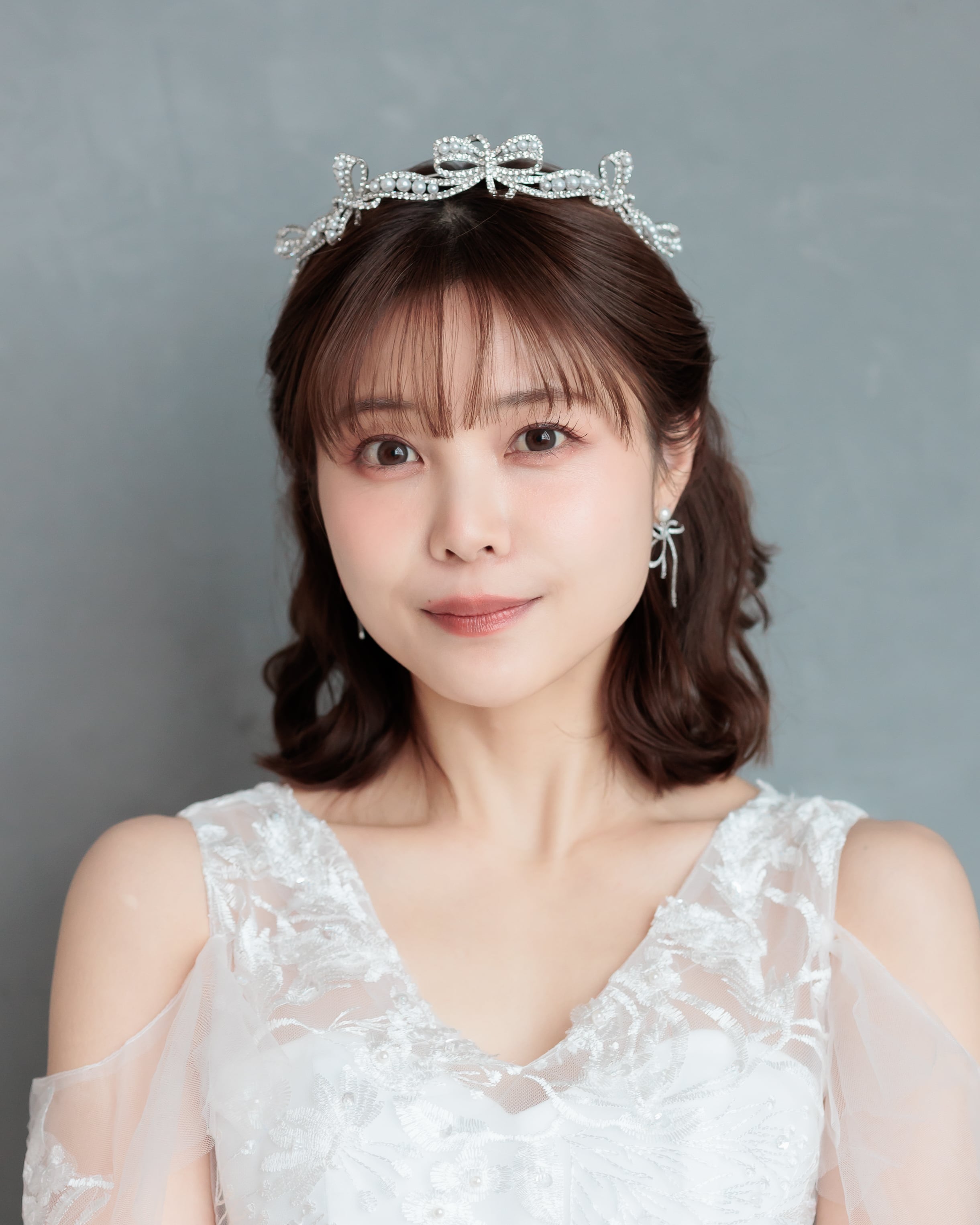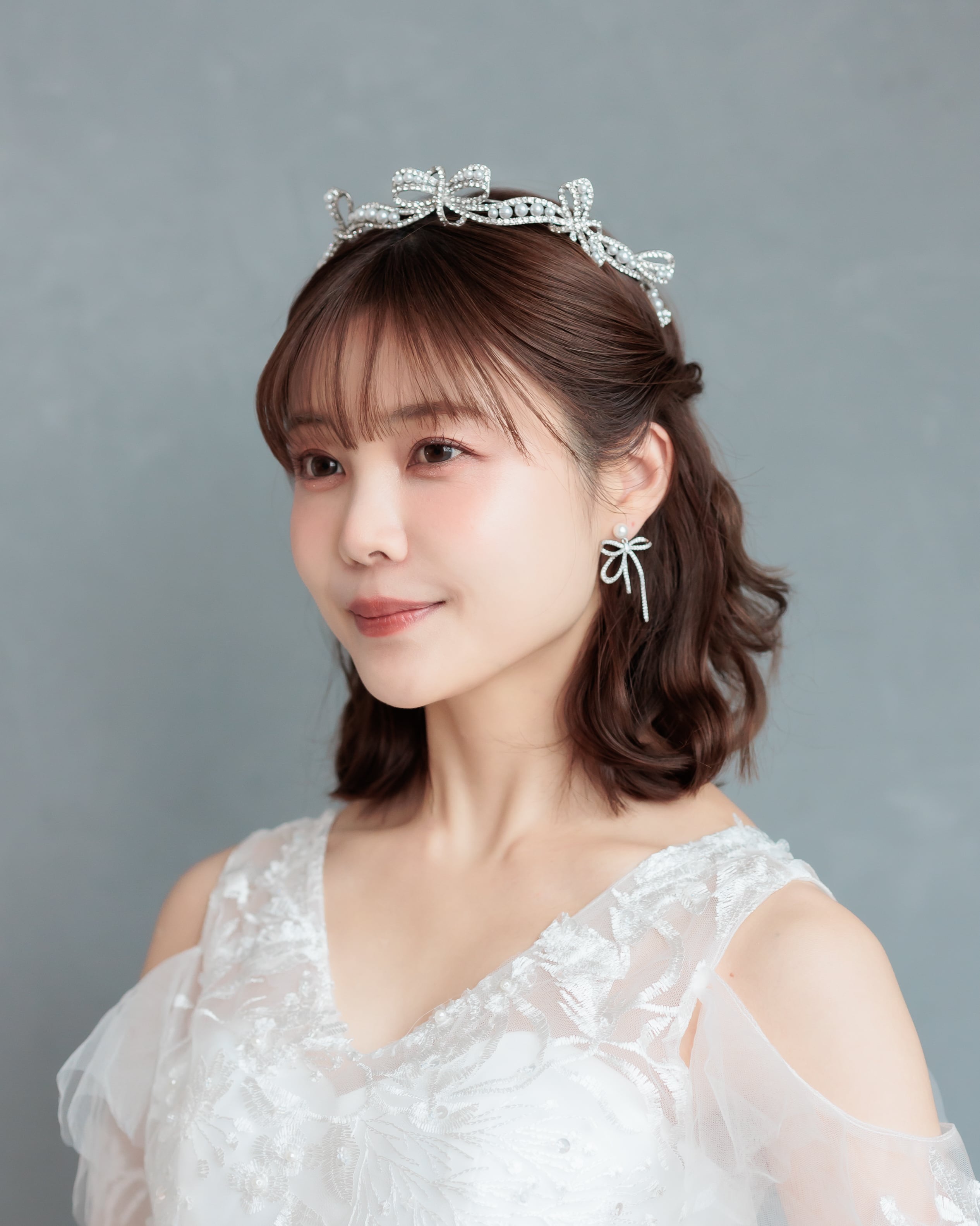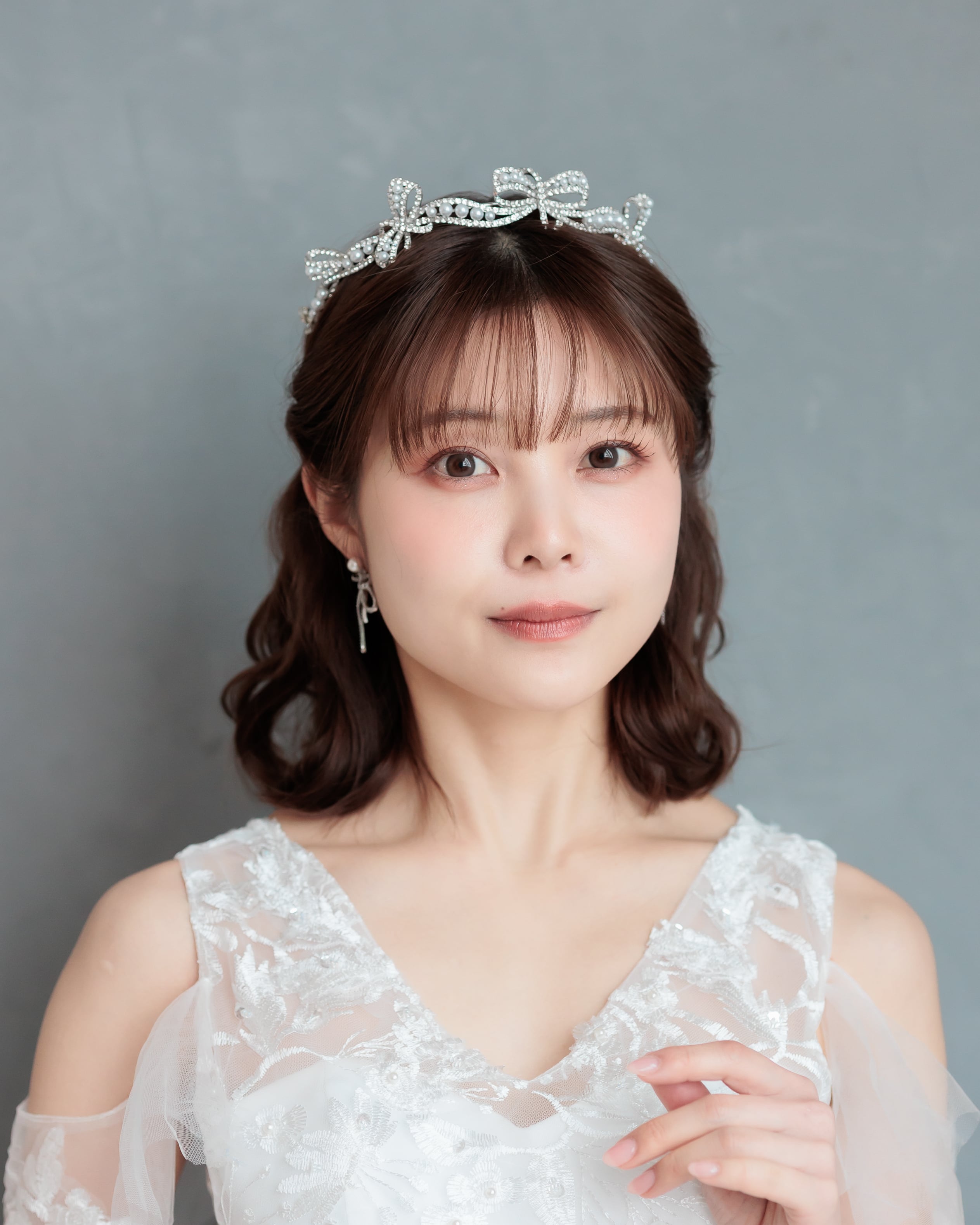 ブライダルヘアにやわらかなアクセントを添え、清楚でフェミニンな花嫁スタイルを演出します。