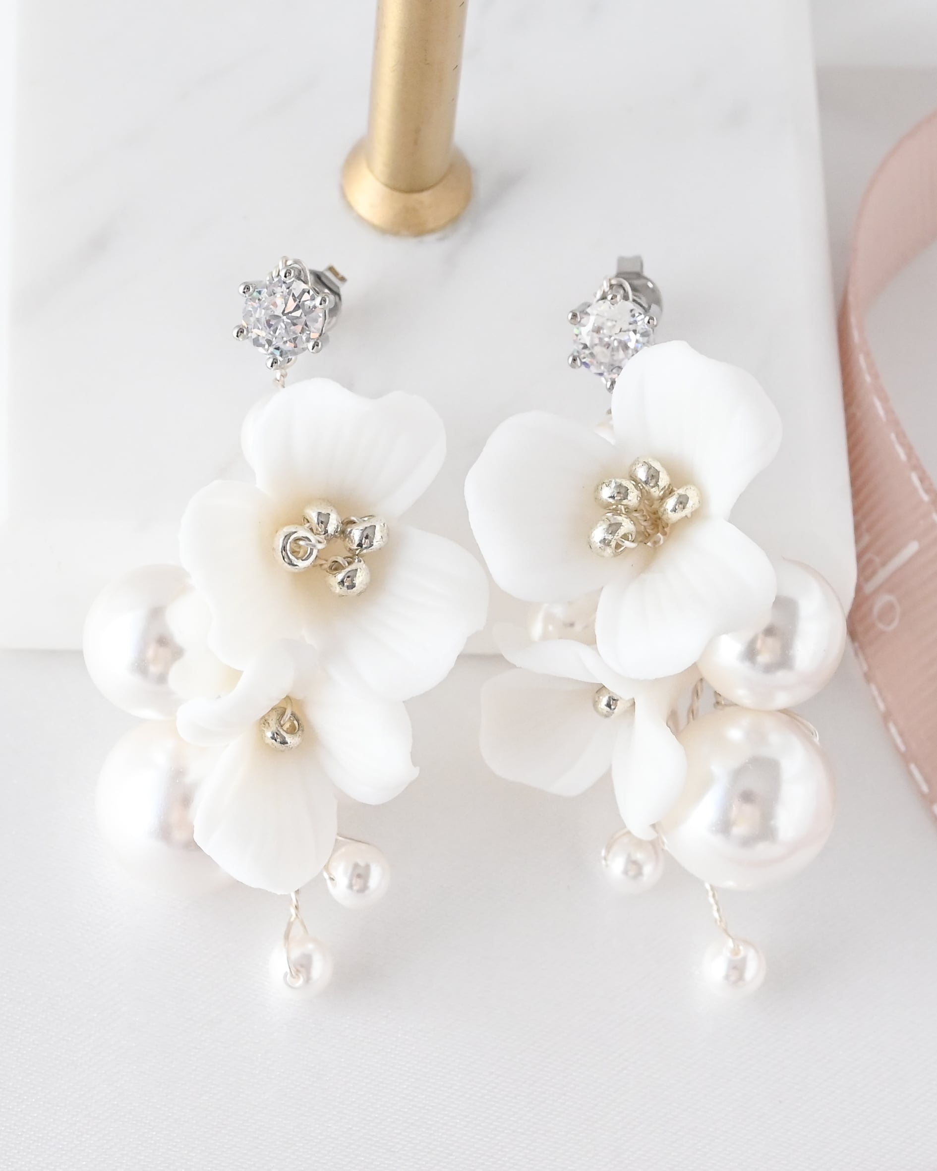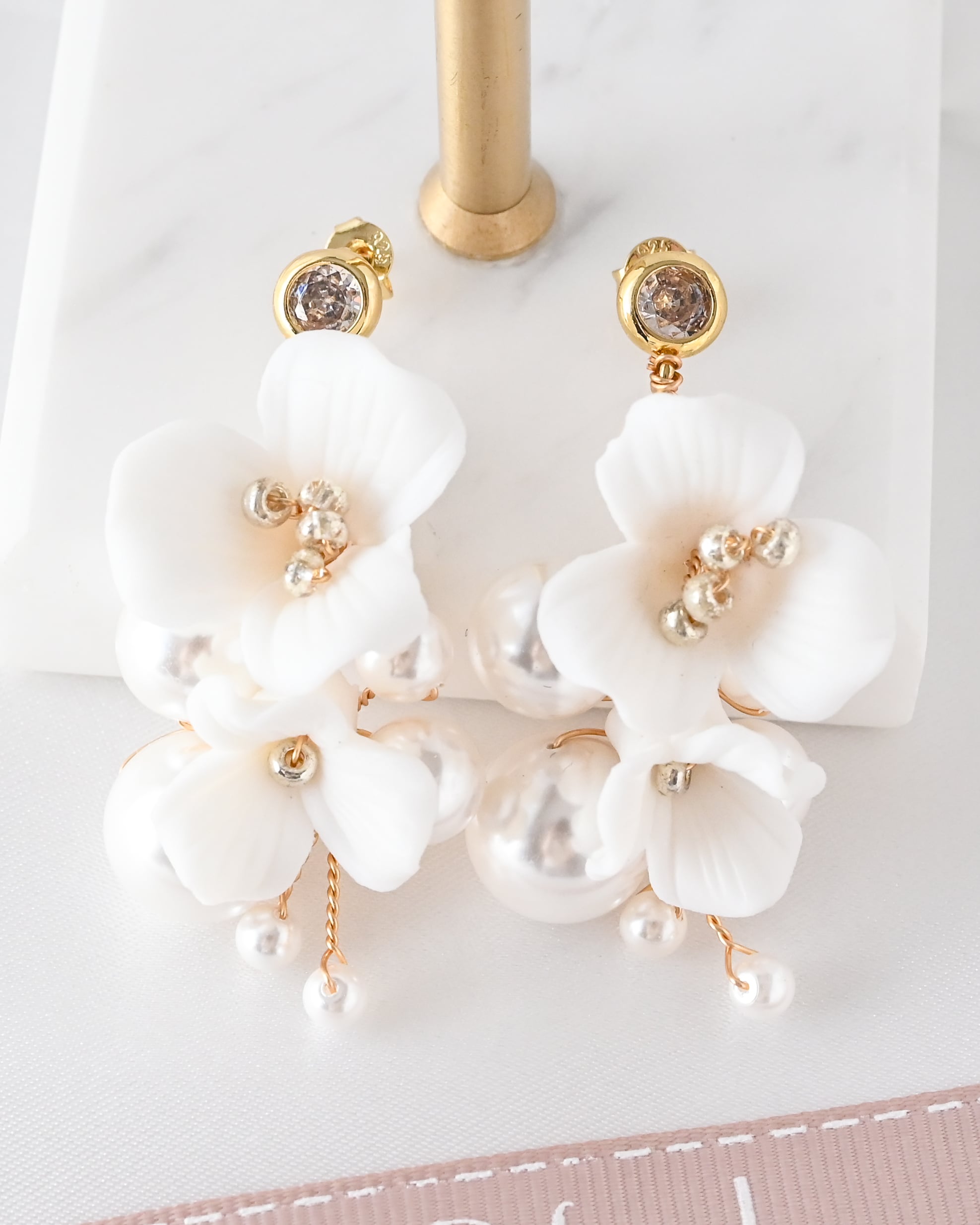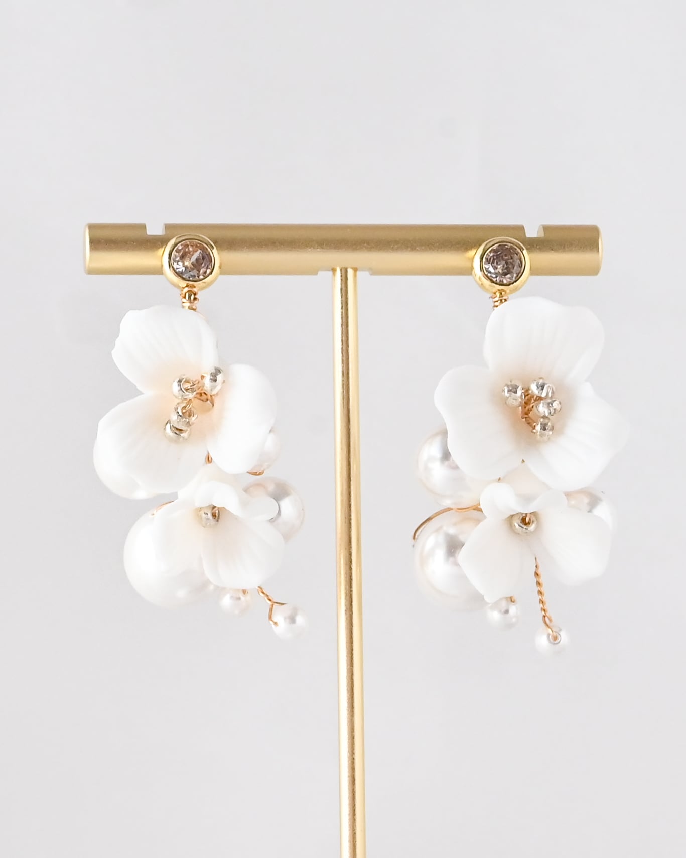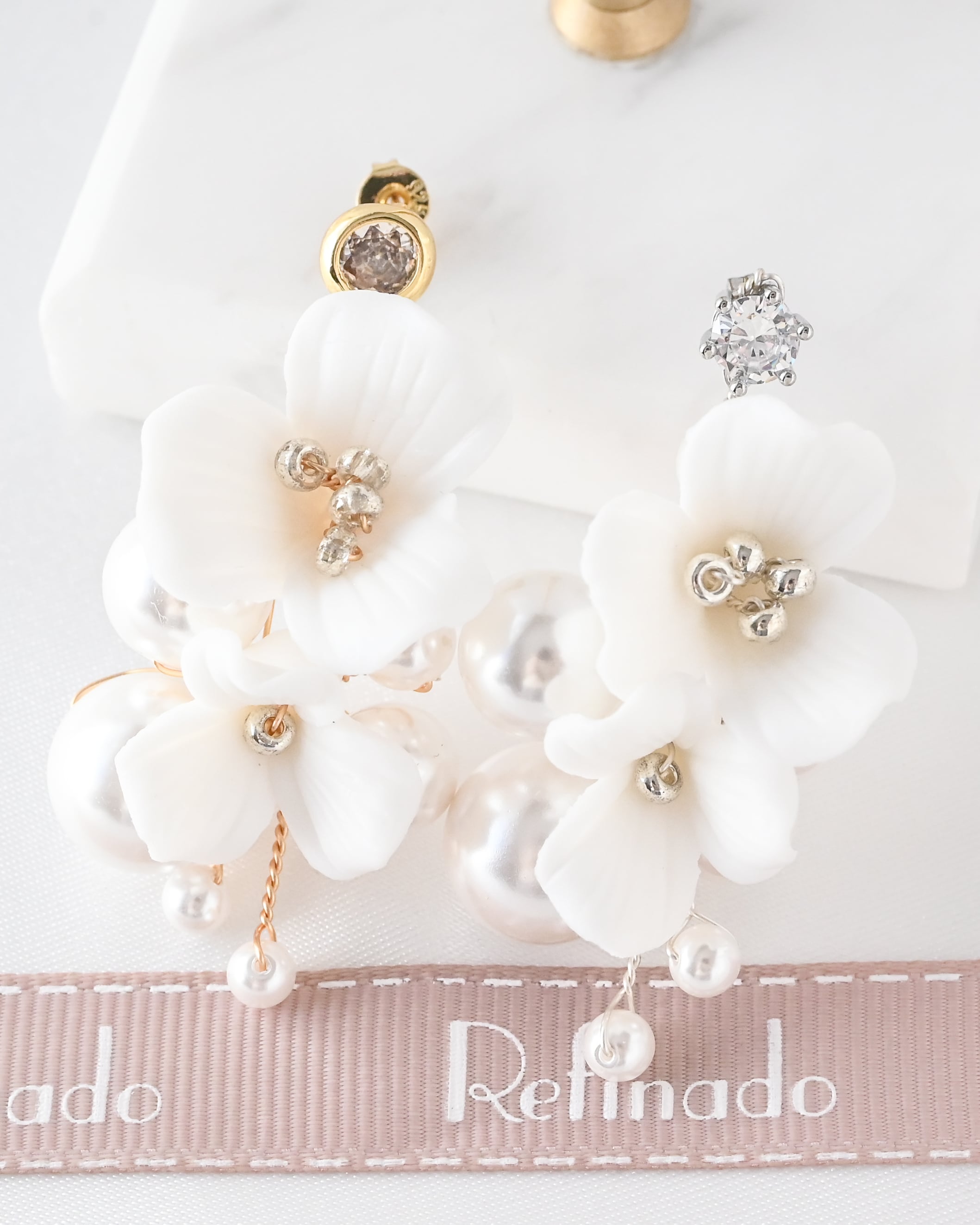 柔らかな白い小花が耳元でふわりと咲き誇る、ブライダルにぴったりのフラワーピアス。
