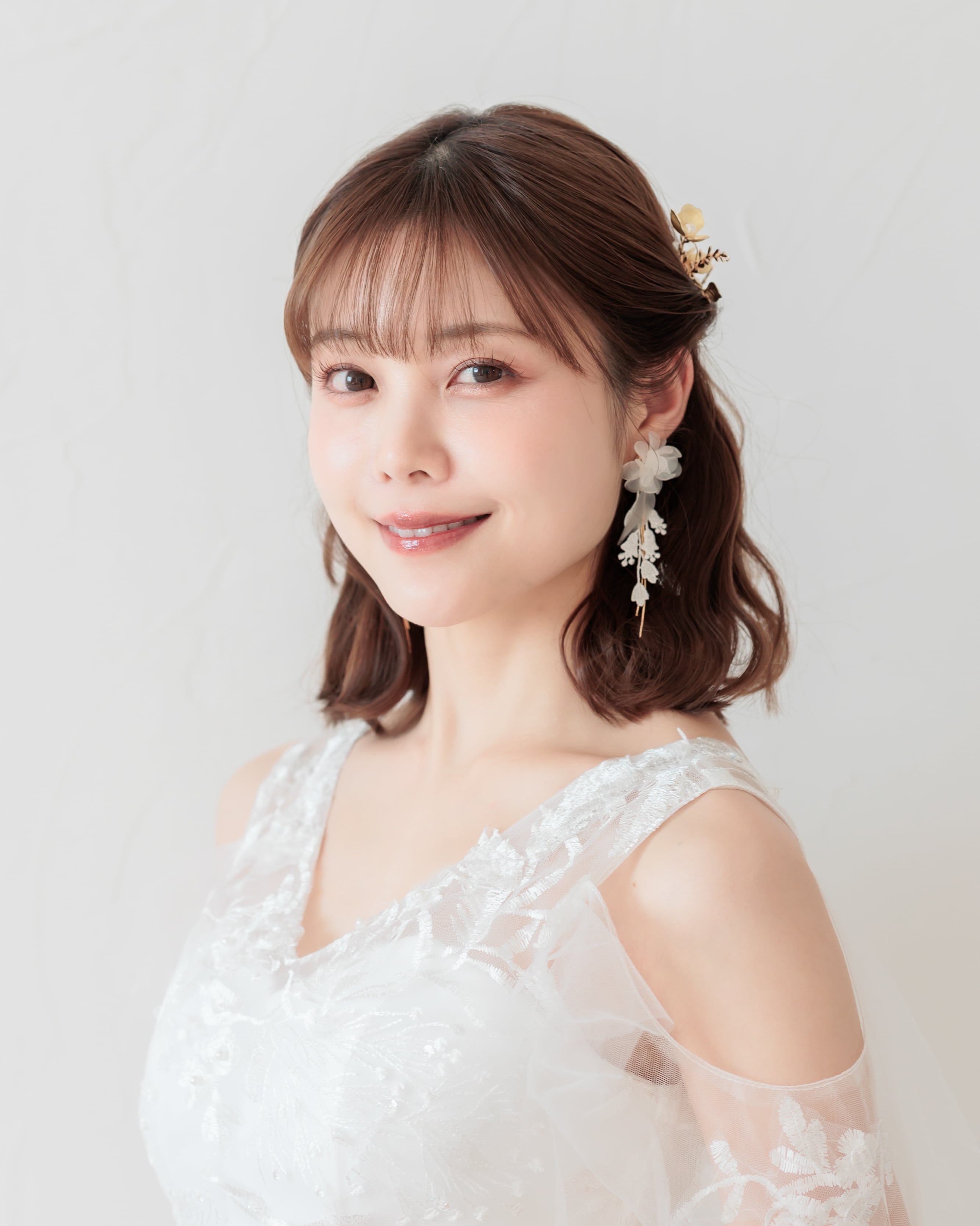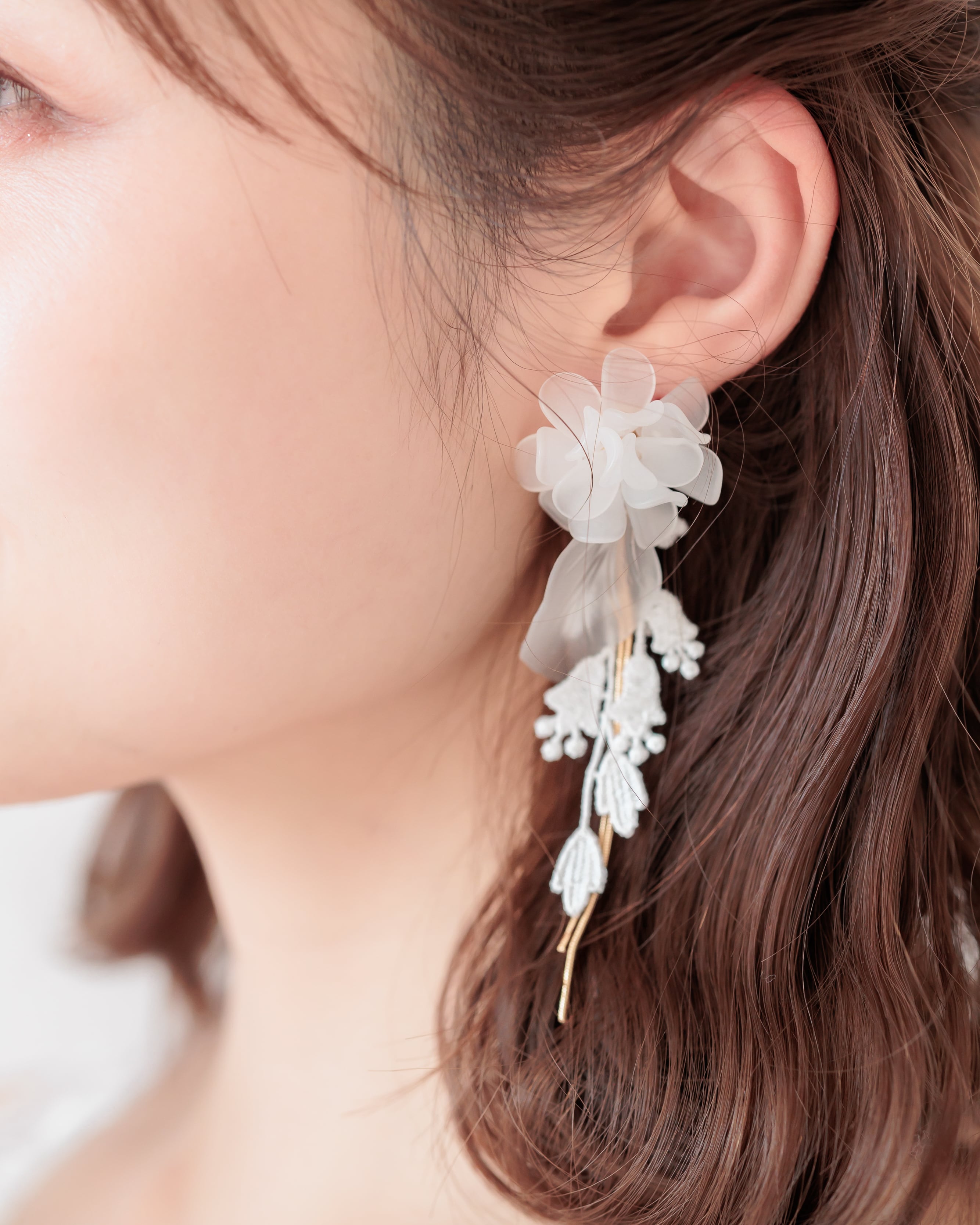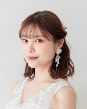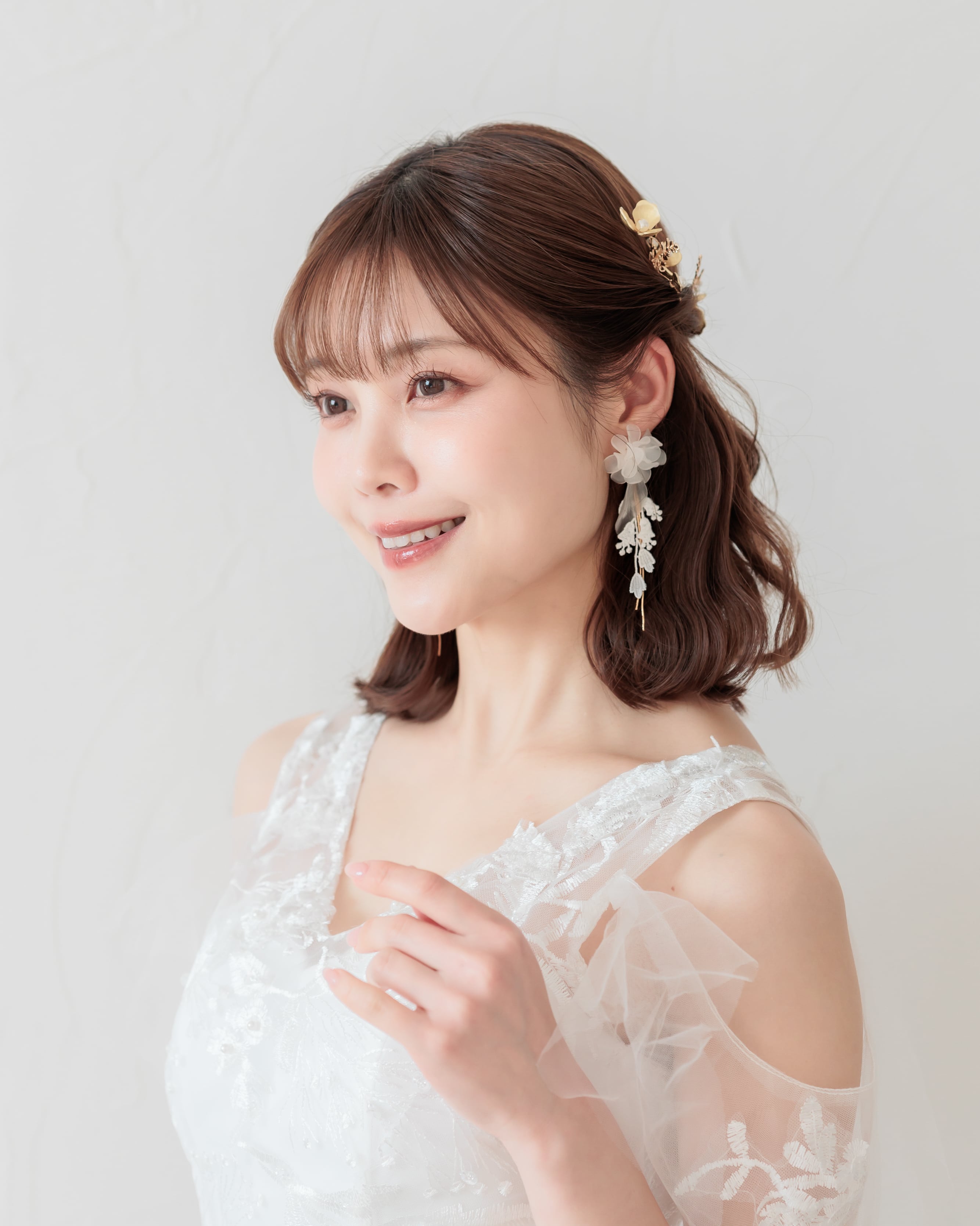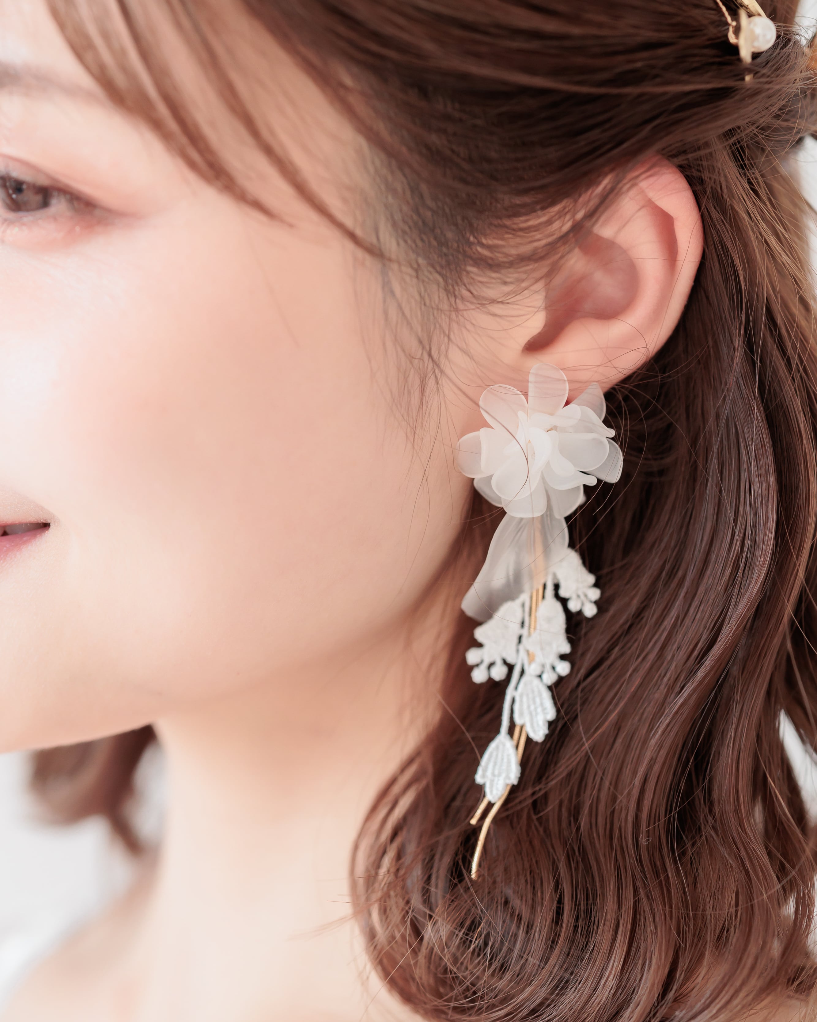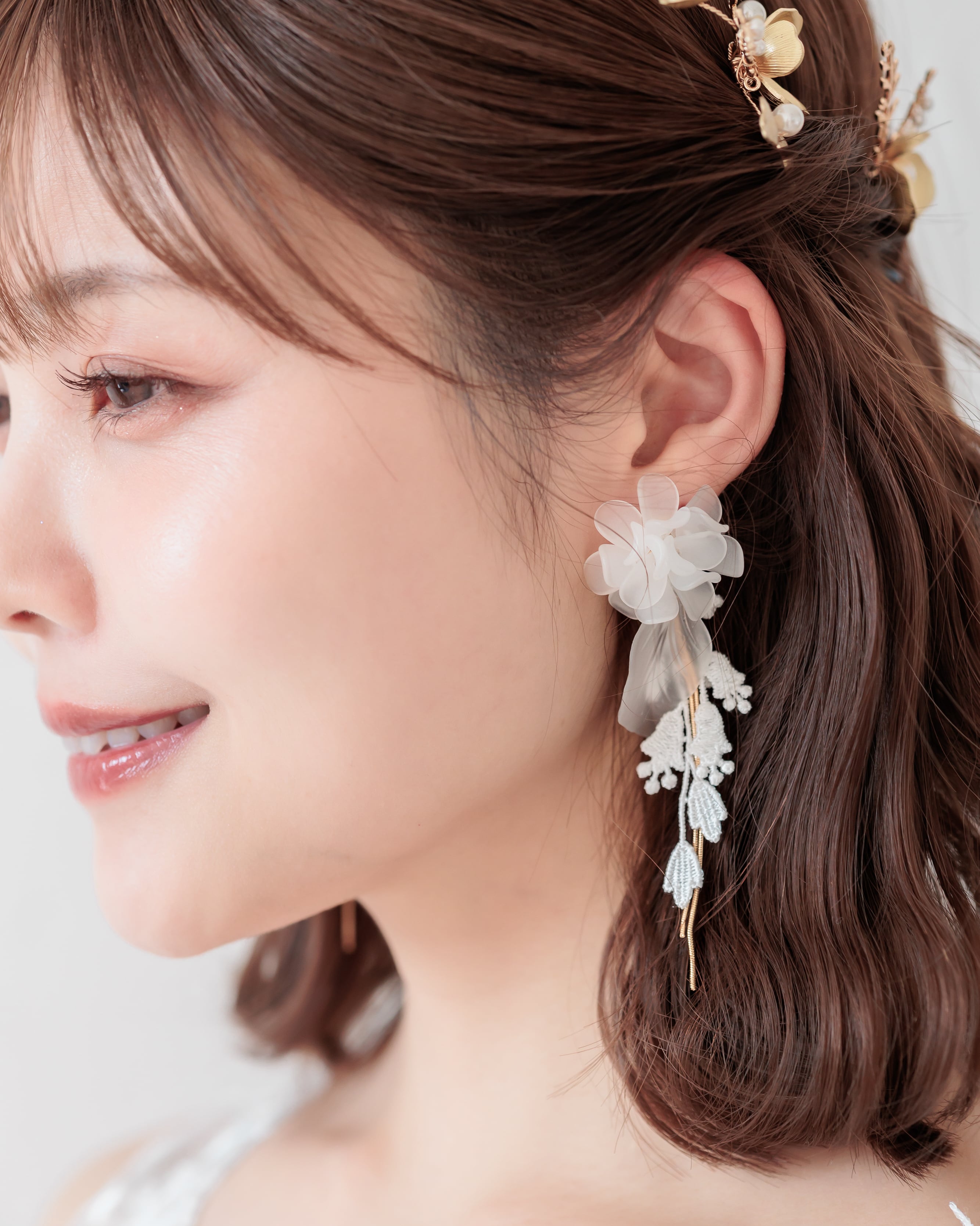 ふんわりと重なる花びらが耳元にボリュームを添えつつ、レースの揺れとゴールドのラインが軽やかさをプラス。動くたびに表情を変える、花嫁さまに寄り添うデザインです。