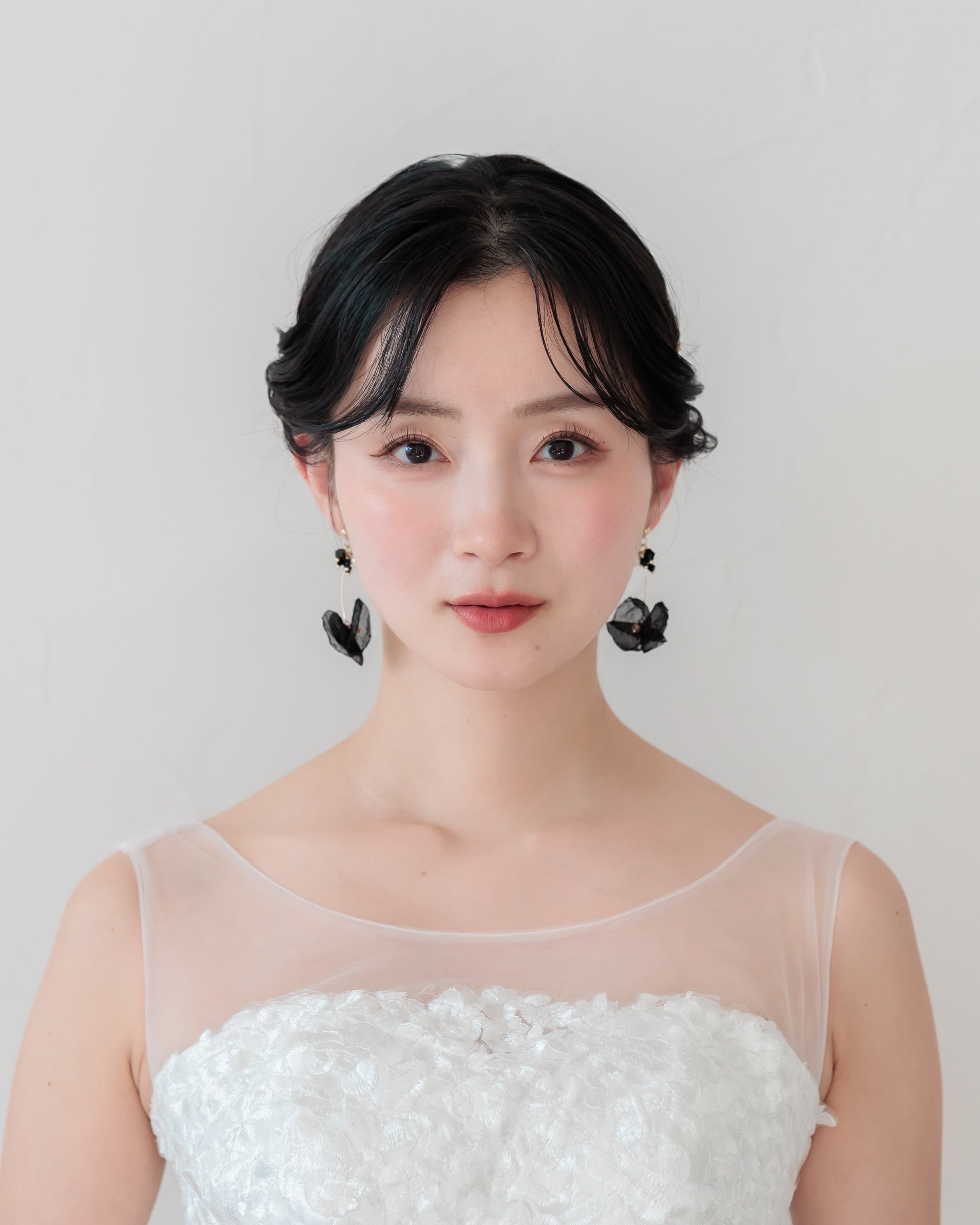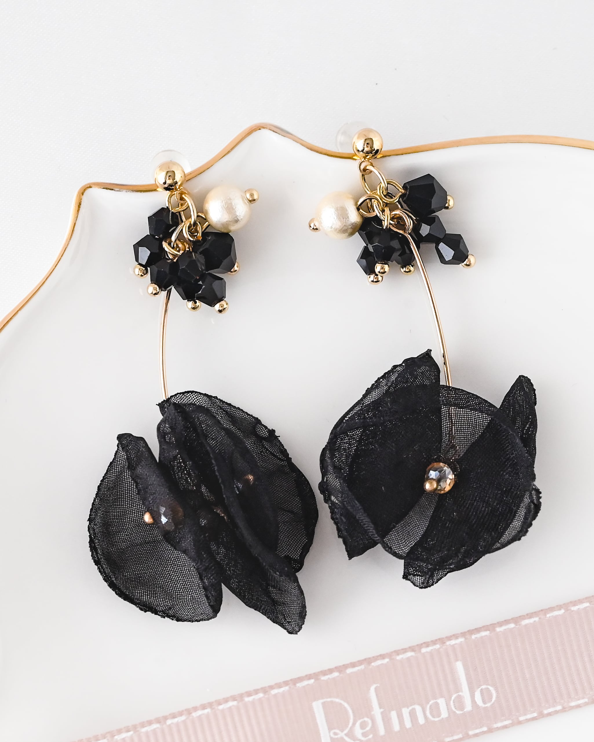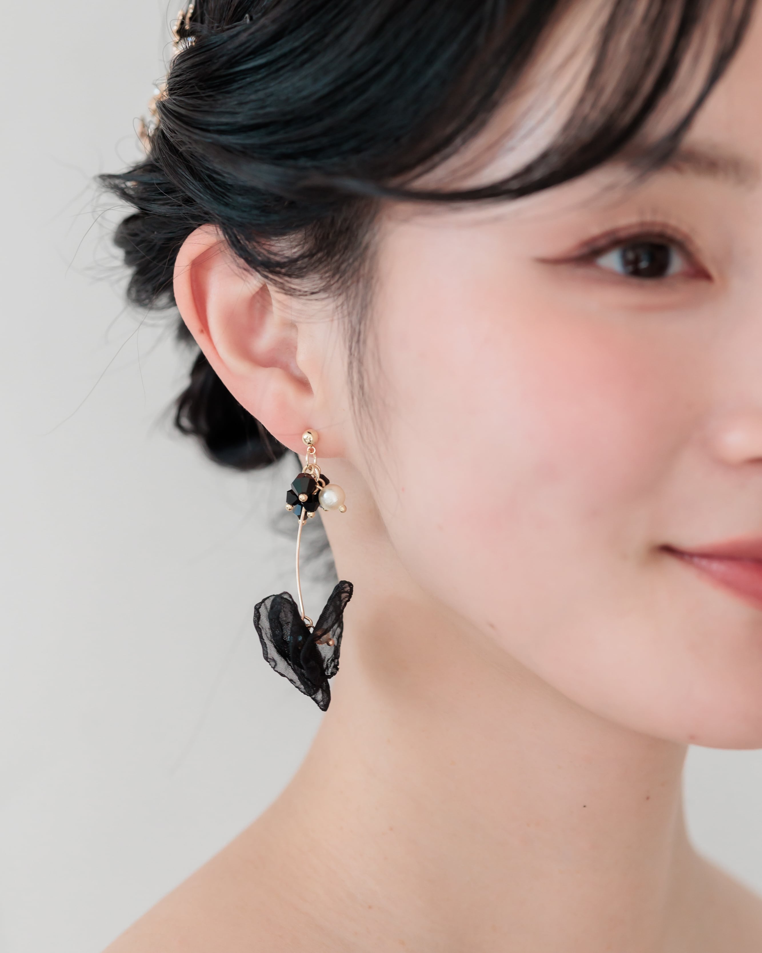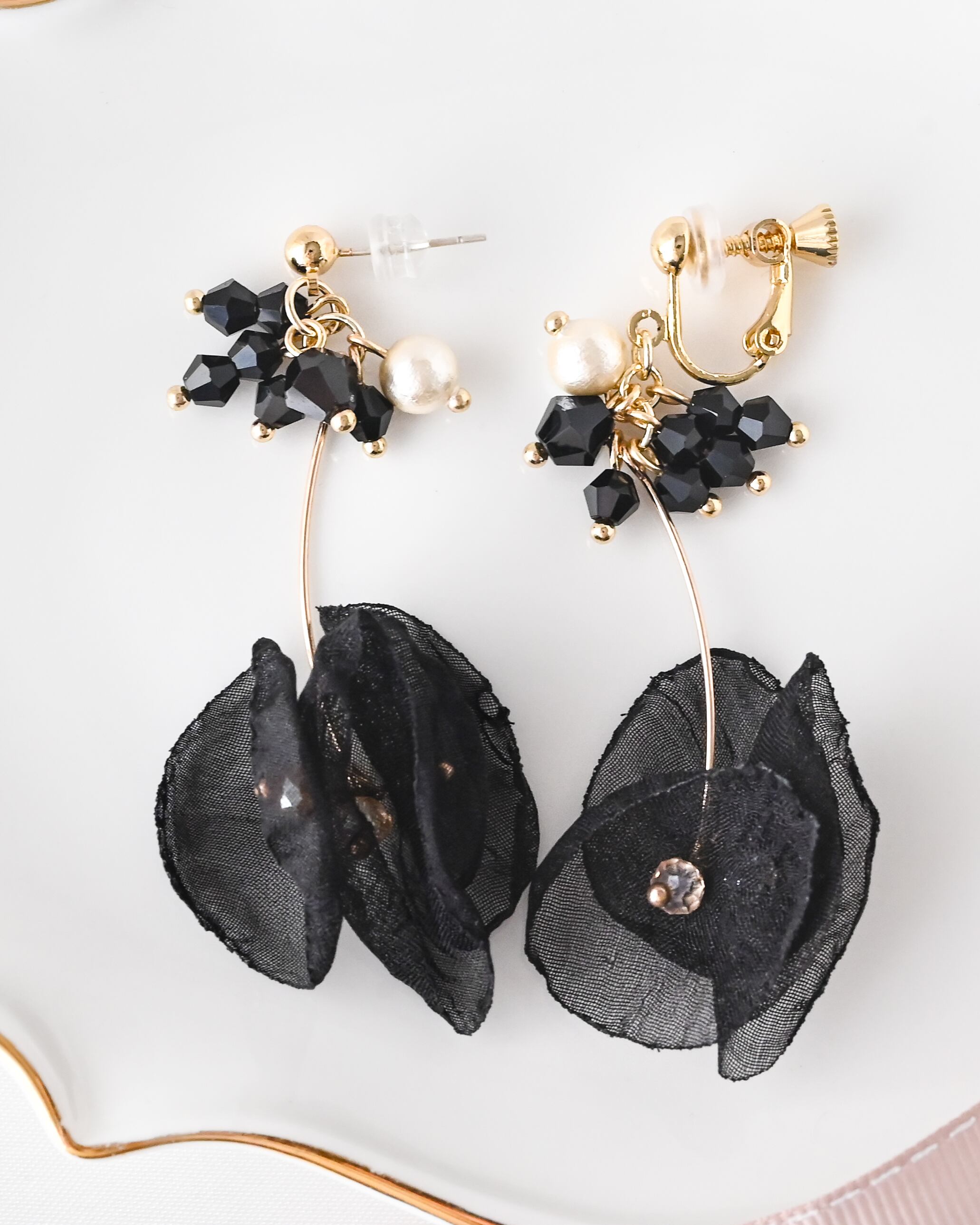 軽やかなオーガンジー素材で重ねたブラックフラワーが、耳元でふわりと揺れるエレガントなデザイン。