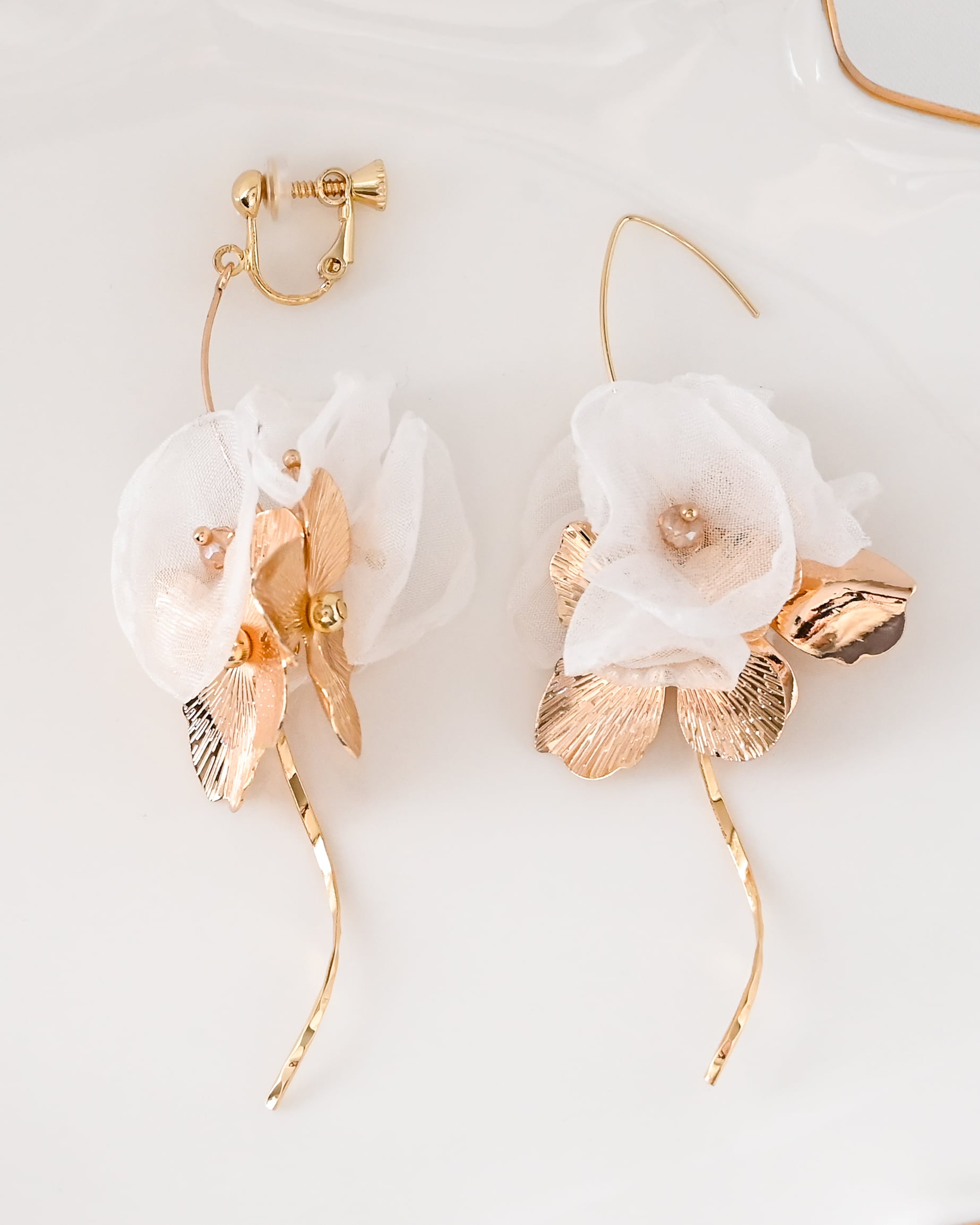 ふんわりと広がるオーガンジーのお花と、繊細に彫り込まれたメタルフラワーを重ねた、立体的で存在感のあるフラワーピアス/イヤリング。