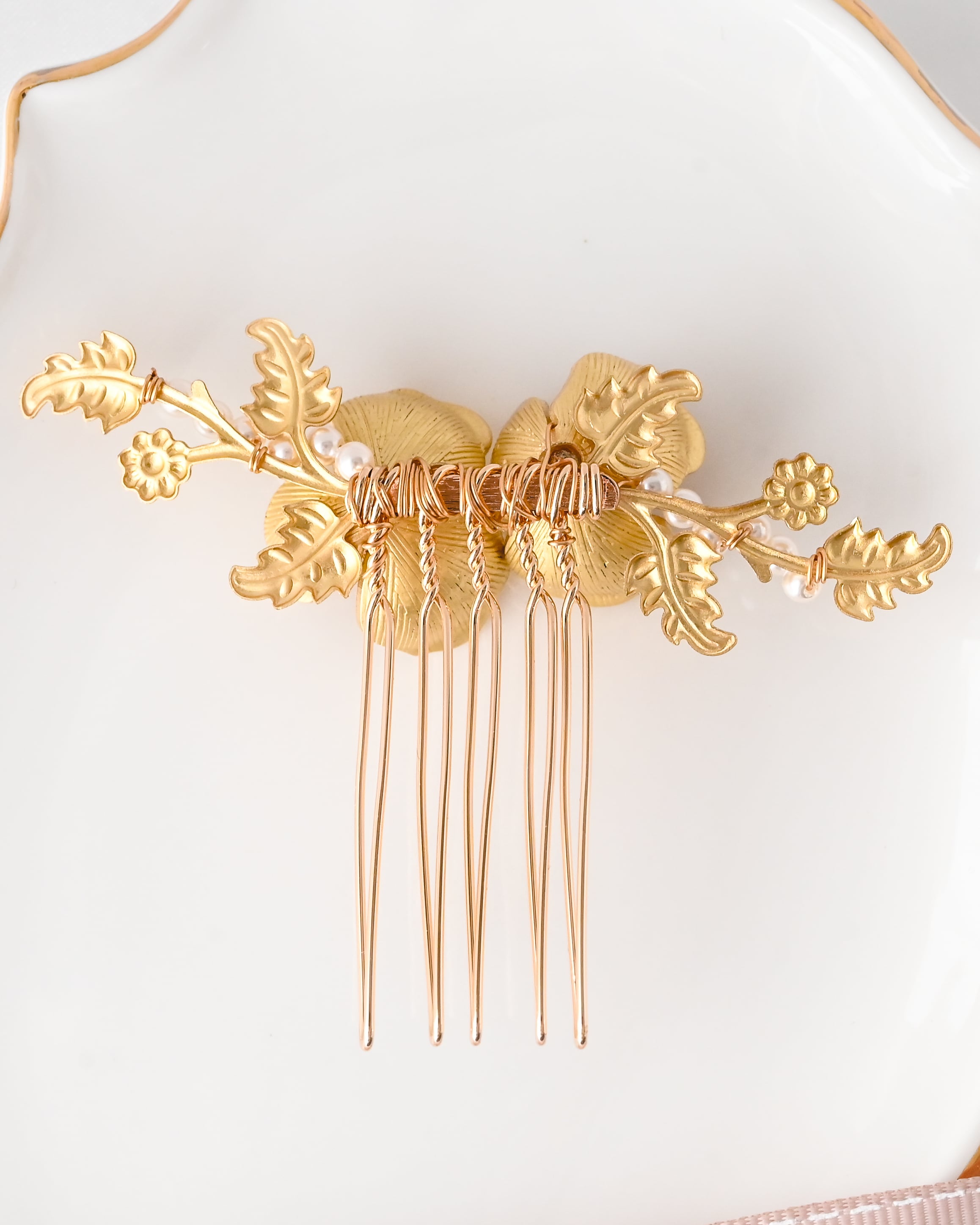 小ぶりのパールやリーフモチーフを連ねたデザインは、ヘアアレンジに立体感と華やかさをプラス。