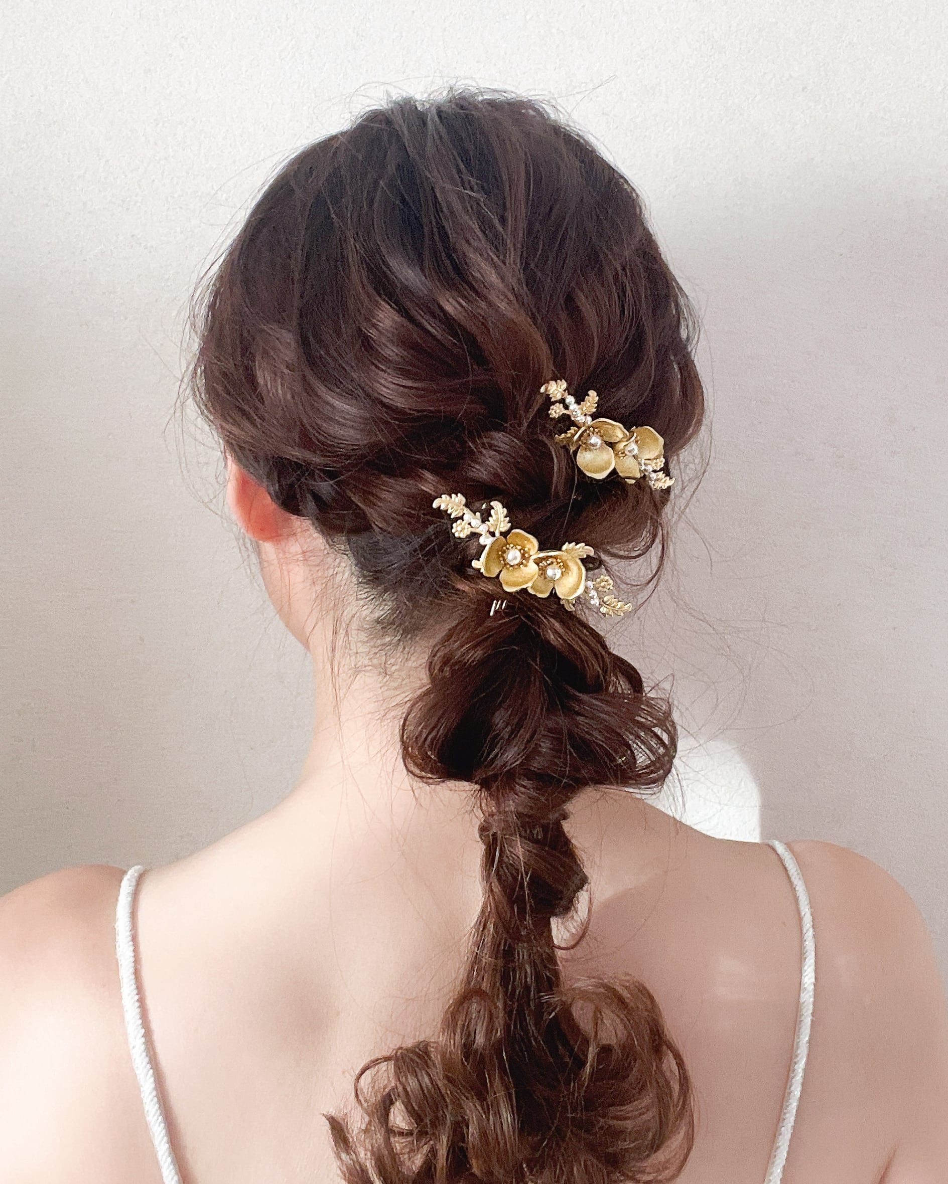 2個セットなので左右にバランスよく飾ったり、まとめ髪に沿わせてアレンジしたりと、使い方も自由自在。
