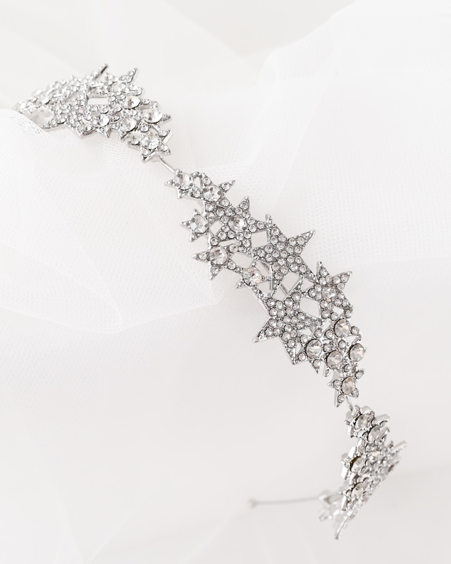 細かなマーキスカットストーンを丁寧に連ね、繊細な枝葉のように広がるデザインが、まとめ髪や編み下ろしに自然に溶け込みつつ、花嫁さまの後ろ姿を上品に彩ります。