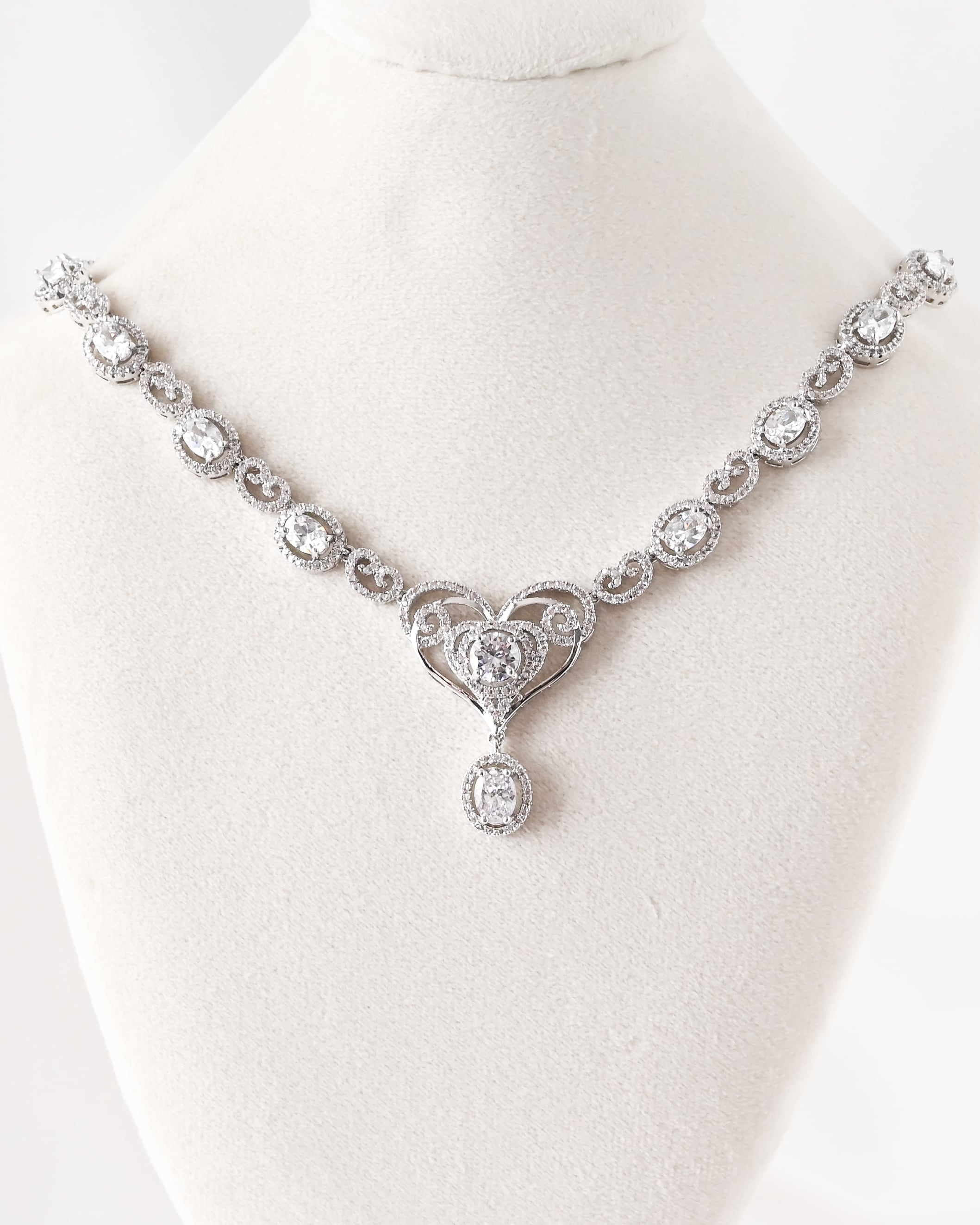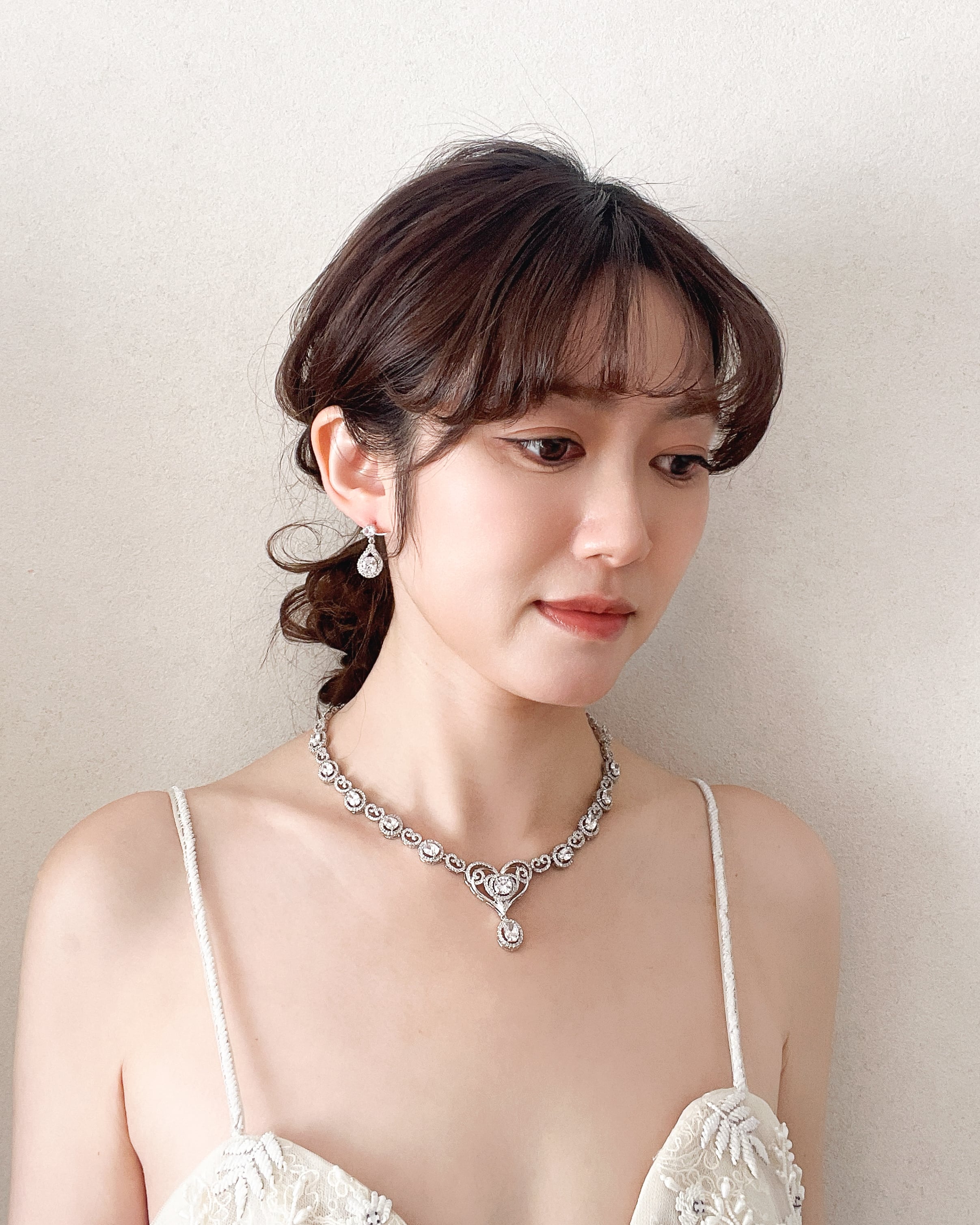 首元には、きらめくラウンドカットストーンを連ね、センターには繊細な曲線で形作られたハートモチーフを配置。ドロップ型ストーンが揺れて、動くたびに胸元を上品に輝かせます。