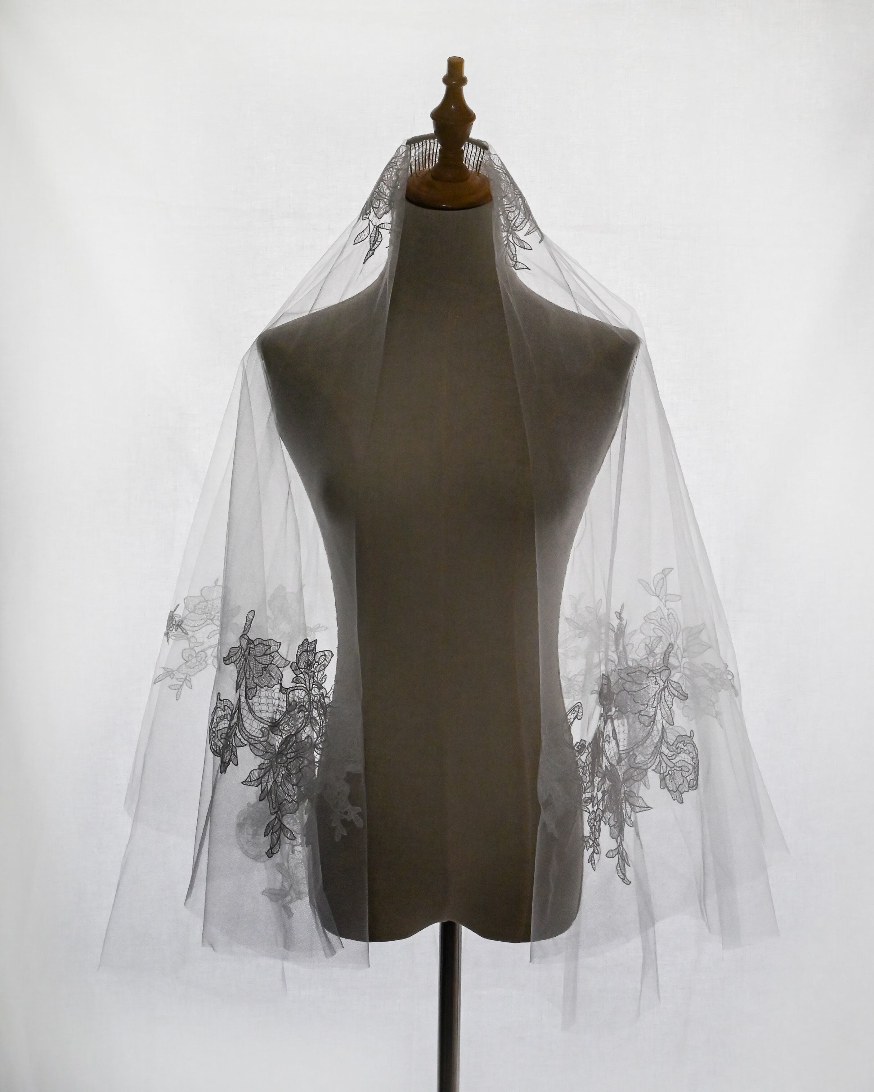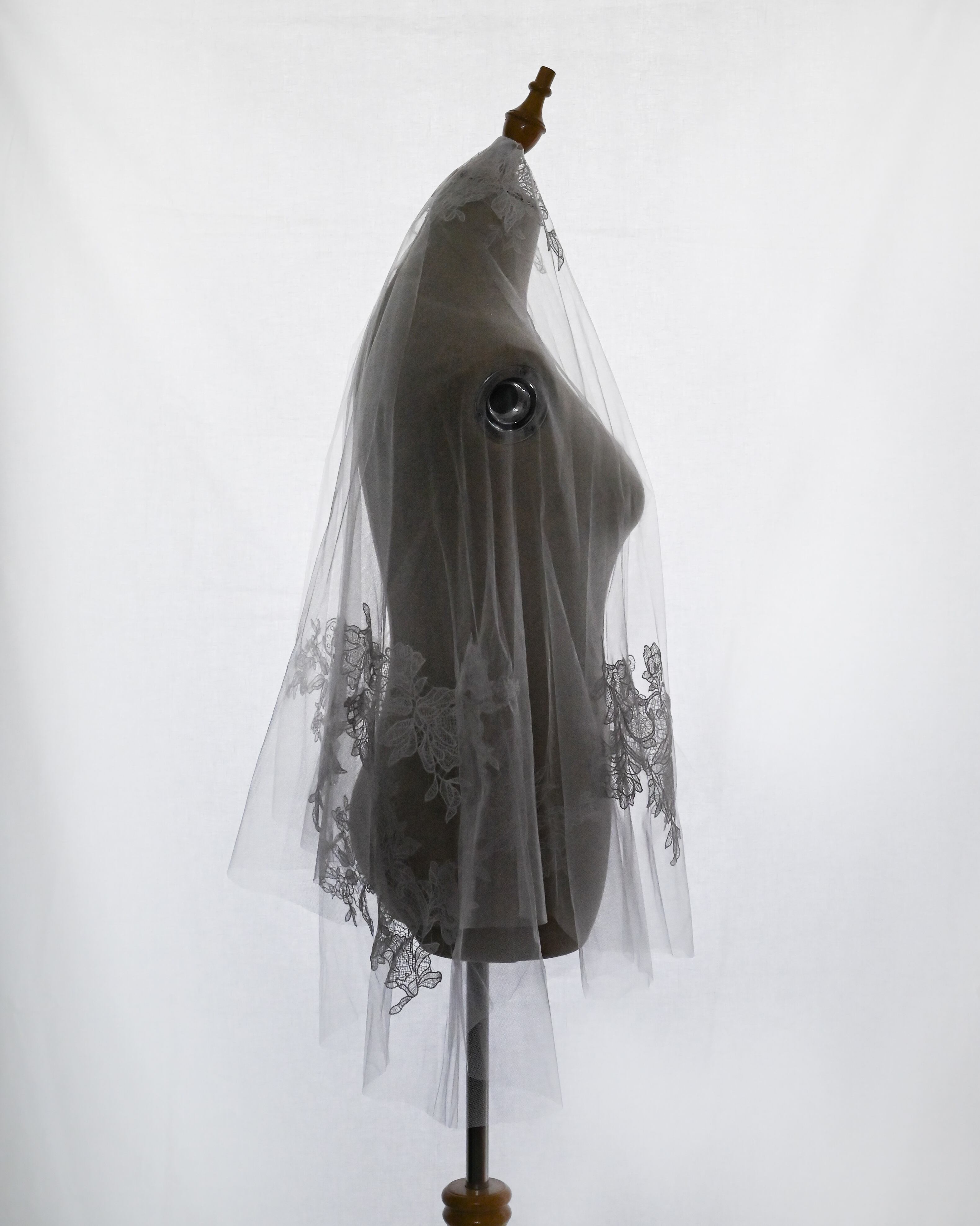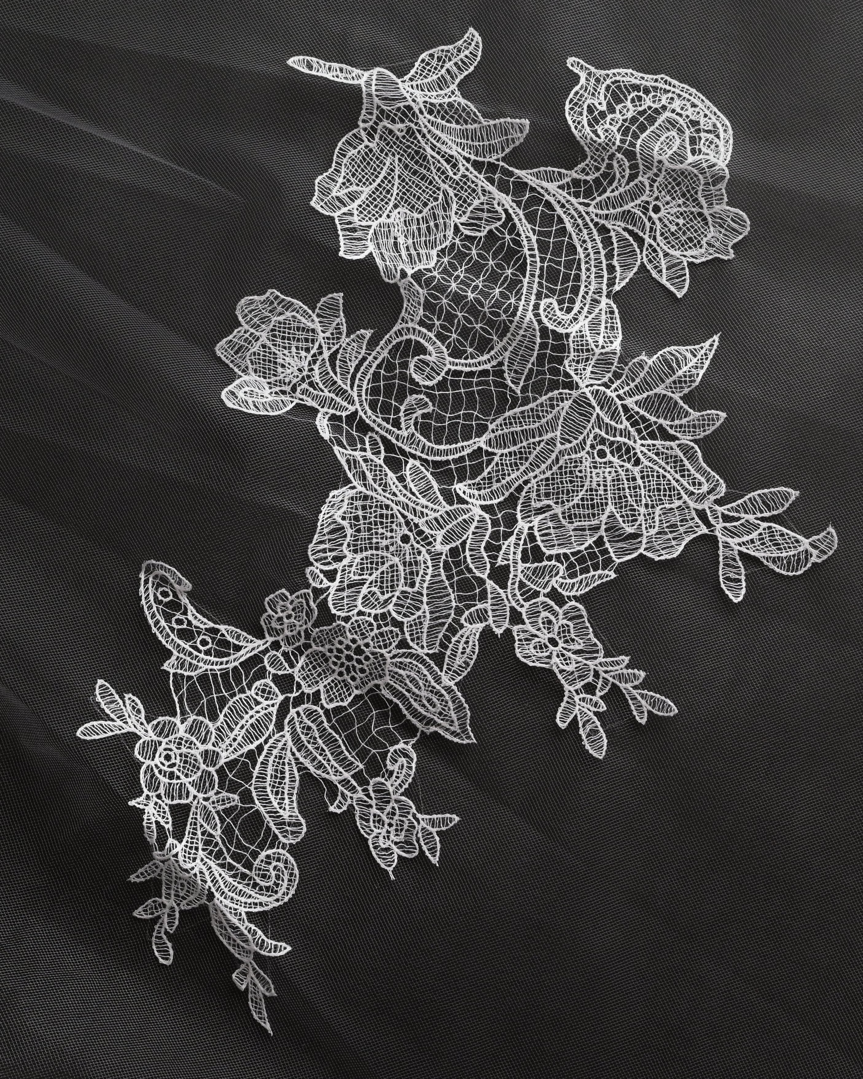 繊細なコードレースを贅沢にあしらい、華やかさと気品を兼ね備えたデザインに仕上げました。