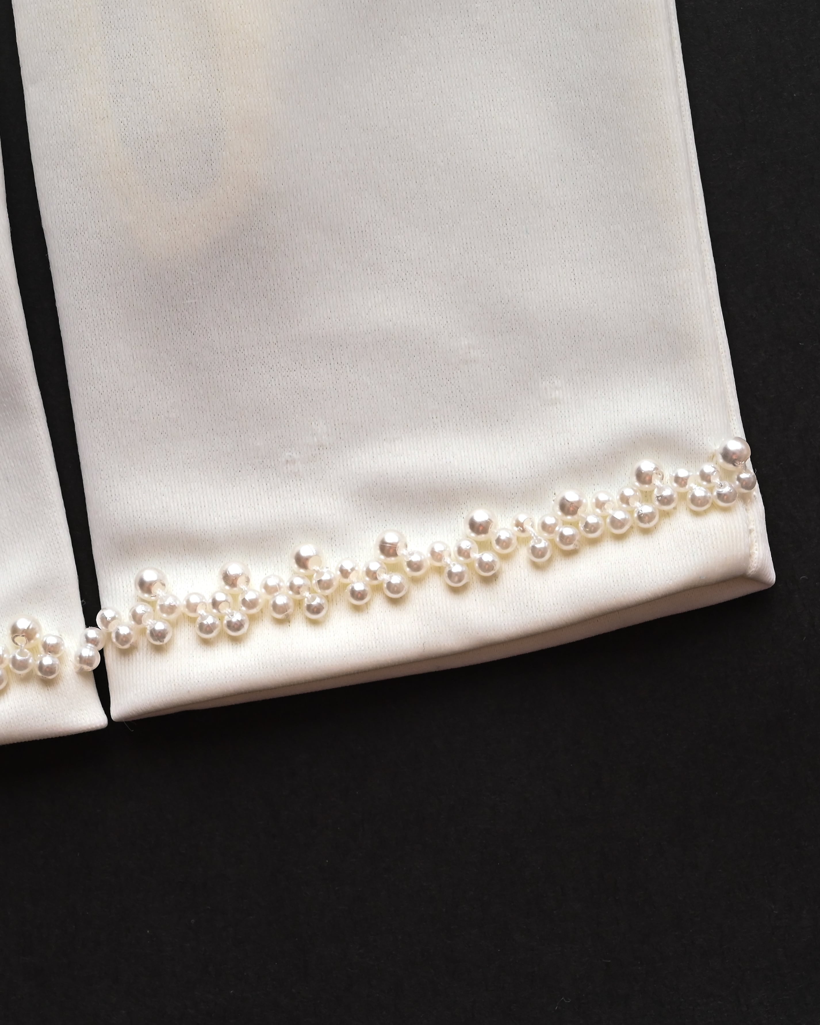 裾にあしらわれた大小のパールをランダムに並べた繊細なデザインは、動くたびに光を柔らかく反射し、上品な立体感を生み出します。