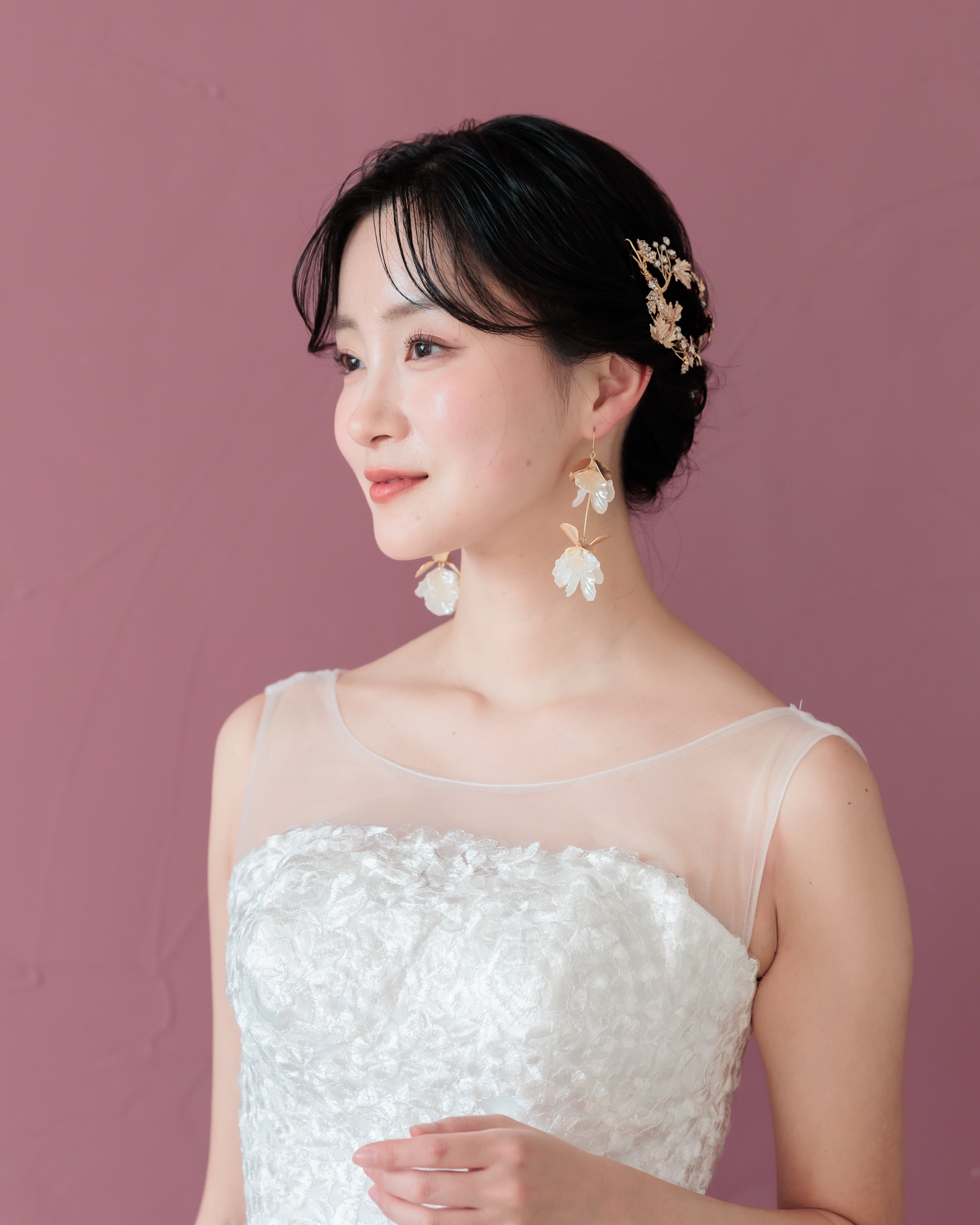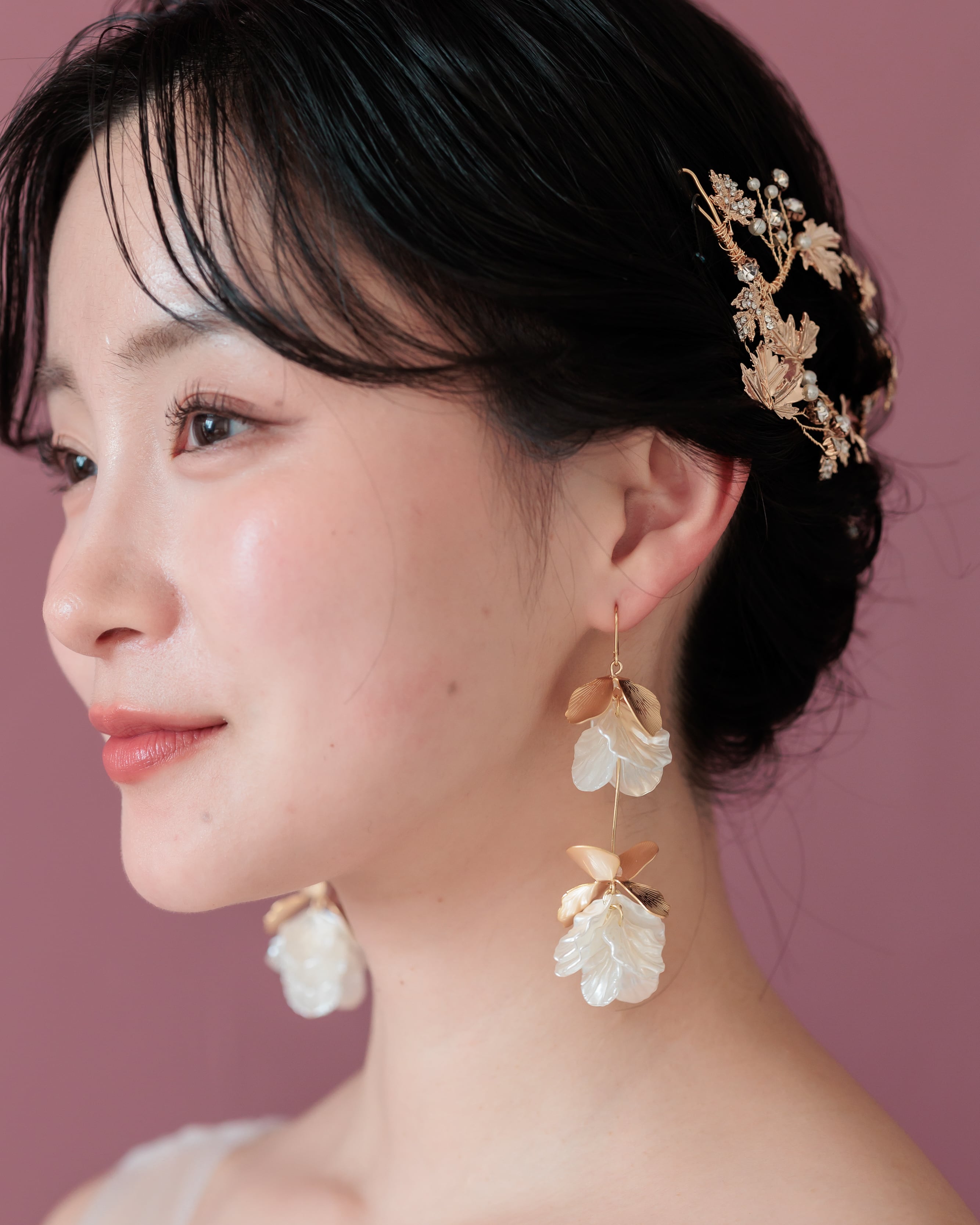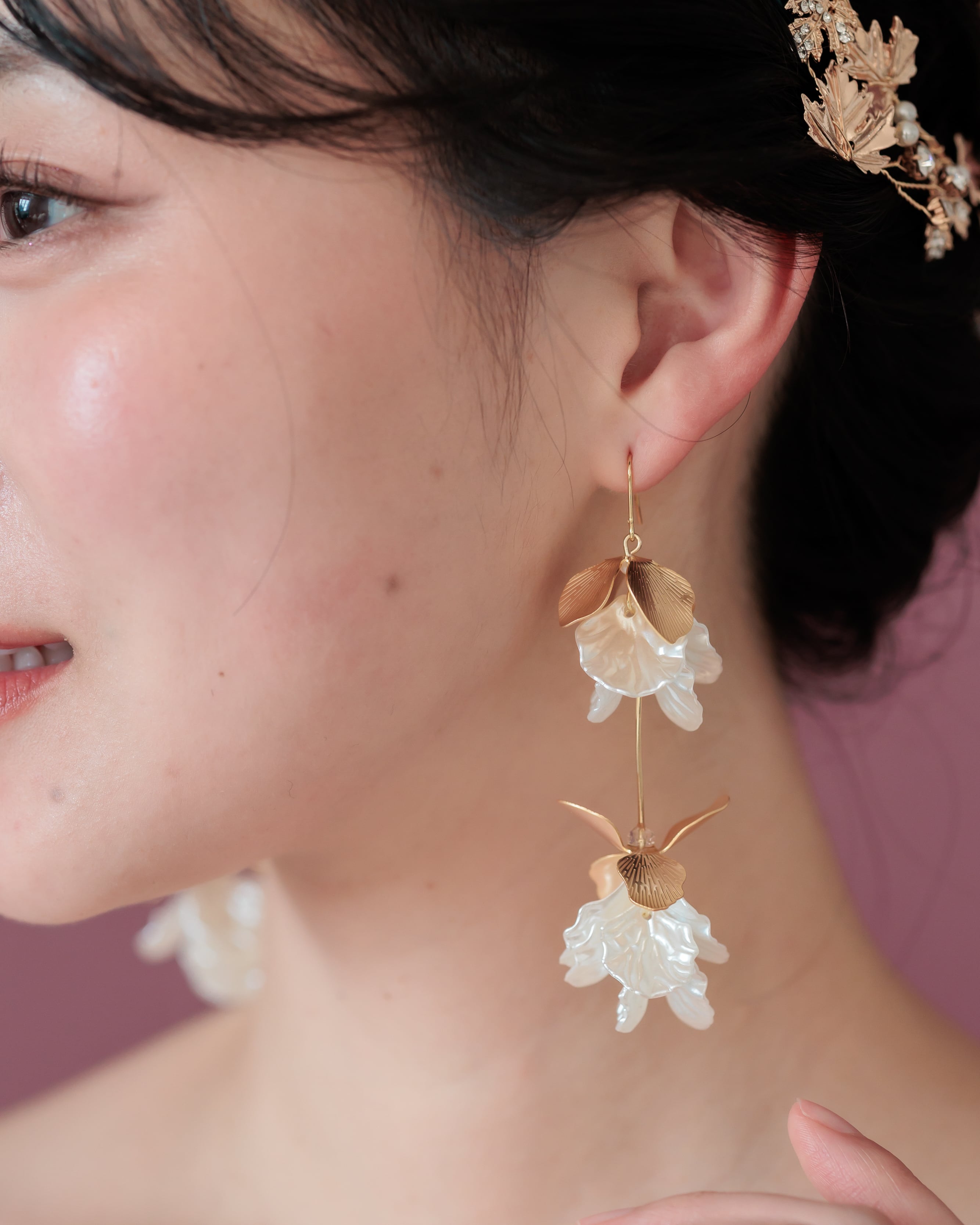繊細に表現された花びらが耳元で上品に輝き、動くたびに軽やかに揺れて顔まわりを華やかに演出します。