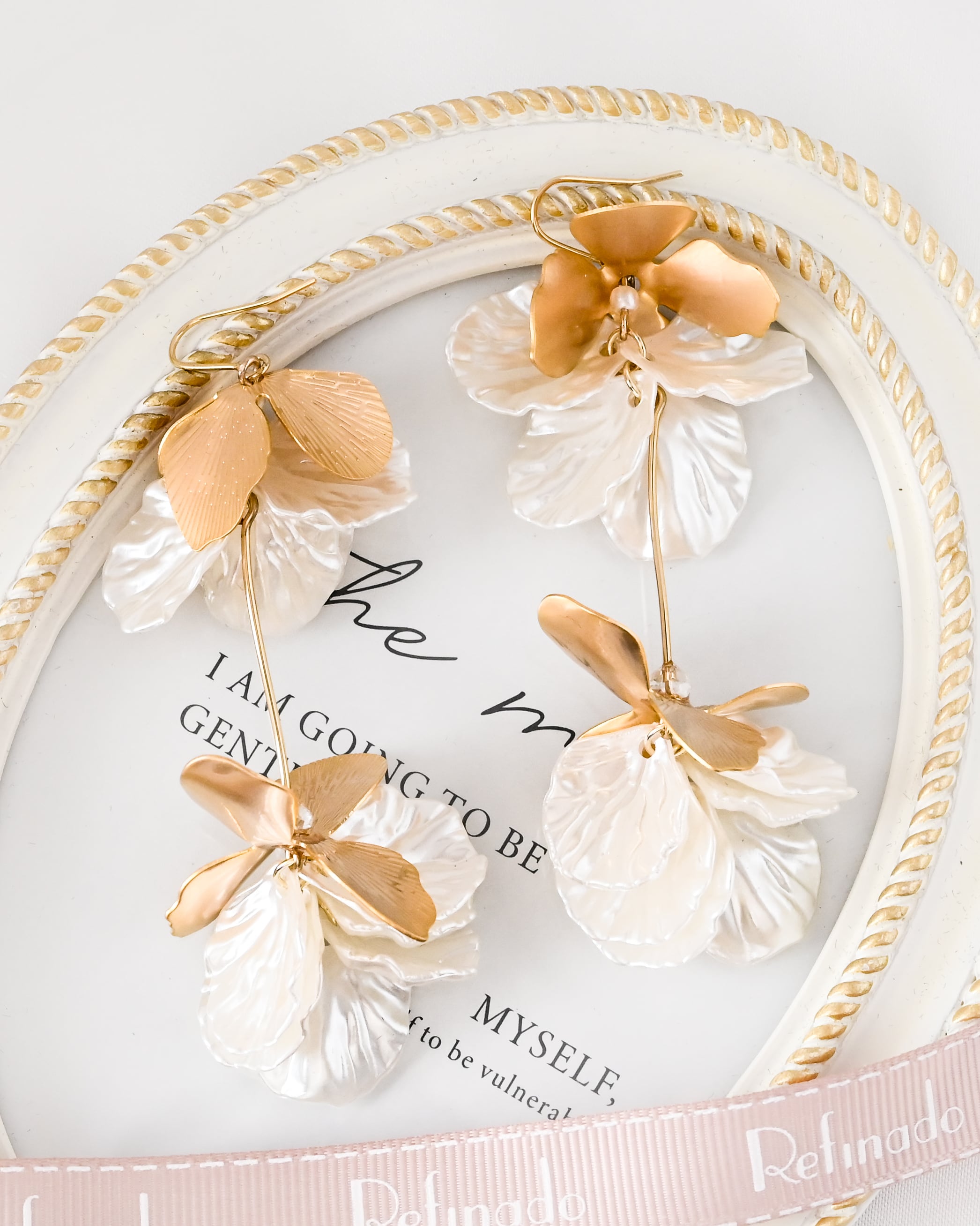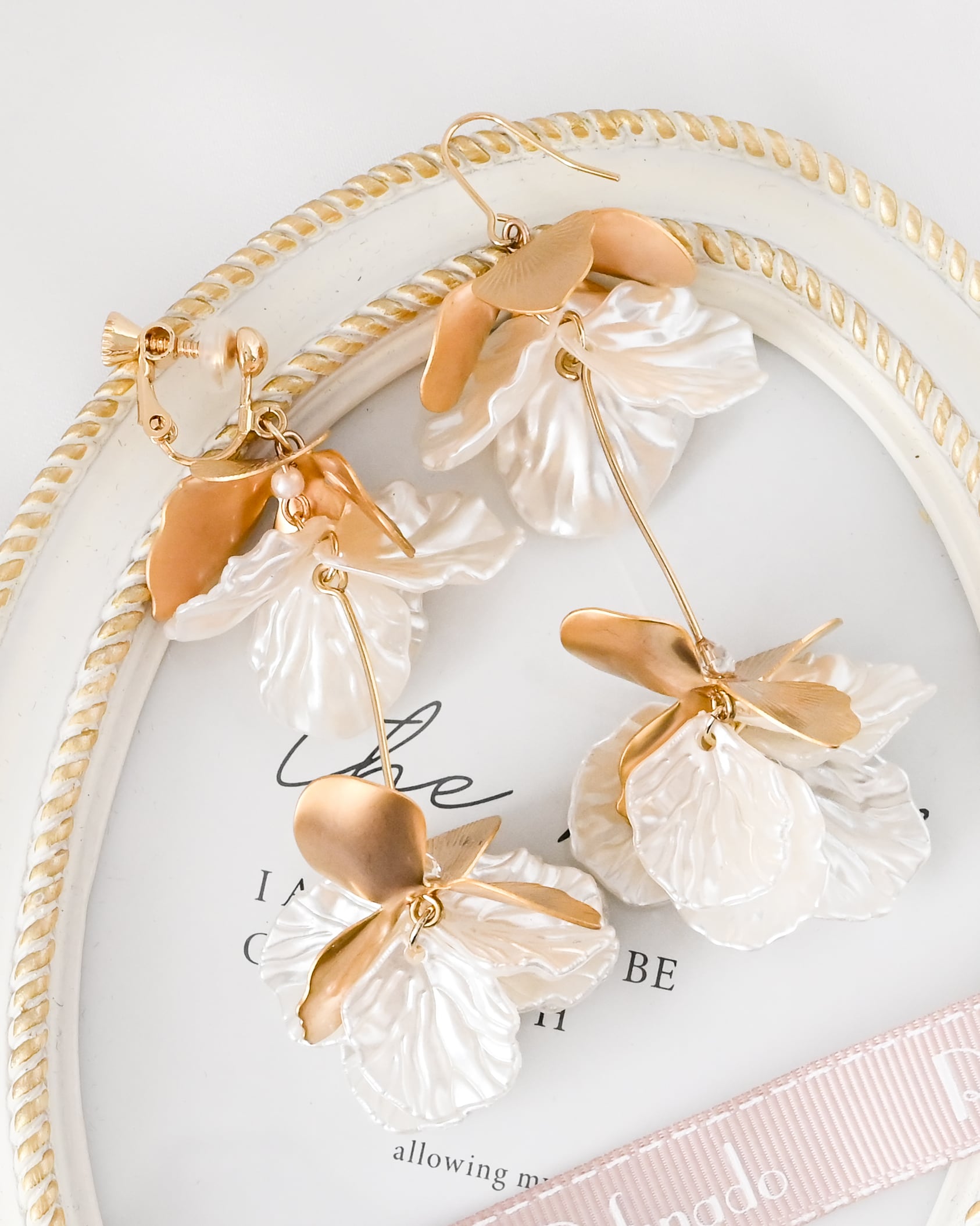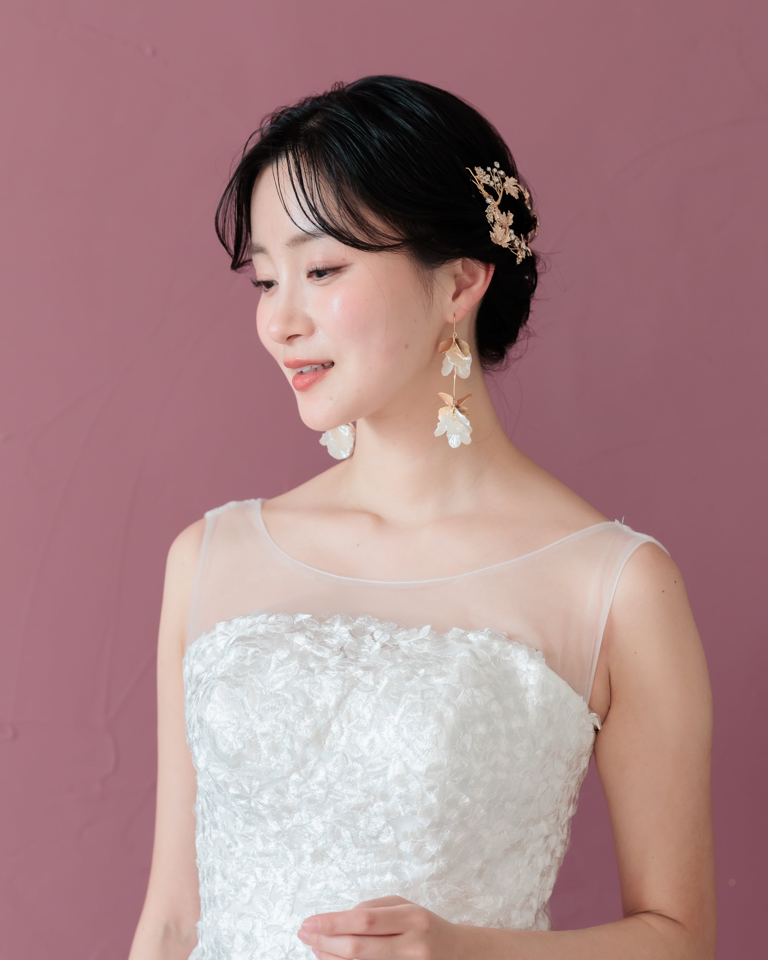 繊細に表現された花びらが耳元で上品に輝き、動くたびに軽やかに揺れて顔まわりを華やかに演出します。