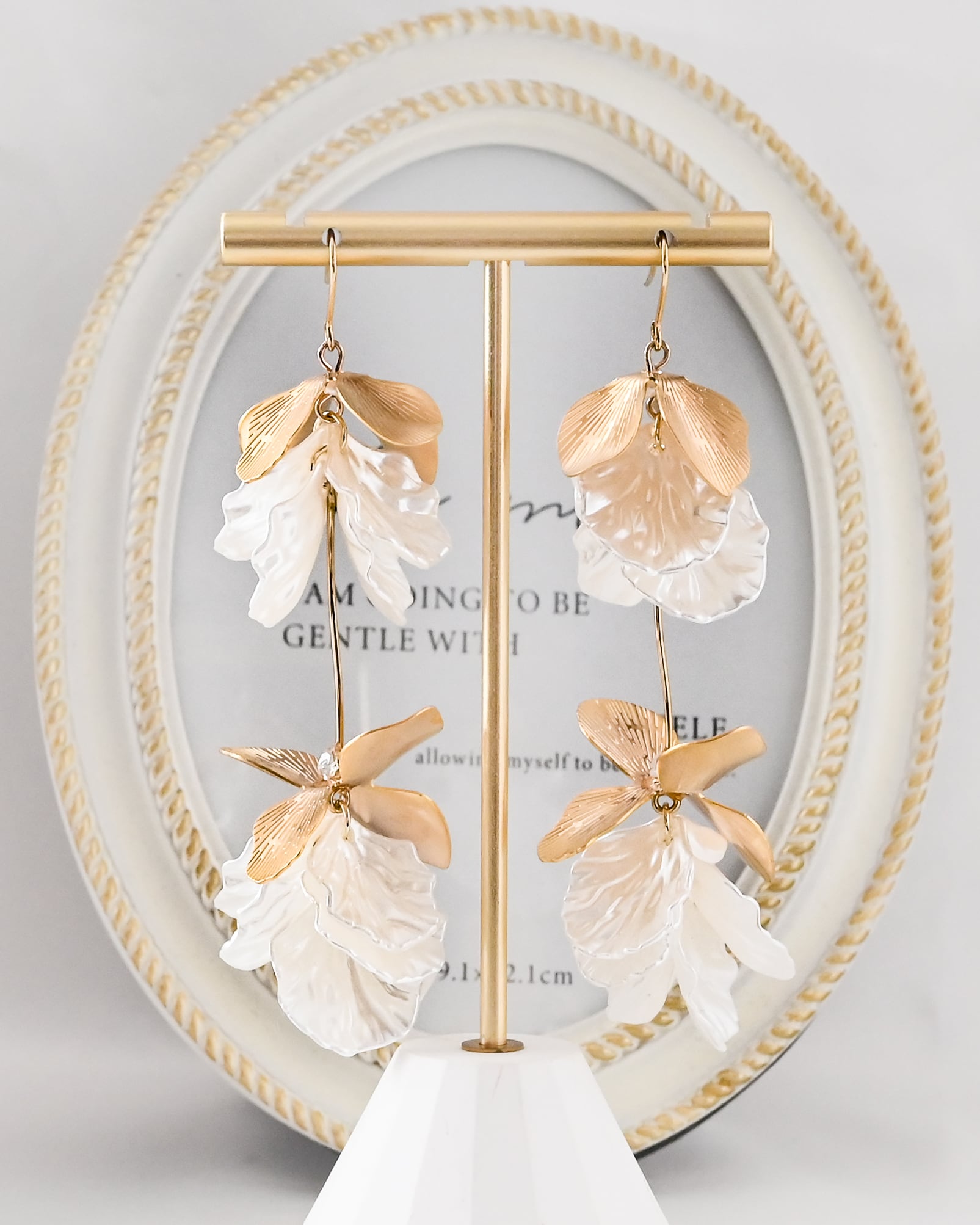立体感のあるゴールドフラワーと、やわらかなホワイトフラワーパーツを組み合わせた華やかなロングアクセサリー。