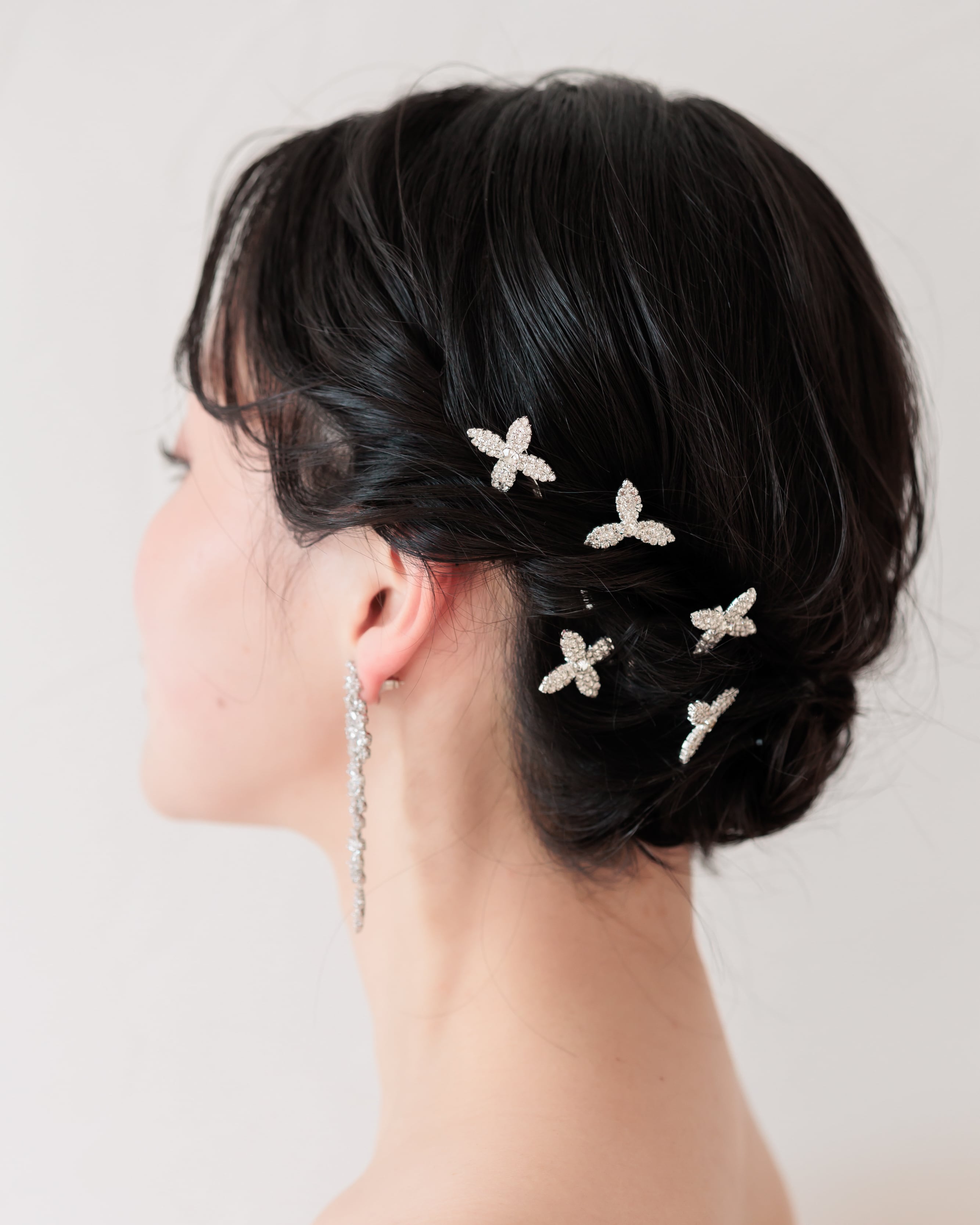 小ぶりなサイズ感のため、まとめ髪やシニヨンにバランスよく散らして飾ることで、自然で立体感のあるブライダルヘアを演出します。