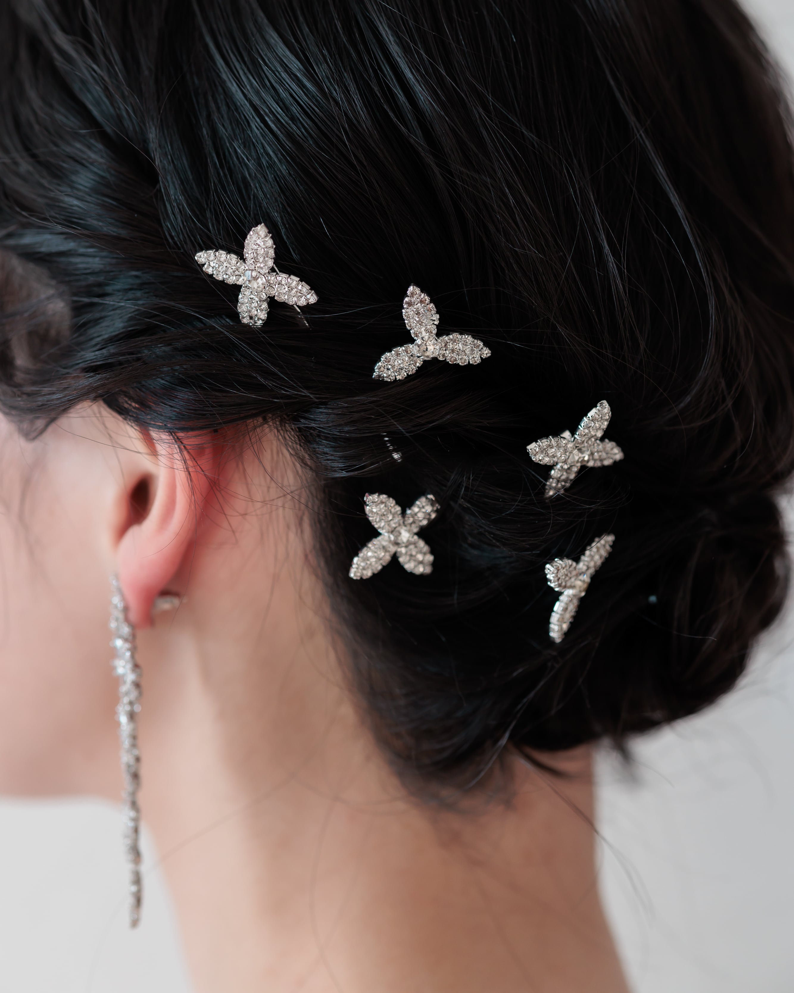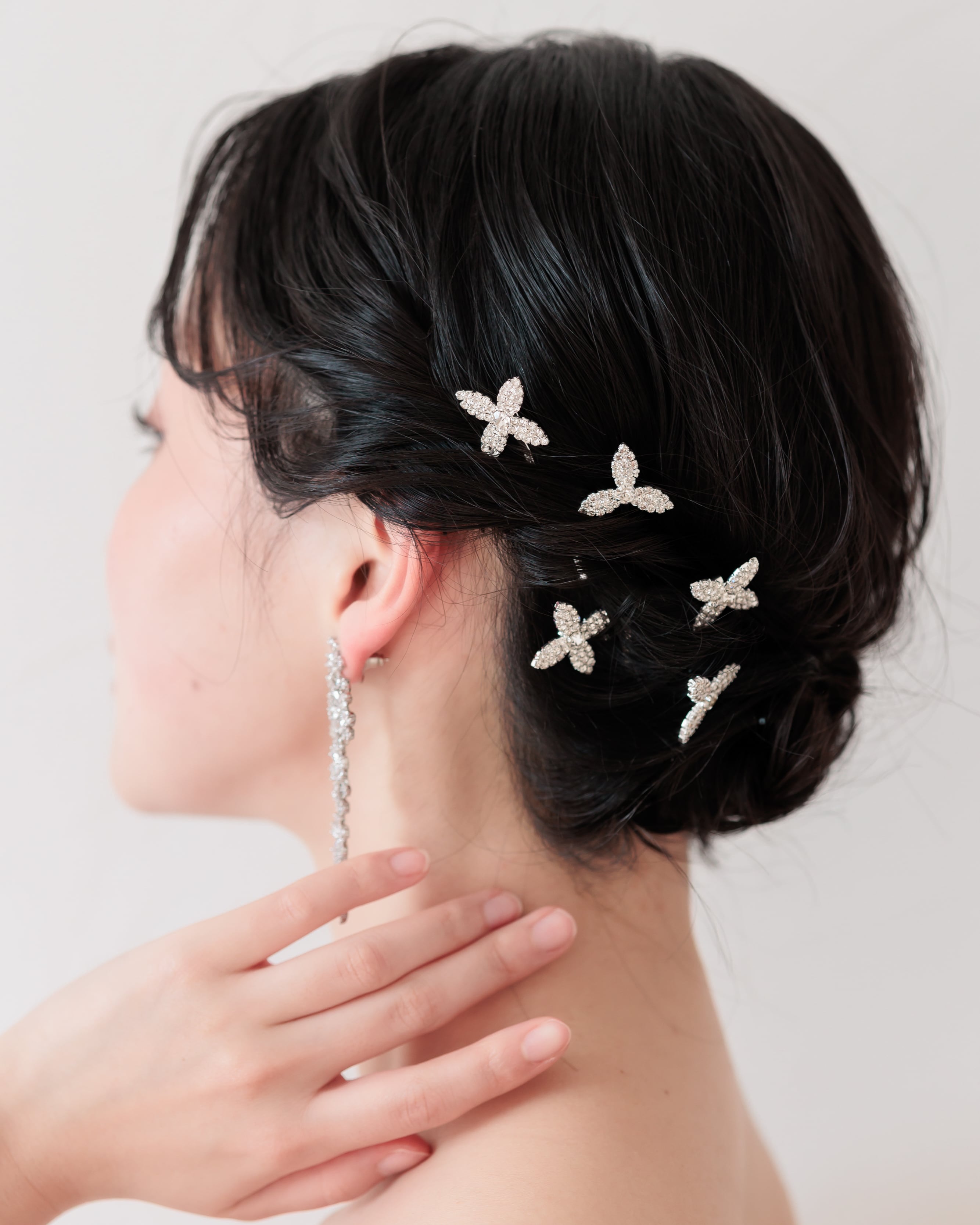 小ぶりなサイズ感のため、まとめ髪やシニヨンにバランスよく散らして飾ることで、自然で立体感のあるブライダルヘアを演出します。