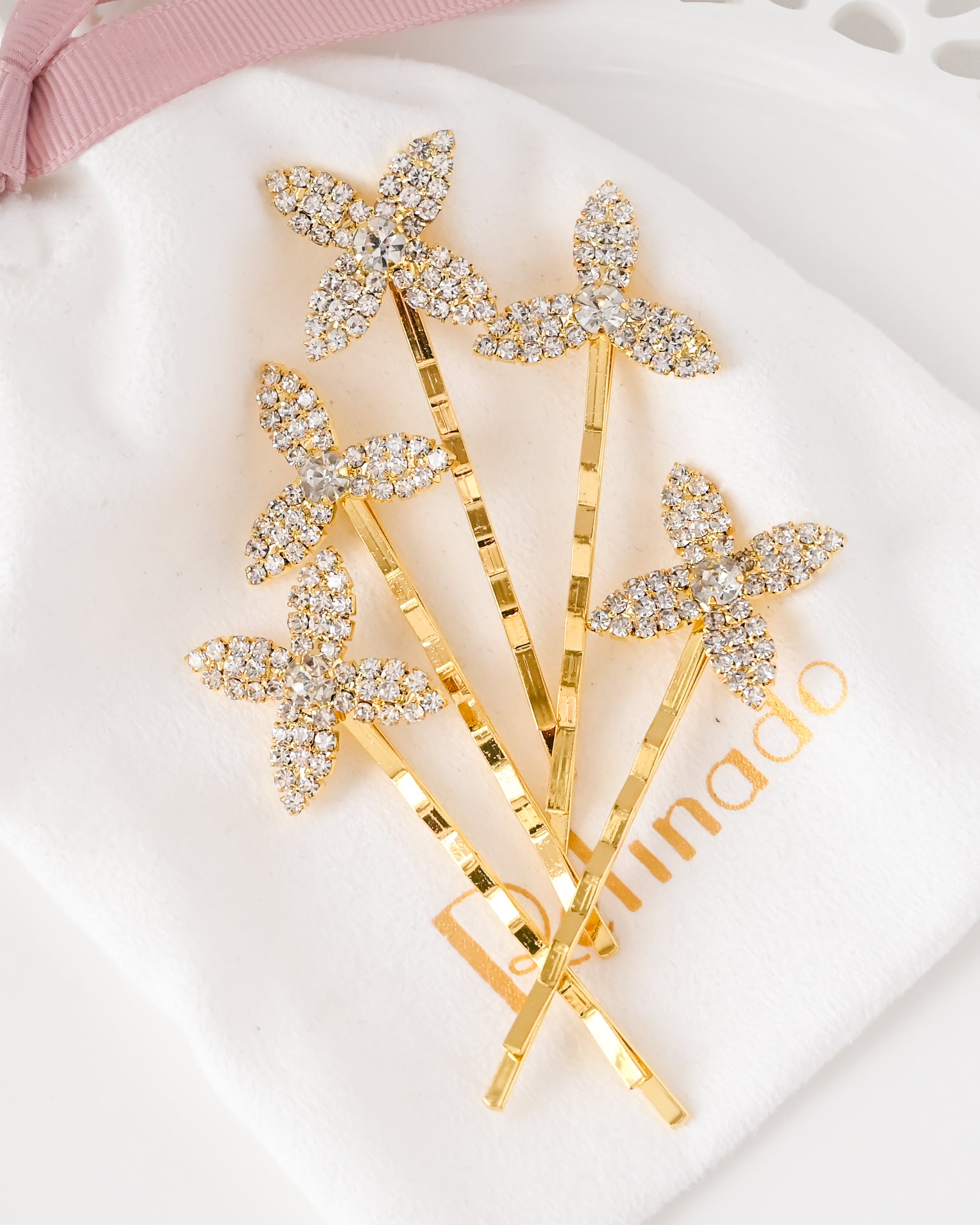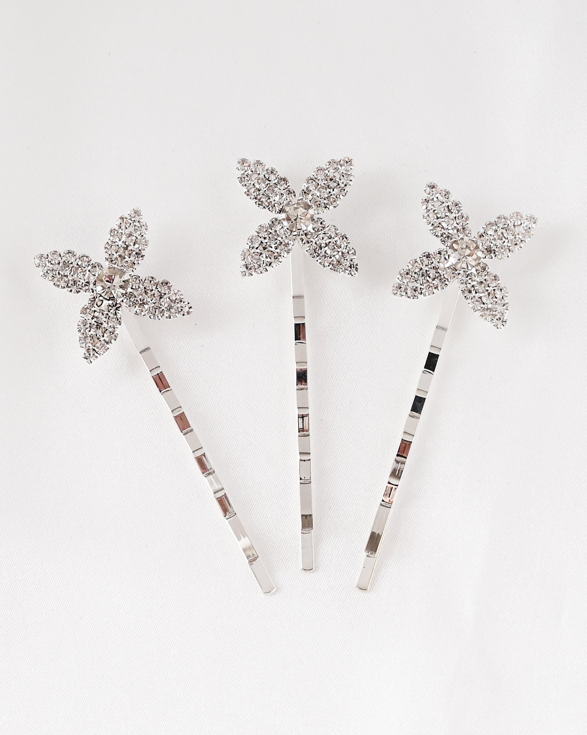 きらめくビジューで表現されたフラワーモチーフが美しい、ブライダルヘアピン5本セット。