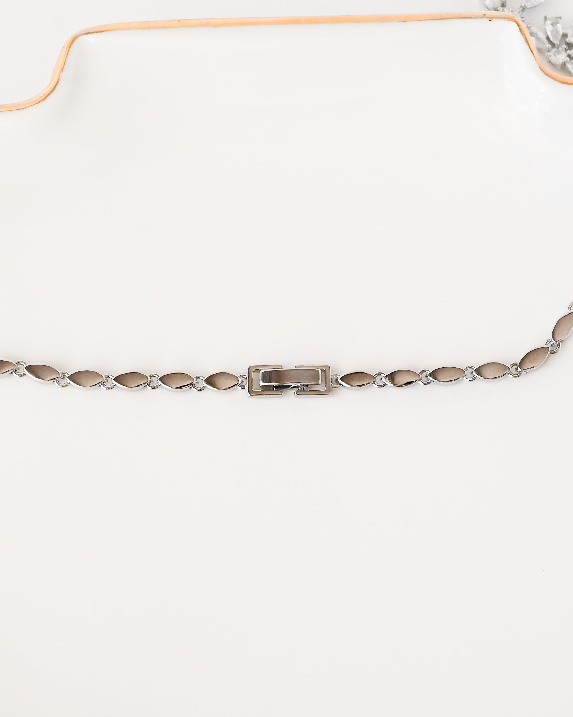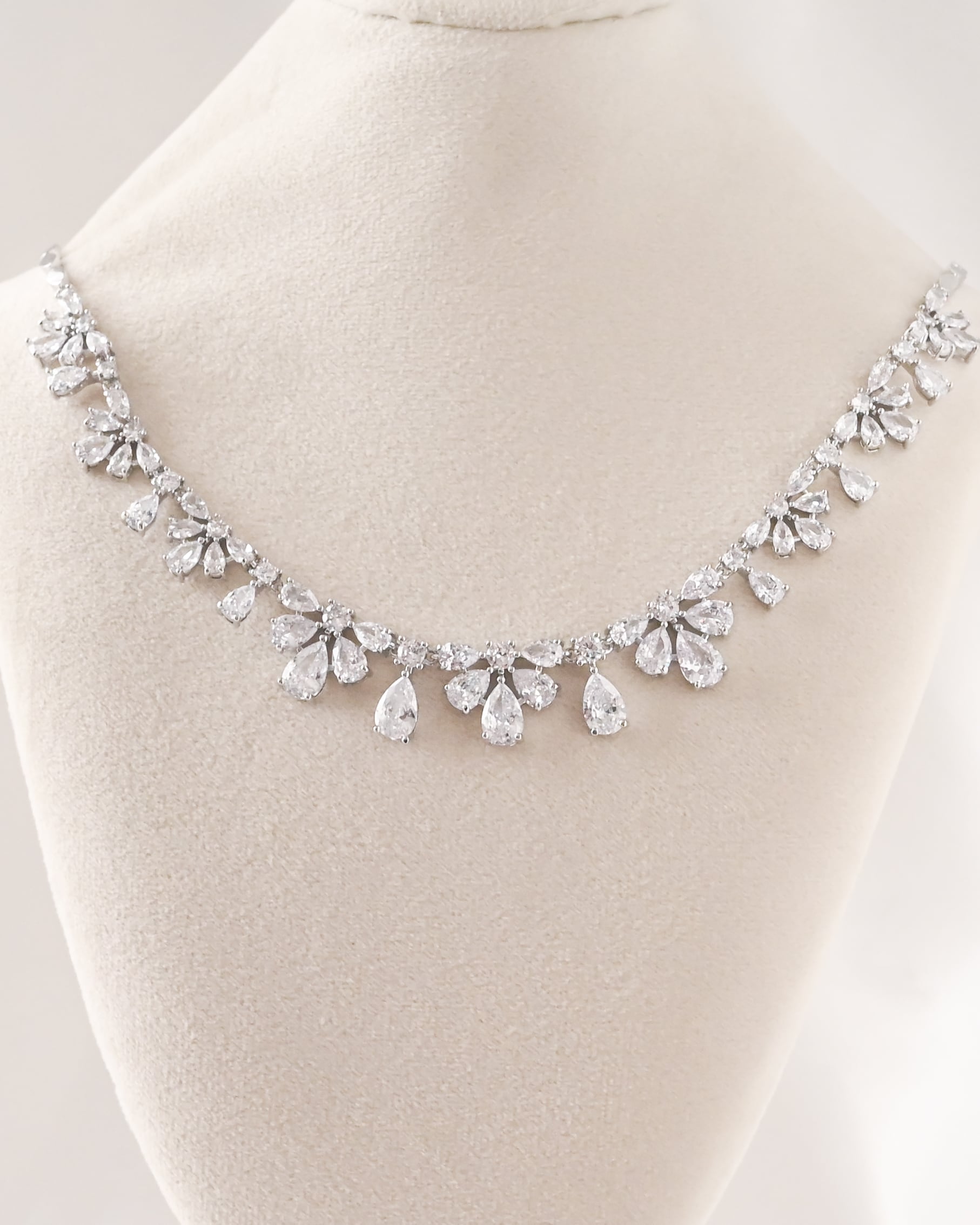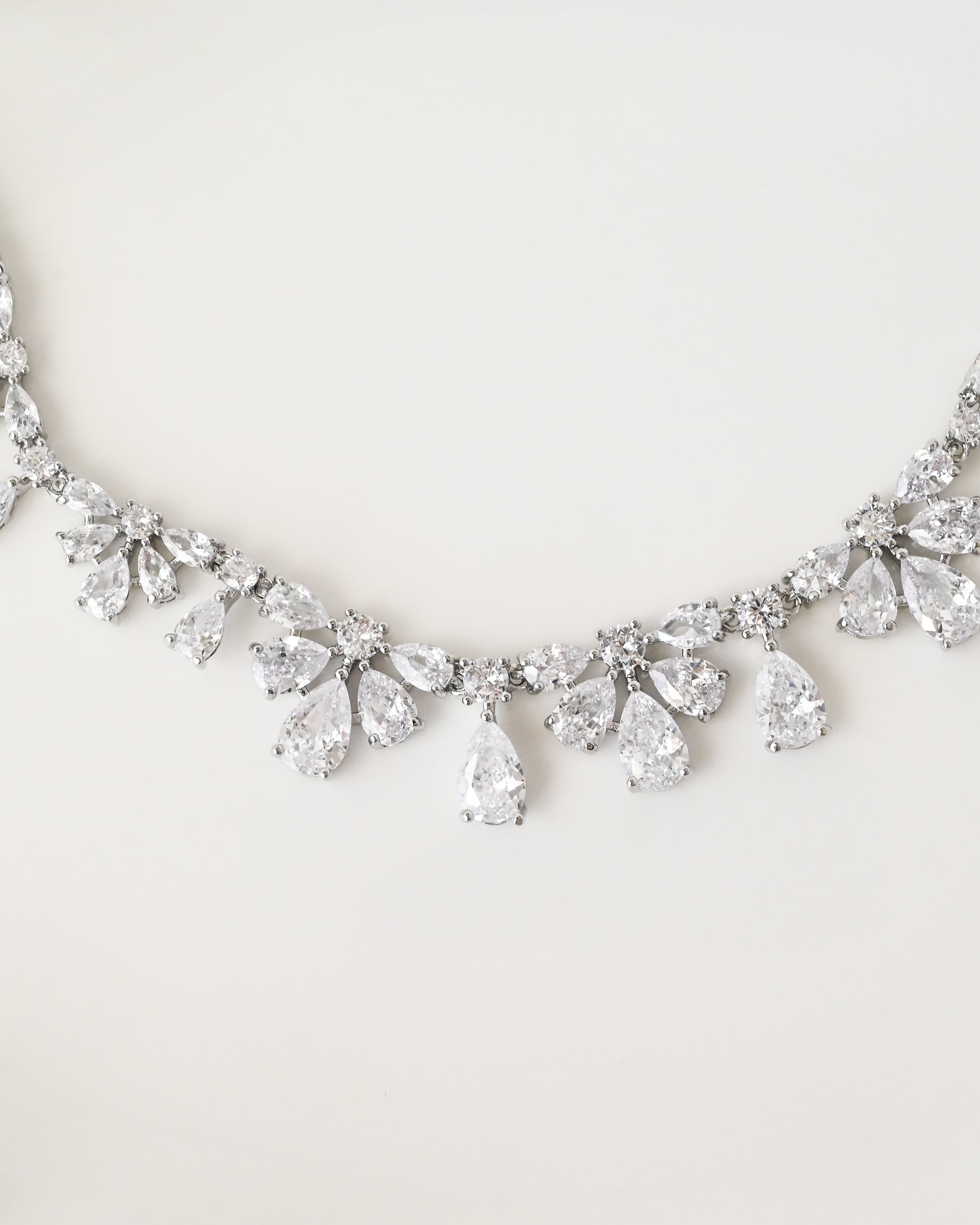 小さなビジューが連なるラインに、花のように広がるビジューモチーフとティアドロップ型のストーンをあしらい、デコルテを華やかに彩ります。