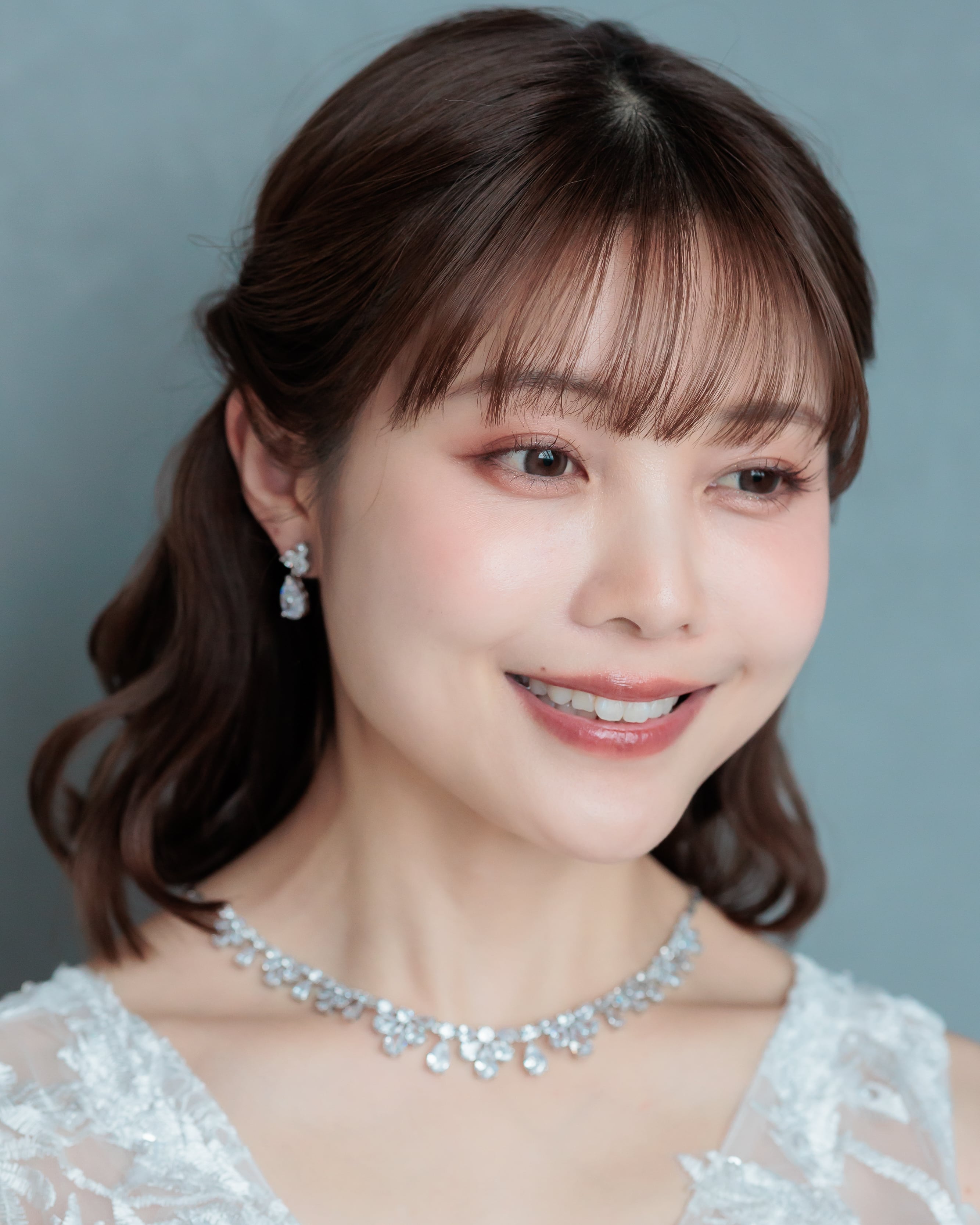 中央から下がるドロップビジューが動くたびにやさしくきらめき、花嫁の首元を上品で華やかな印象に。