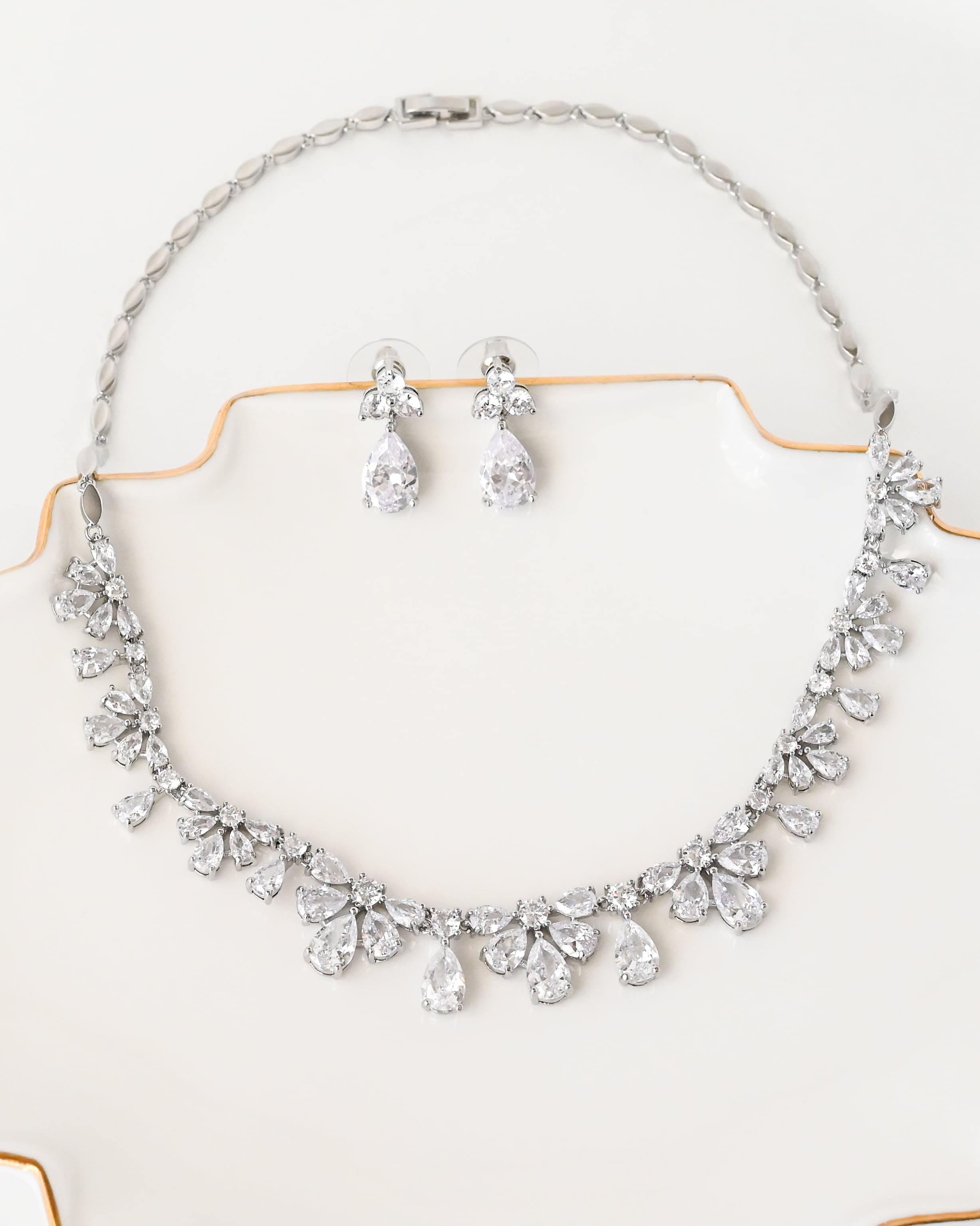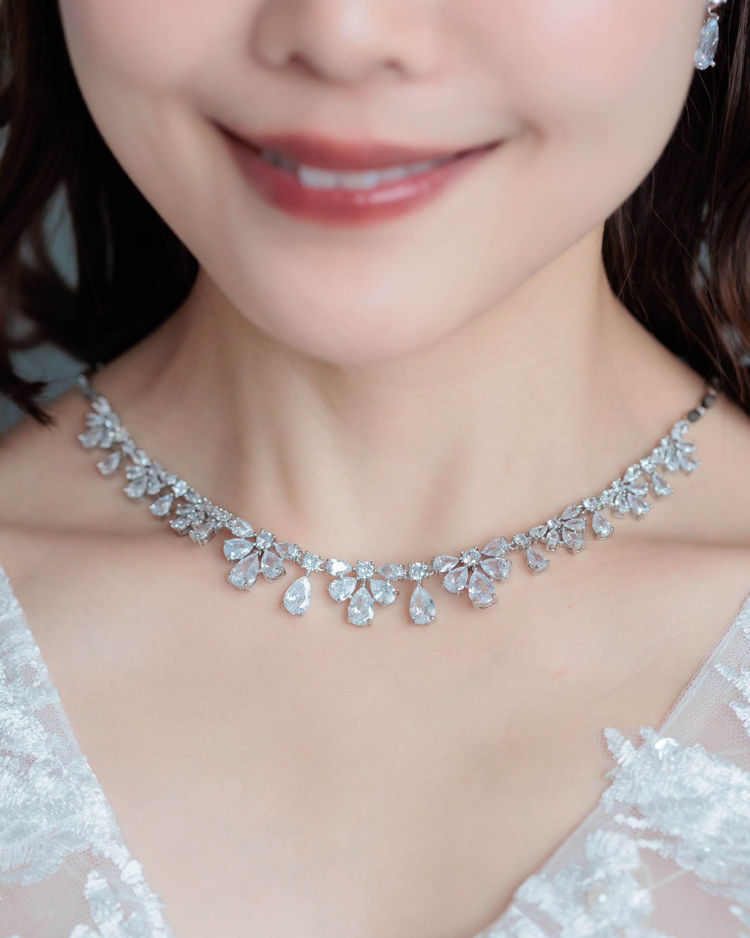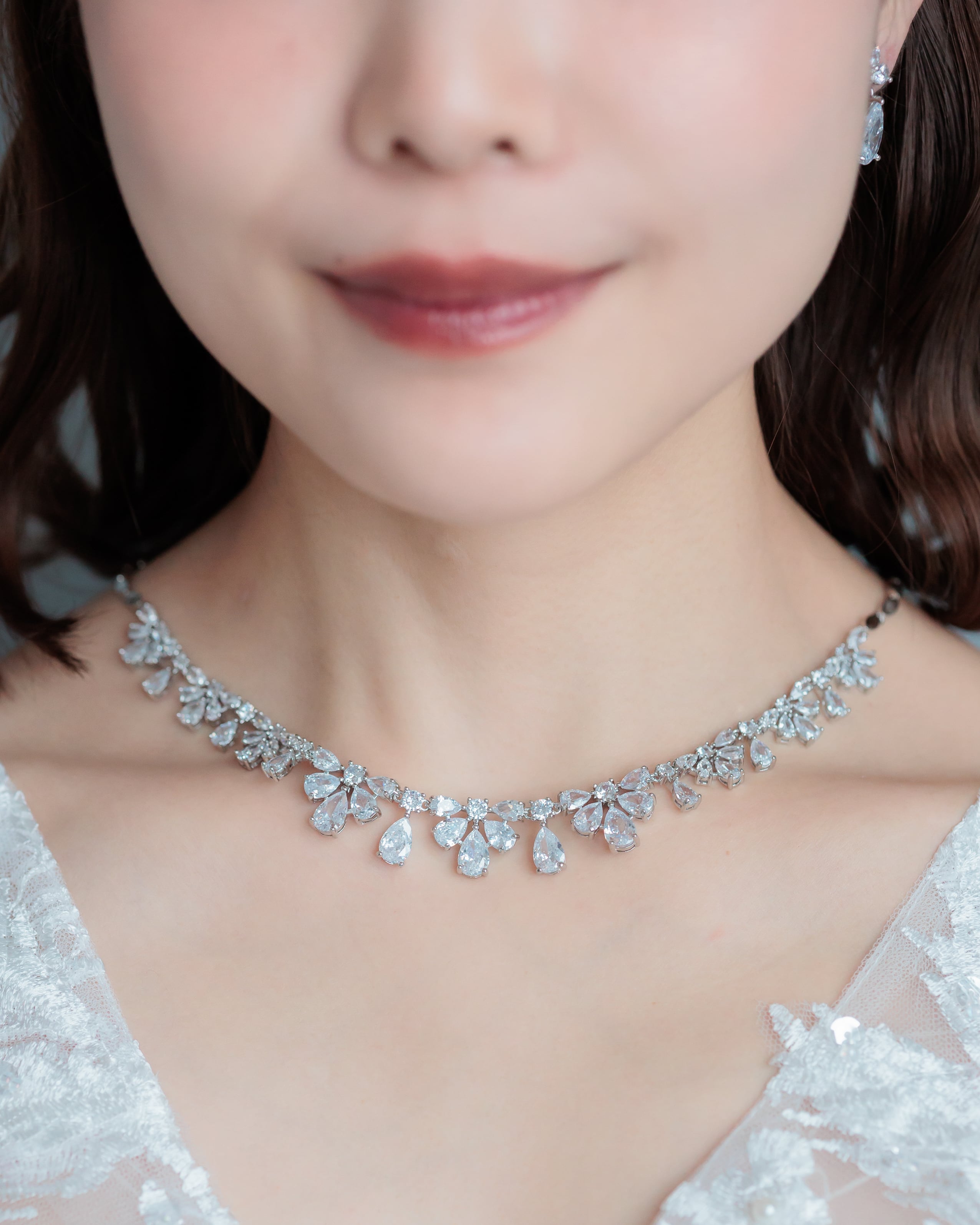 繊細なフラワーモチーフと揺れるドロップビジューが美しく輝くブライダルネックレス&ピアスセット。