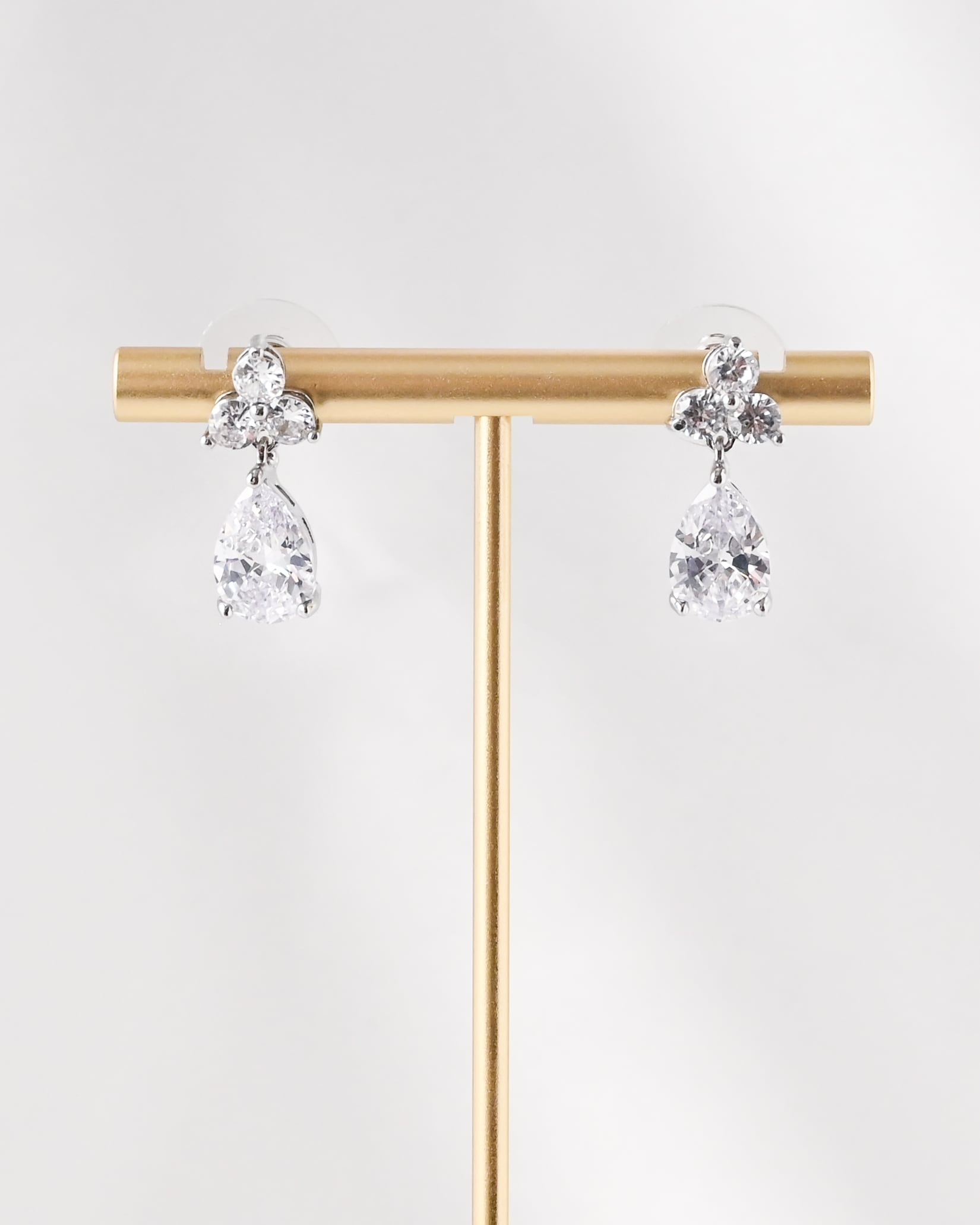 ピアスはネックレスと同じフラワーモチーフにドロップビジューを合わせたデザインで、耳元にさりげない輝きを添えます。