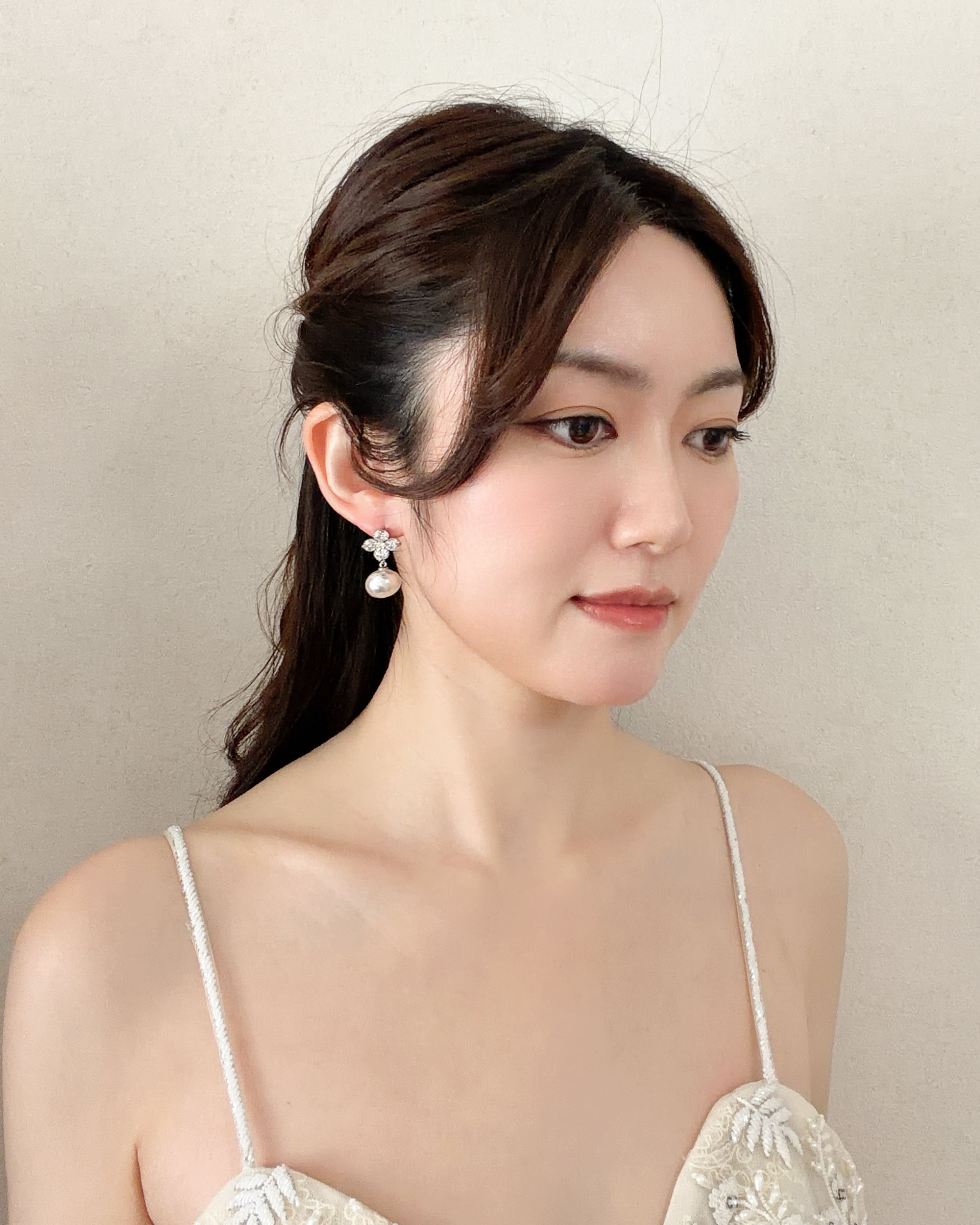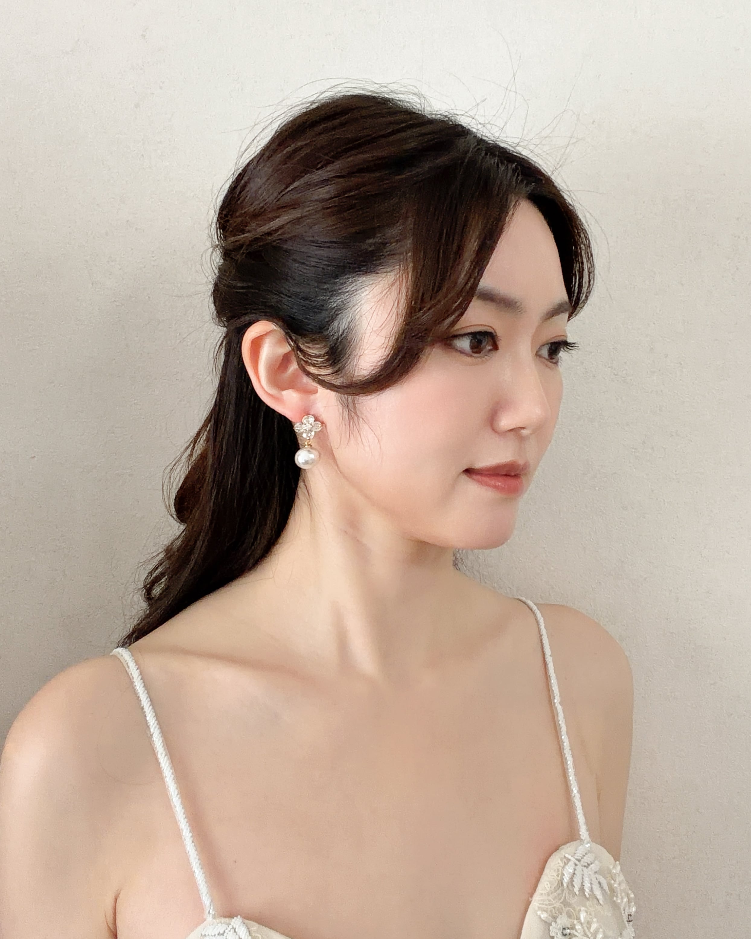 動くたびにきらめくビジューとやわらかなパールの輝きが、顔まわりを美しく引き立ててくれます。