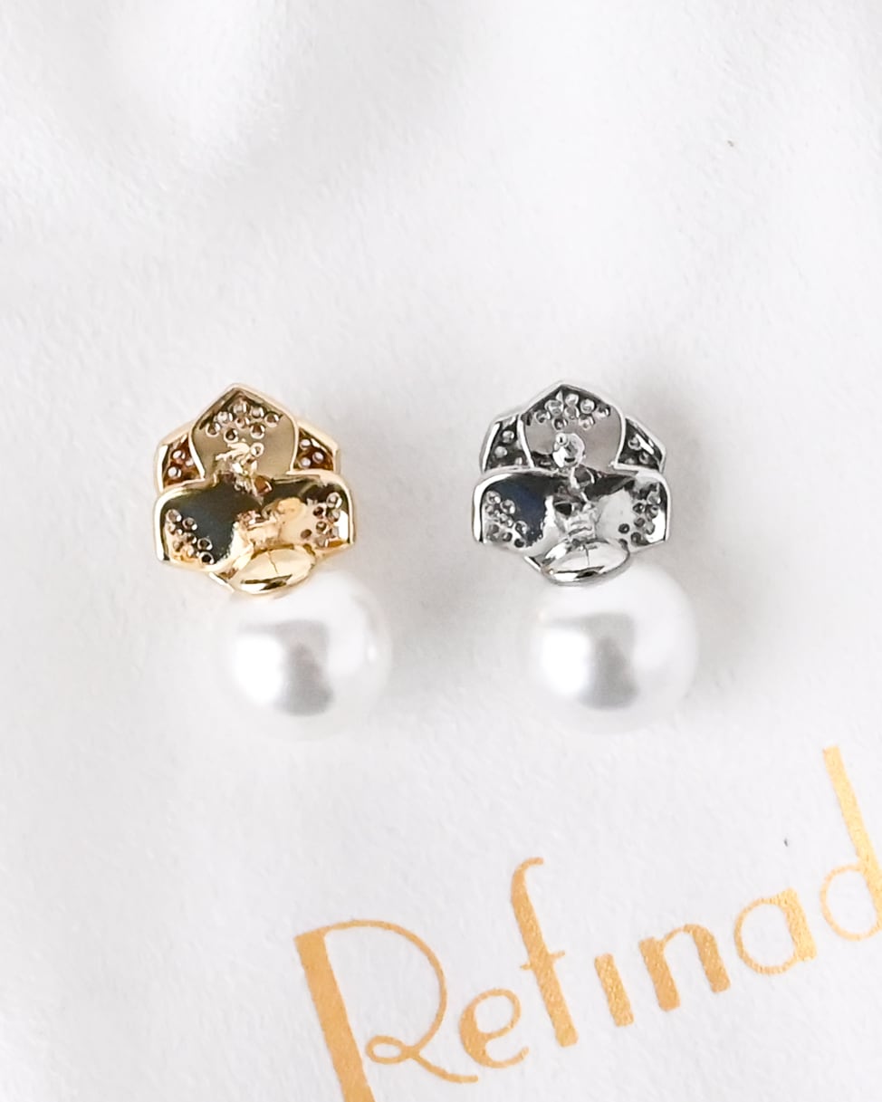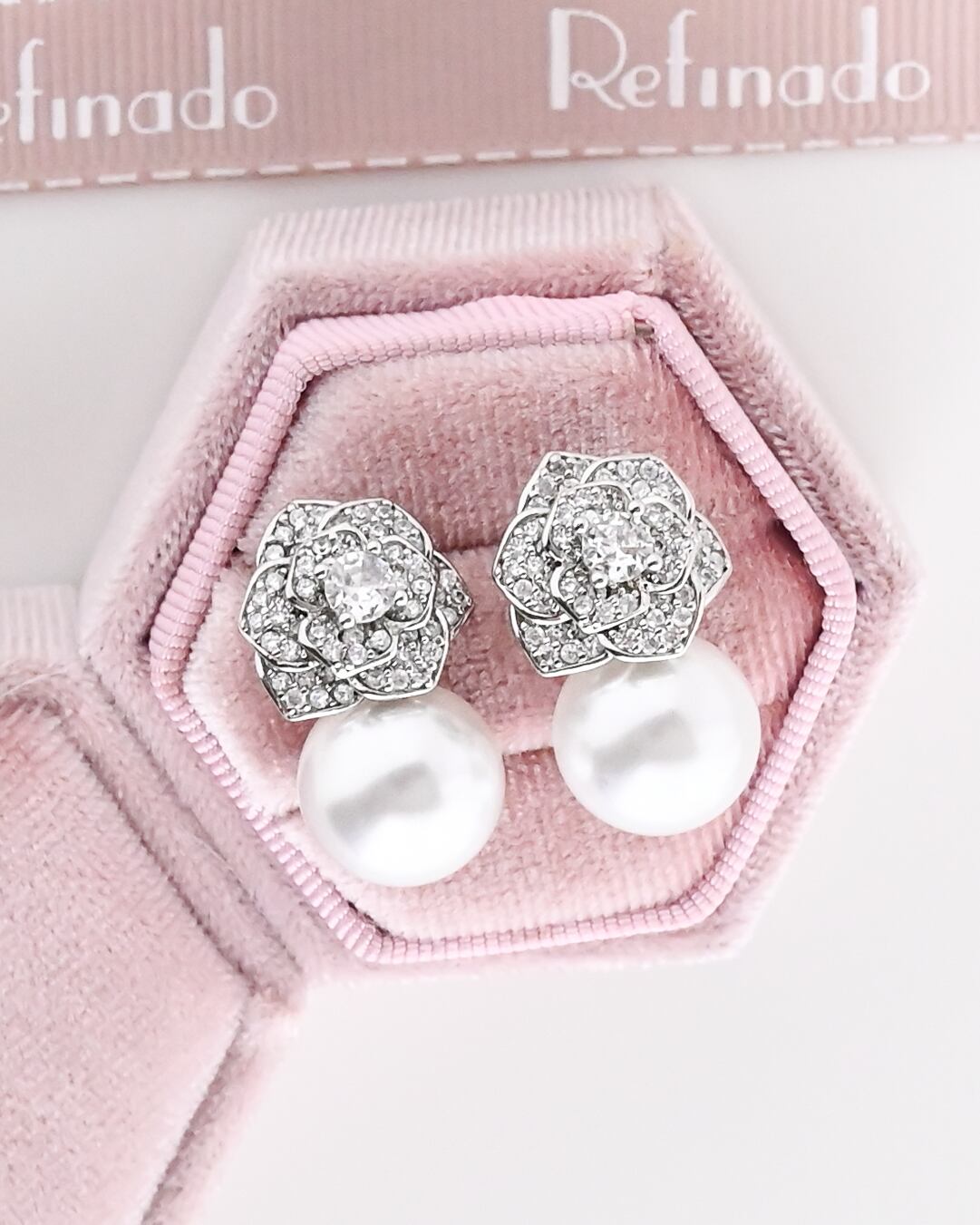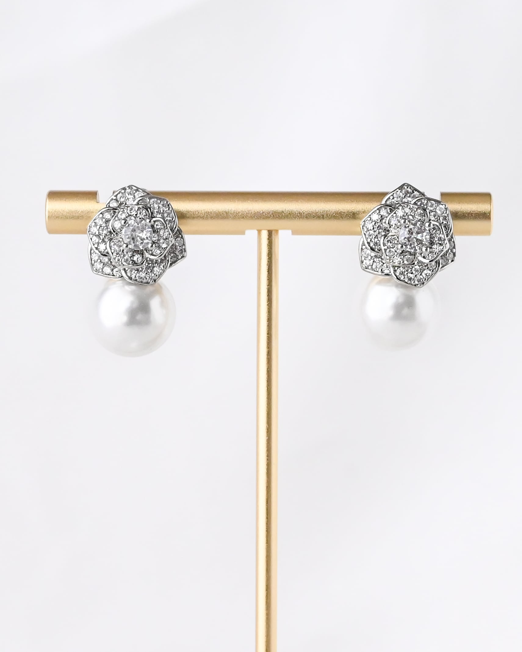 繊細なビジューを重ねた、立体感のあるカメリアモチーフに上品なパールを添えたピアス。