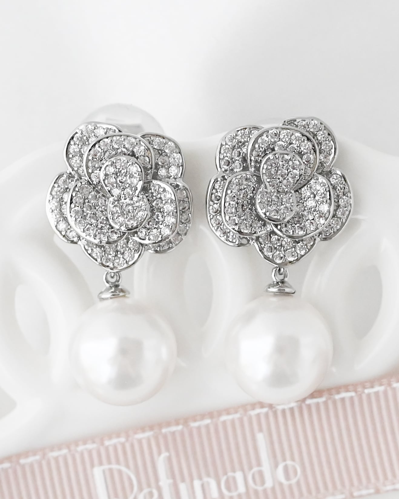 カメリアモチーフにパールをあしらったブライダルイヤリング。